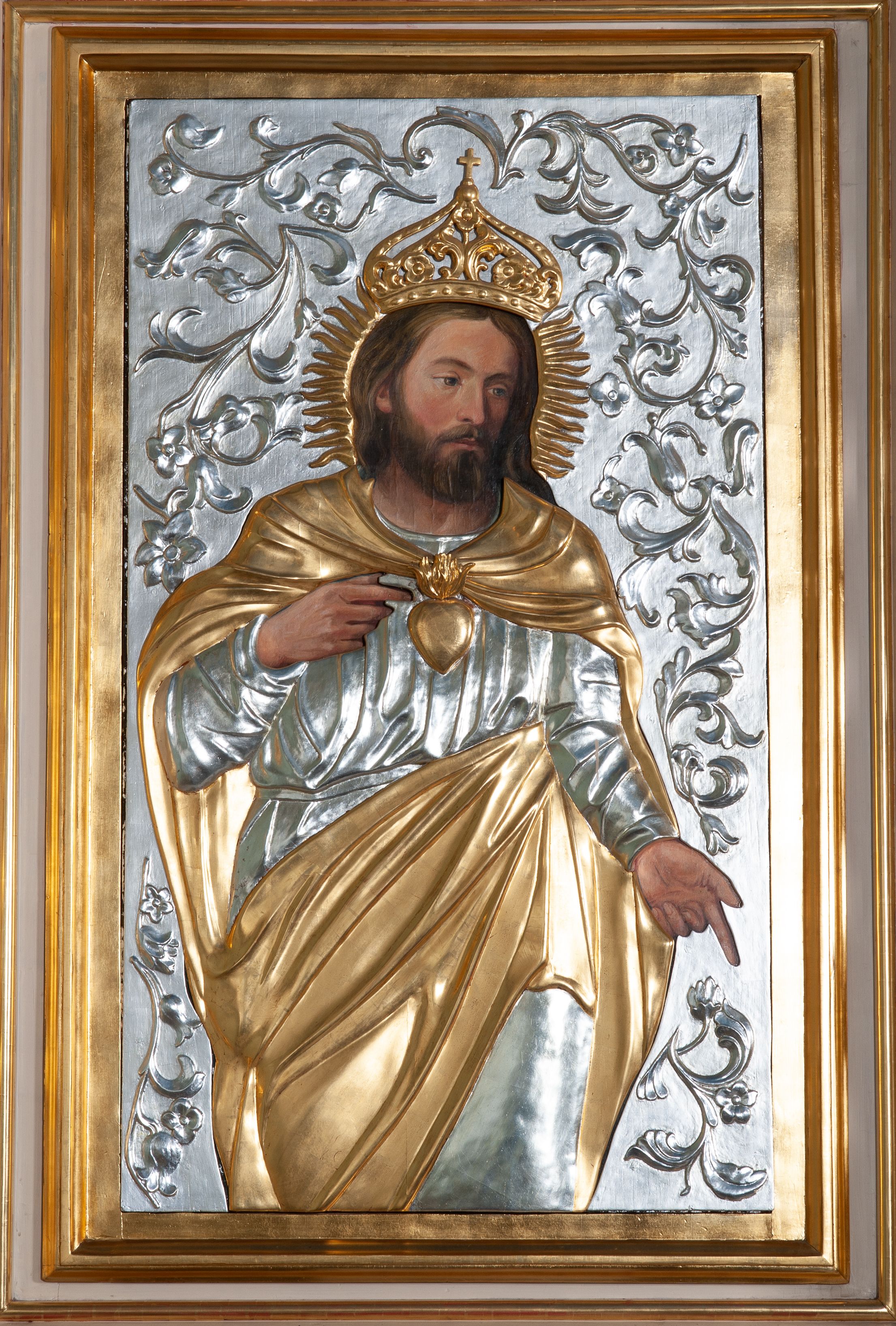 Obraz w kształcie stojącego prostokąta z przedstawieniem Najświętszego Serca Jezusa. W centrum kompozycji Chrystus w ujęciu do kolan. Prawą ręką wskazuje na gorejące serce umieszczone na jego piersi, lewą ma opuszczoną, głowę zwraca w lewo, patrzy w dół. Ma owalną twarz o smutnym wyrazie, brązowe oczy, wąski nos i niewielkie usta, na policzkach delikatny rumieniec. Długie, brązowe włosy spływają mu na plecy, twarz okala broda i wąsy. Partie malowane charakteryzuje delikatny światłocień. Szaty zakrywa aplikowana, srebrzona sukienka przewiązana w pasie oraz złoty płaszcz spięty na dekolcie i przechodzący przez lewe biodro. Wokół głowy promienie nimbu, na głowie złota, zamknięta korona. Tło zakrywa srebrna, nałożona dekoracja wypełniona wicią z kwitnącymi kwiatami.