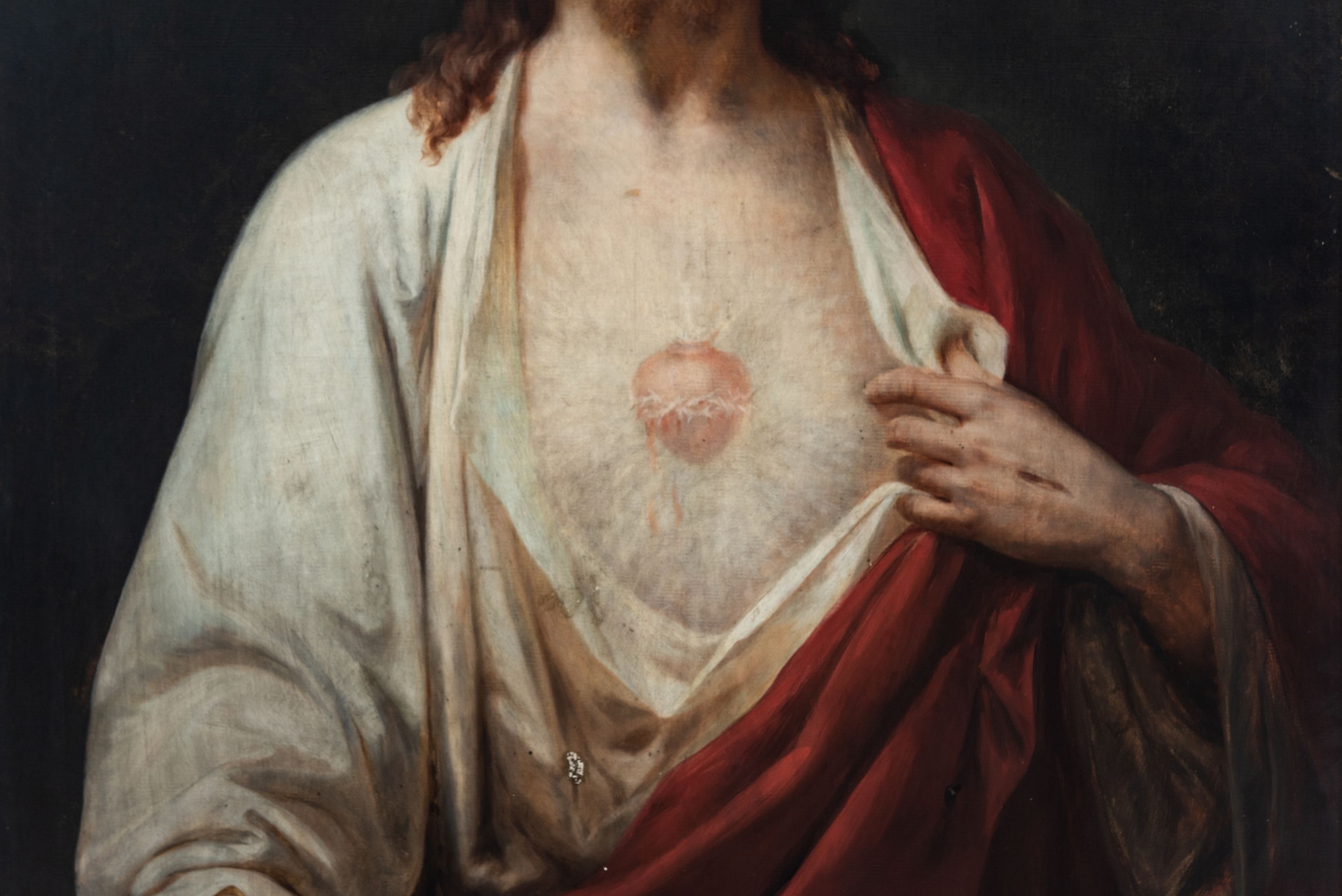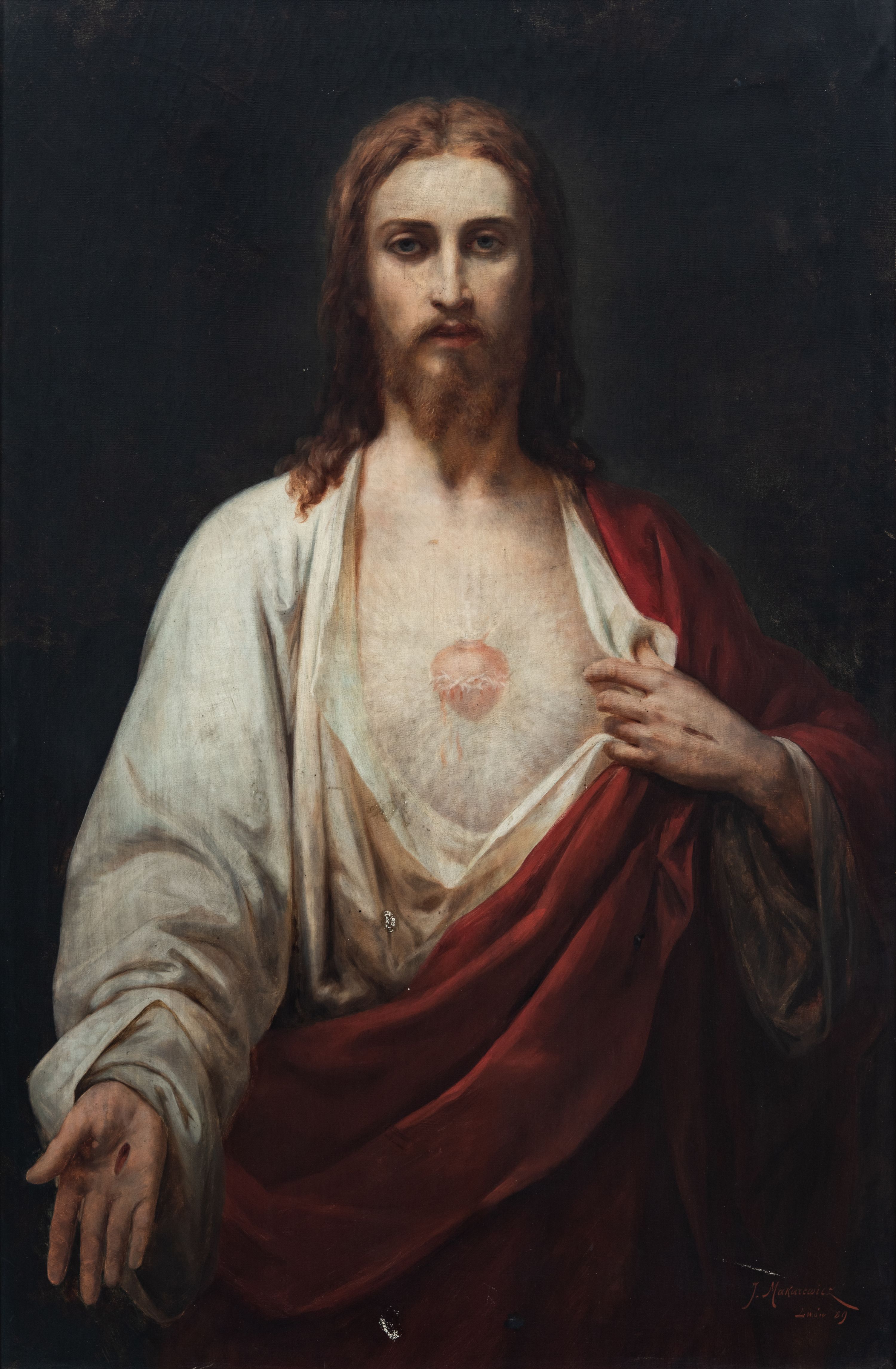 Obraz w formie stojącego prostokąta. W centrum Chrystus ukazany w półpostaci, frontalnie, lewą ręką odsłania pierś, prawą, opuszczoną, wyciąga do przodu ukazując ranę w dłoni. Twarz ma podłużną, o dużych, migdałowatych oczach, prostym, długim nosie i pełnych ustach, okoloną jasną, krotką brodą oraz jasnobrązowymi włosami, opadającymi na ramiona. Ubrany jest w luźną, białą tunikę odsłaniającą tors oraz czerwony płaszcz zawieszony diagonalnie przez lewe ramię. Na tle piersi ukazane gorejące serce w glorii promienistej. Chrystus ukazany na zielono-granatowym tle. W prawym dolnym rogu sygnatura: „J. Makarewicz / Lwów 89”. Dzieło ujęte szeroką, złoconą ramą dekorowaną motywem palmet.