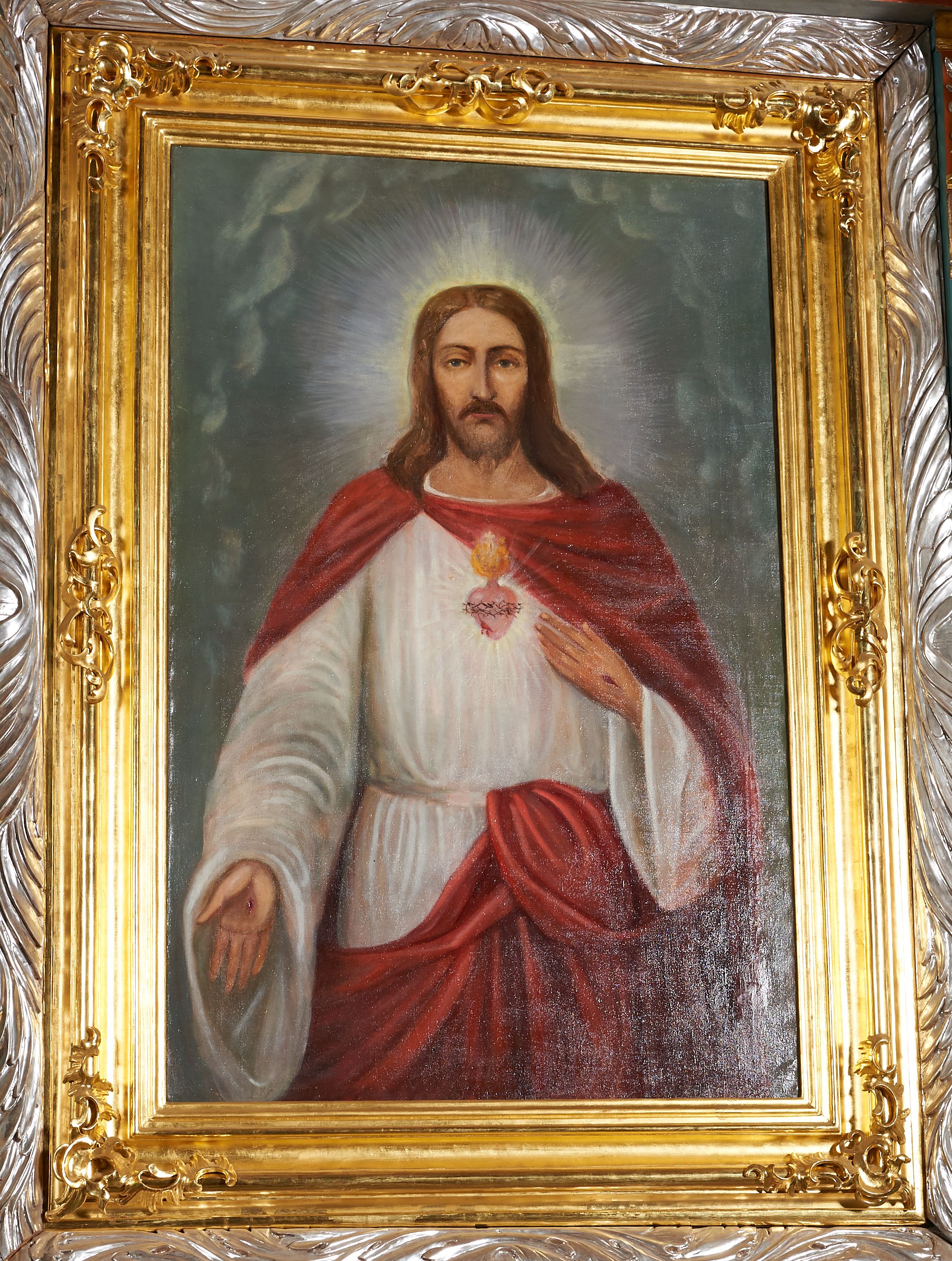 Obraz w kształcie stojącego prostokąta przedstawiający Chrystusa na tle jasnoszarych obłoków. Chrystus przedstawiony w ujęciu do kolan, stojący frontalnie, z prawą ręką opuszczoną, lekko odwiedzioną od tułowia i wyciągniętą do przodu. Lewą dłonią, spoczywającą na piersi, wskazuje na gorejące serce. Twarz Chrystusa pociągła, o jasnej karnacji, okolona krótkim zarostem i długimi włosami opadającymi na ramiona. Rysy twarzy wyraziste, oczy lekko przymknięte, nos szeroki, długi, usta niewielkie. Ubrany w białą suknię z długimi, szerokimi rękawami oraz czerwony płaszcz spięty na prawym ramieniu, z połami założonymi za szarfę wokół pasa. Z tyłu głowy świetlisty nimb krzyżowy.