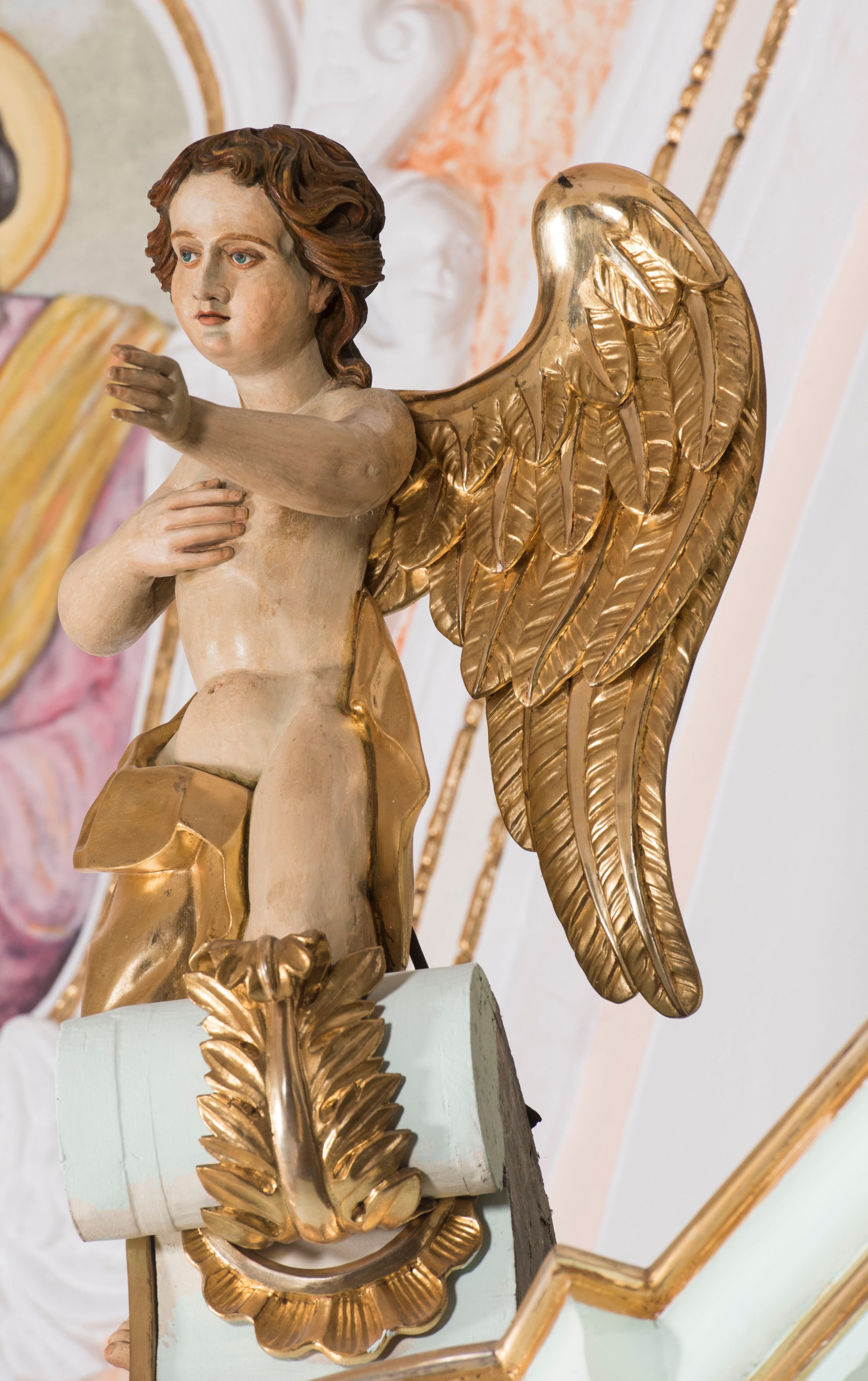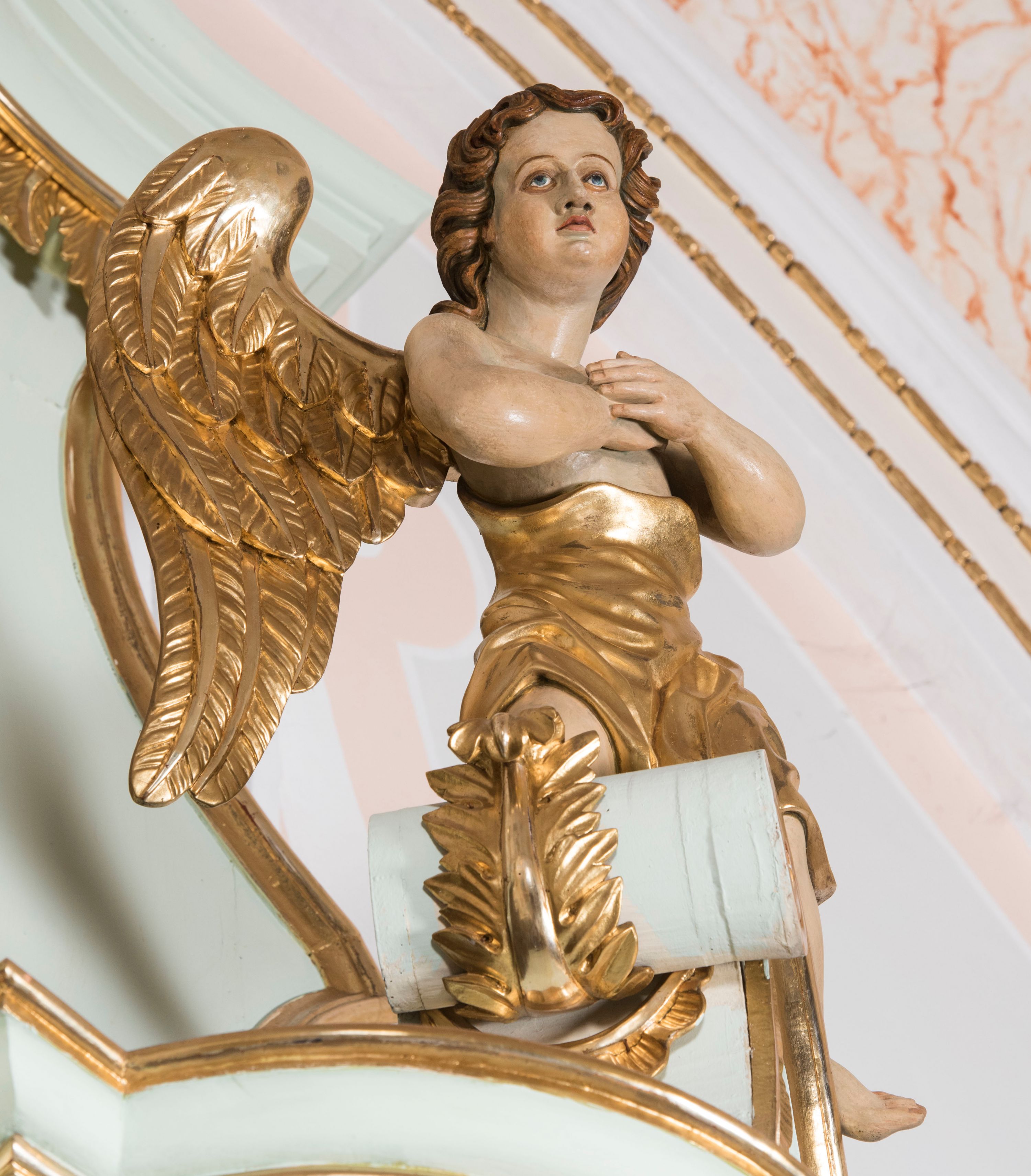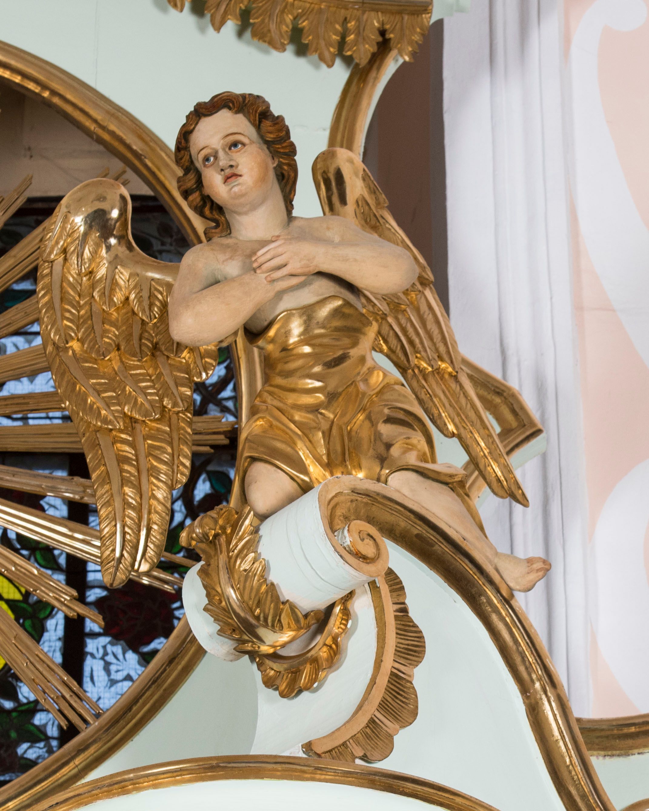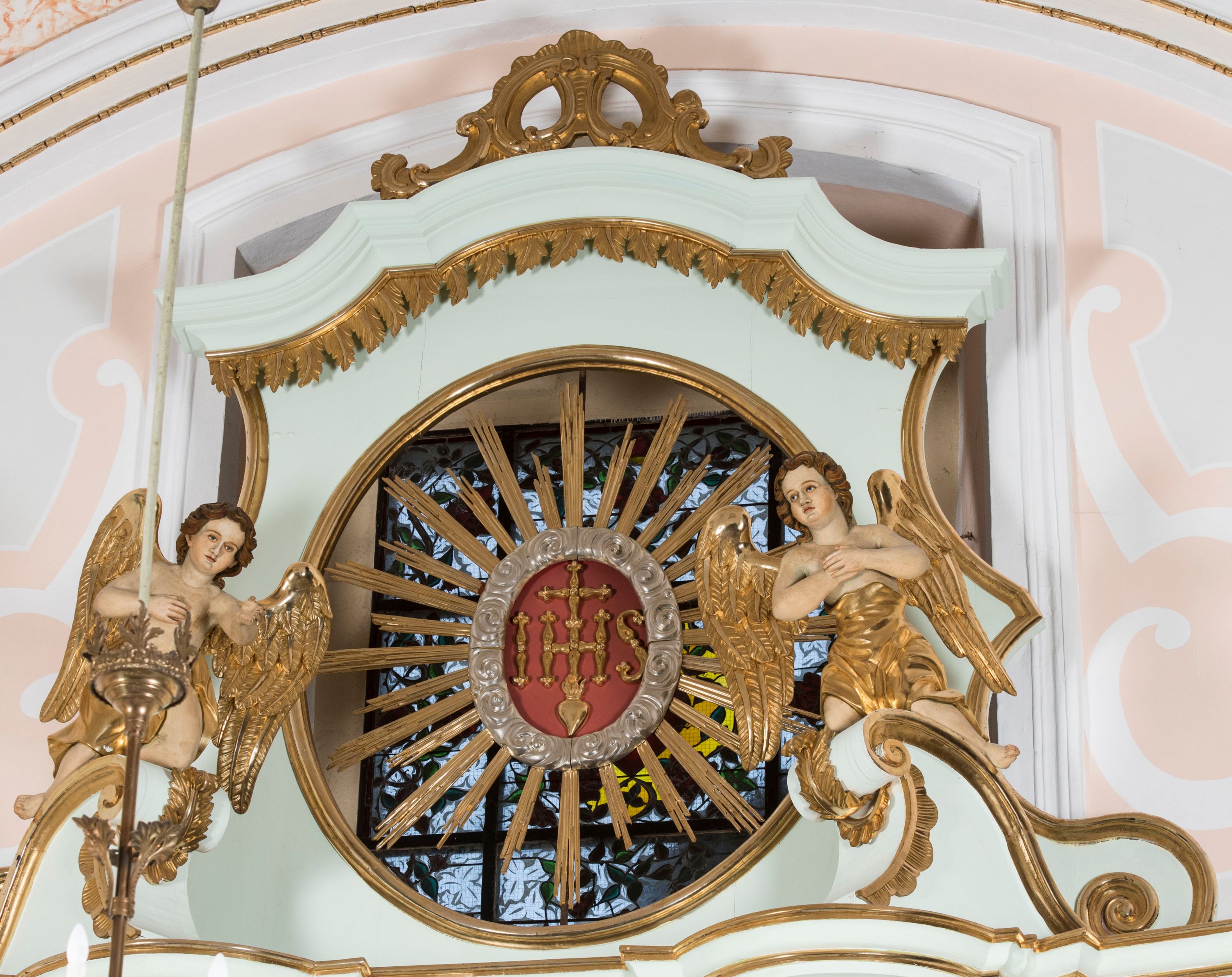 Struktura retabulum utrzymana jest w pastelowym odcieniu turkusu z akcentem ciemnej czerwieni, partie detalu architektonicznego i ornamentyka są złocone i srebrzone.