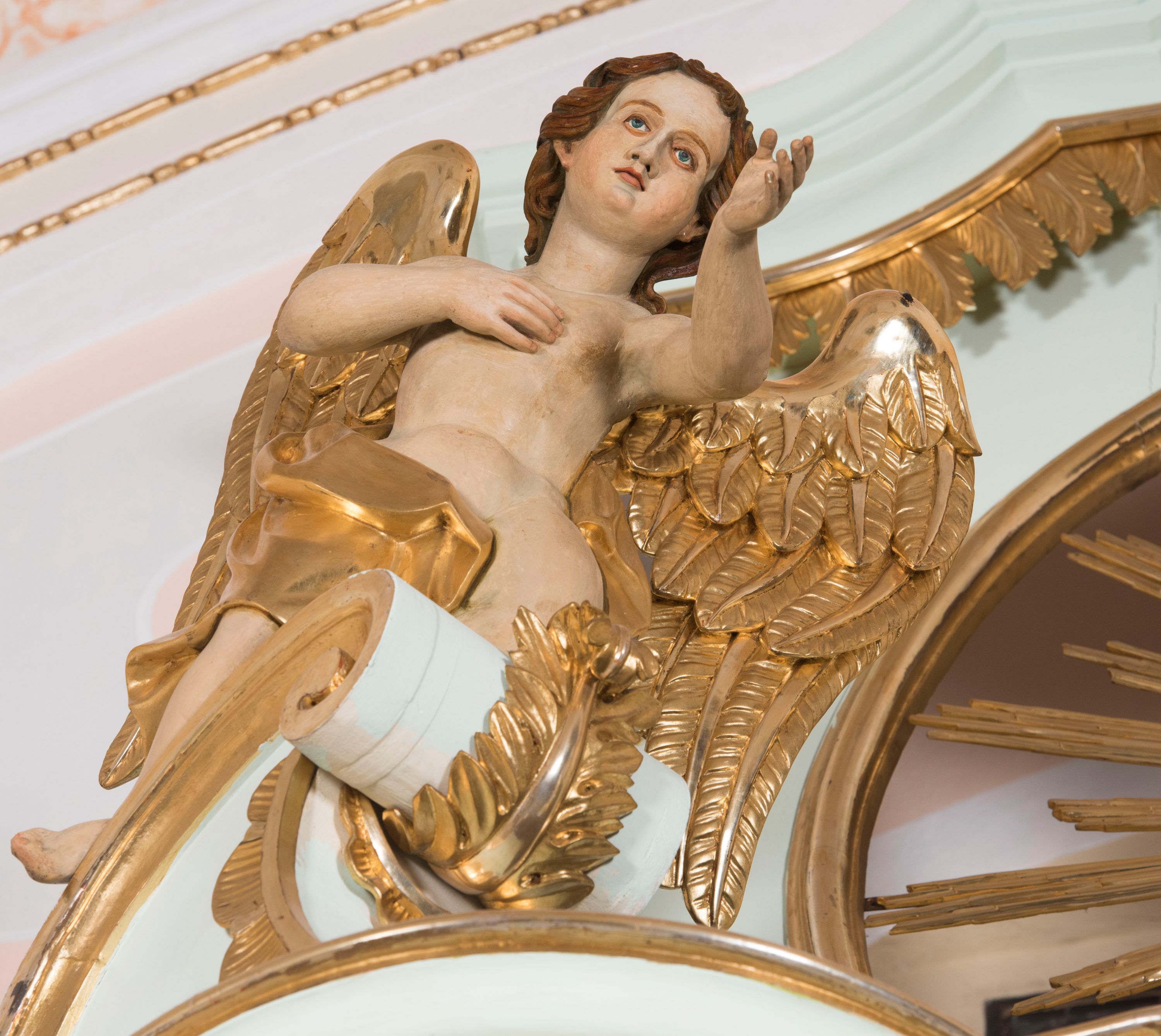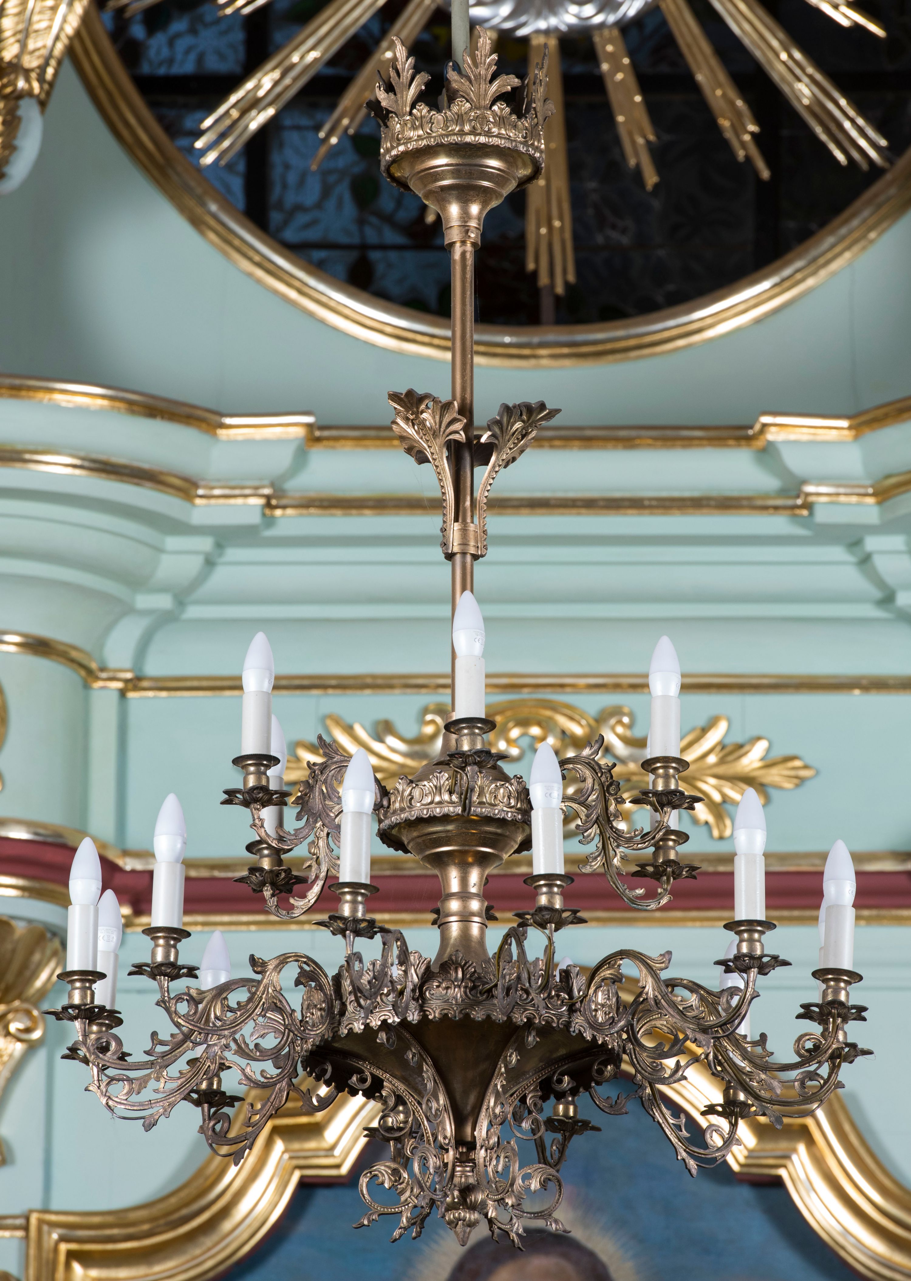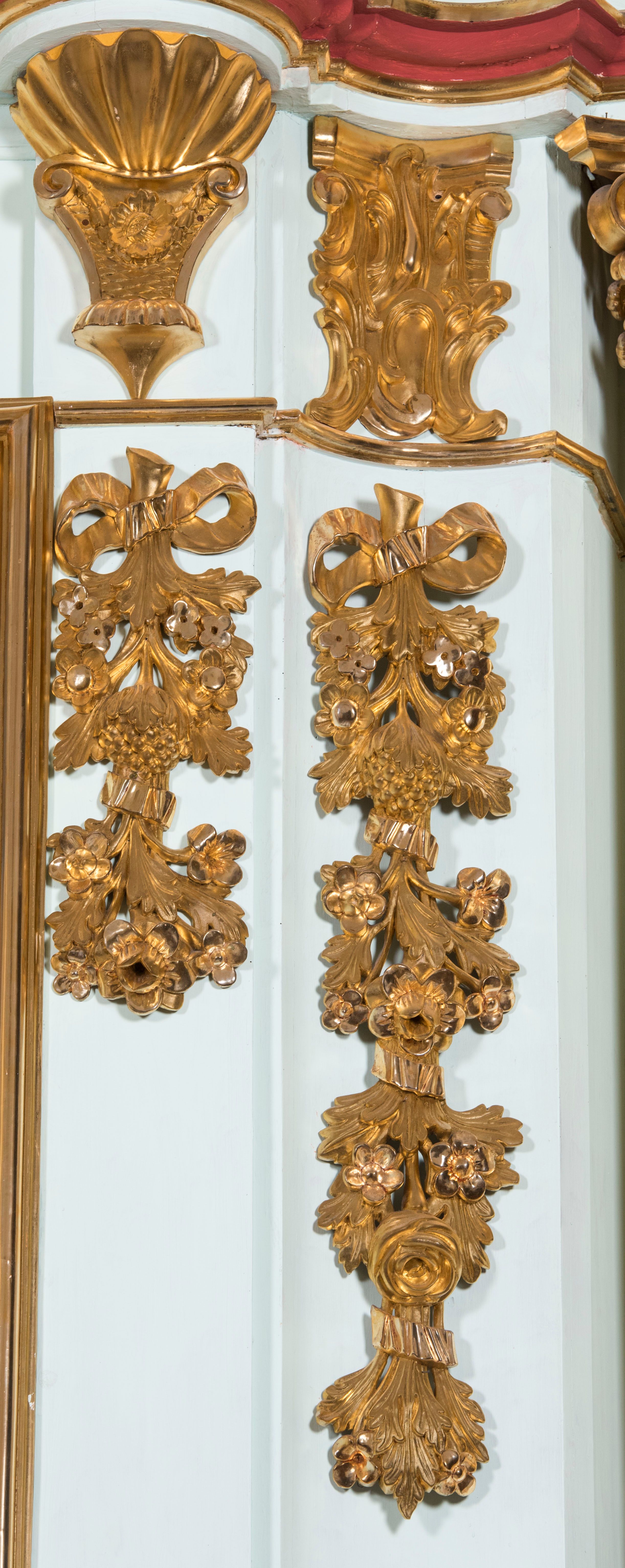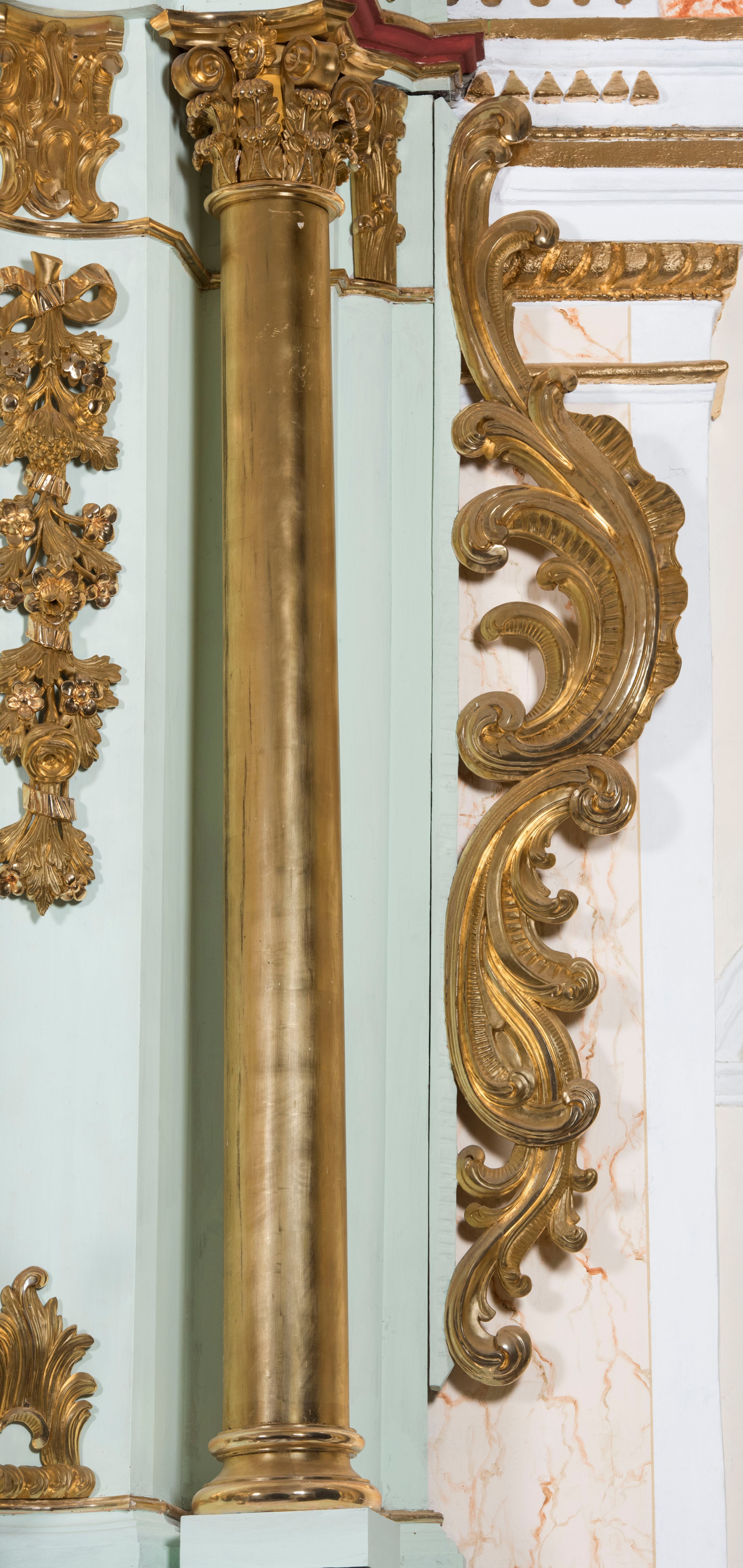 Struktura retabulum utrzymana jest w pastelowym odcieniu turkusu z akcentem ciemnej czerwieni, partie detalu architektonicznego i ornamentyka są złocone i srebrzone.