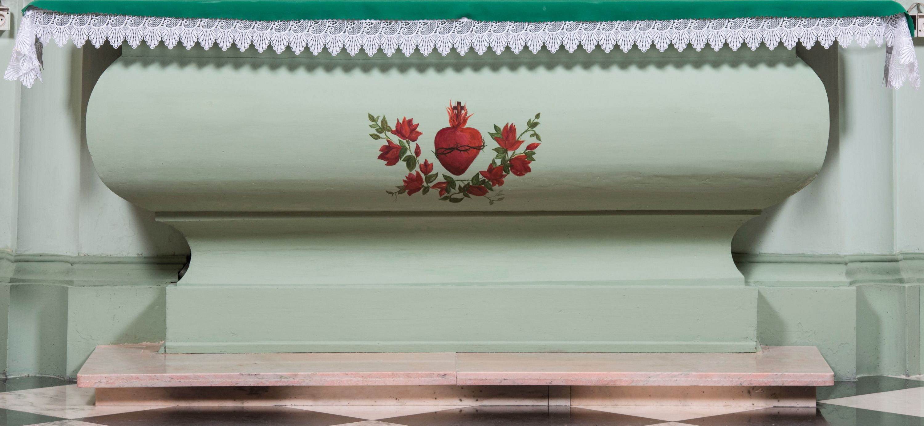 Retabulum ołtarza bocznego charakteryzuje architektoniczna, jednokondygnacyjna, jednoosiowa struktura ze zwieńczeniem. Ołtarz jest drewniany, sarkofagowy z drewnianą mensą. Retabulum osadzone jest na zdwojonym cokole. Część środkowa nastawy ujęta jest parą kolumn i dwoma parami pilastrów, z których jedna ma wklęsłe trzony. Wspomniane elementy wspierają wyłamujące się ponad nimi wklęsło-wypukłe belkowanie. Pole środkowe retabulum jest w kształcie stojącego prostokąta zamkniętego półkolistym łukiem nadwieszonym z uskokami, ujęte jest profilowaną, złoconą ramą. Zwieńczenie, w kształcie stojącego prostokąta zamknięte jest gzymsem w formie nadwieszonego łuku z uskokami. Pole środkowe stanowi owalny prześwit ujęty profilowaną, złoconą ramą. Po bokach zwieńczenia usytuowany jest przerwany, skośnie ustawiony wolutowy przyczółek. Po środku antepedium znajduje się polichromowane gorejące serce Jezusa ujęte gałązkami czerwonej róży. Pola cokołów zdobi ornamentyka rocaille’owo-akantowa. Część środkową retabulum ujmuje para ażurowych uszaków z liści akantu z motywami kogucich grzebieni. Trzony wklęsłych pilastrów w dolnej partii zdobią motywy wolut zwieńczonych liśćmi akantu. W górnej partii trzonów wszystkich pilastrów znajdują się podwieszenia w formie związanych wstążkami kompozycji kwiatowo-owocowych. Kapitele zdobione są detalami ze stylizowanych liści akantu oraz niewielkimi konsolkami z motywem palmety. Fryz dekorują motywy ornamentyki rocaille’owej. Krawędź gzymsu zwieńczenia ujęta jest rodzajem lambrekinu z pojedynczych liści o lancetowatym kształcie. W prześwit wkomponowana została promienista gloria z monogramem Jezusa pośrodku, na ciemnoczerwonym tle, ujęta wieńcem srebrzonych obłoków. W polu części środkowej retabulum znajduje się obraz Najświętsze Serce Jezusa, dodatkowo po bokach, na półkoliście wysuniętych partiach cokołu retabulum usytuowana jest para niewielkich rzeźb św. Rocha i św. Grzegorza Wielkiego. Na przerwanym przyczółku znajduje się para figur aniołów.
