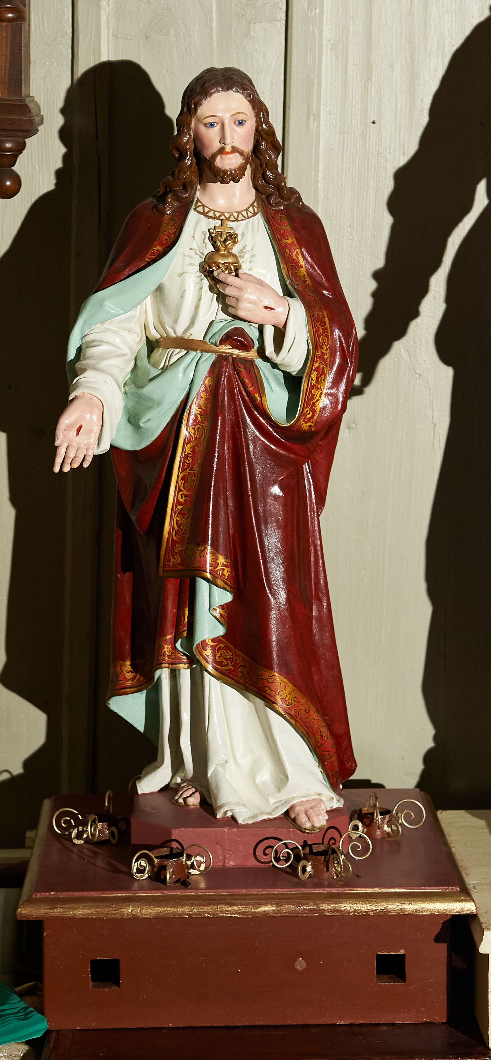 Rzeźba pełnoplastyczna na prostopadłościennej podstawie z otworami na drążki, przedstawiająca Chrystusa stojącego frontalnie w kontrapoście. Prawą ręką dotyka unoszącego się przed jego piersią gorejącego serca ujętego koroną cierniową i zwieńczonego krzyżem. Lewą rękę wyciąga przed siebie prezentując ranę. Głowa lekko przechylona, wzrok skierowany przed siebie, oczy jasne, nos prosty, usta niewielkie, czerwone. Na twarzy krótki brązowy zarost, falowane włosy opadają na ramiona i plecy. Chrystus jest ubrany w białą suknię z długimi rękawami, przewiązaną w pasie złotym sznurem, za który ma zatknięty czerwony płaszcz z jasnozielonym podszyciem i pasem złotego ornamentu przy brzegu okrywający ramiona i nogi. Polichromia w partiach ciała naturalistyczna. Rzeźba stoi na bordowym cokole umocowanym na ciemnobrązowej podstawie.