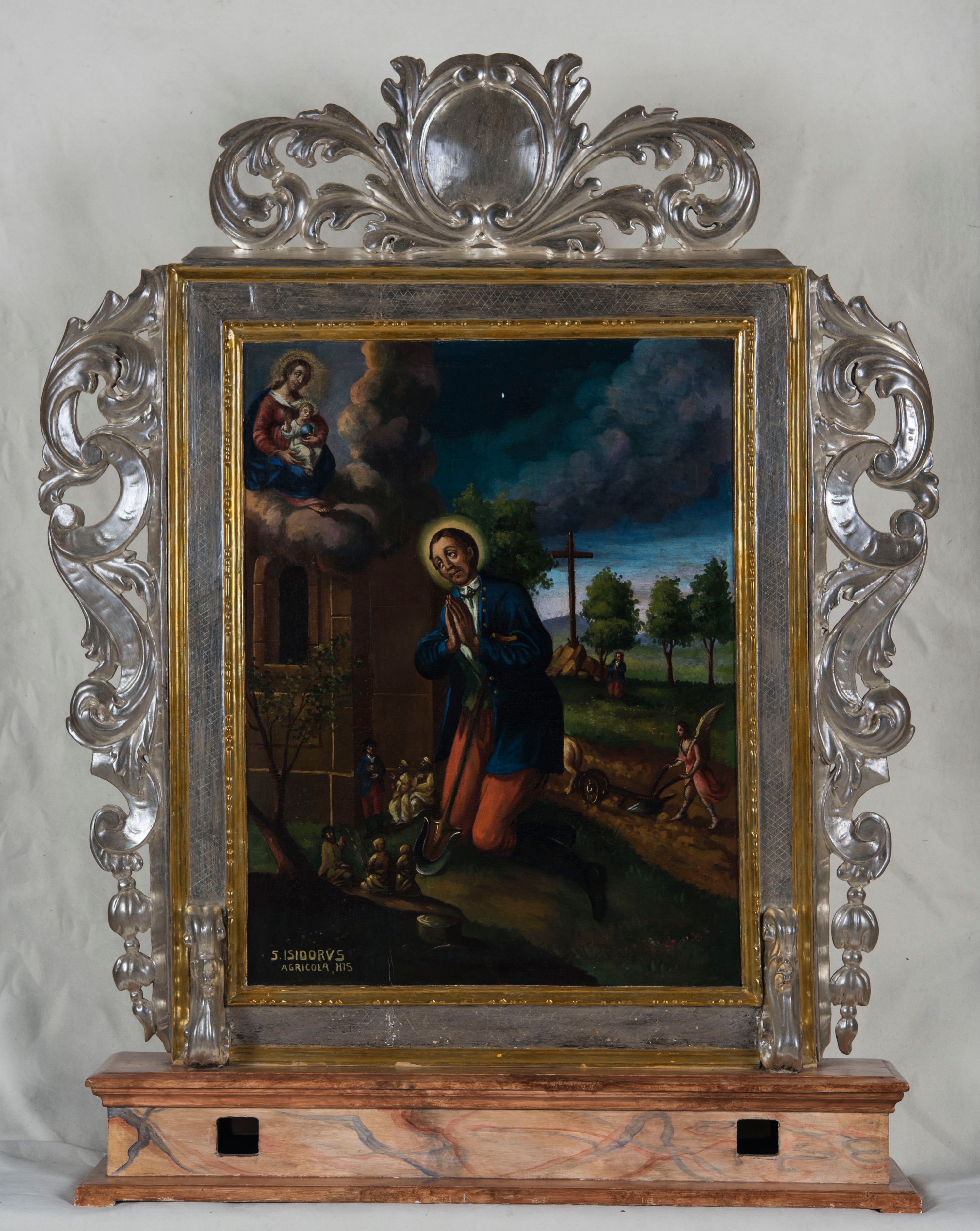 Feretron procesyjny tworzą dwa malowane na płótnie olejne obrazy ujęte w srebrzone ramy, których krawędzie wyznaczają profilowane i złocone listwy, ustawione na prostopadłościennym postumencie. Po bokach ram znajdują się ażurowe, srebrzone uszaki powstałe ze stylizowanych wici akantowych. Zwieńczenie feretronu utworzono z owalnego kartusza otoczonego ażurową, srebrzoną stylizowaną wicią akantową. Na awersie feretronu umieszczono przedstawienie Najświętszego Serca Pana Jezusa, a na rewersie św. Izydora. Postument został zaopatrzony w parę otworów do włożenia drążków umożliwiających noszenie feretronu. Podstawę i zwieńczenie postumentu dekoruje profilowana listwa, natomiast boki jasna brązowo-ochrowa marmoryzacja. Na awersie feretronu wyobrażono w trzech czwartych stojącego Chrystusa ukazującego swoje serce. Zbawiciel ma lekko pochyloną głowę w prawo, obiema zaś przebitymi dłońmi rozsuwa tunikę na piersi, odsłaniając przebite serce. Serce otaczają złociste promienie. Z rany oraz u góry serca widać wydobywające się płomienie. Twarz Chrystusa jest pociągła. Otaczają ją długie brązowe włosy opadające puklami na ramiona oraz brązowa broda na dole nieznacznie rozdwojona. Twarz Zbawiciela charakteryzuje się wysokim czołem, długim, wąskim nosem i wydatnymi ustami. Chrystus szeroko otwartymi niebieskimi oczami wpatruje się w widza. Jego głowę otaczają złociste promienie. Ubrany jest w luźną, czerwoną tunikę przewiązaną w pasie jasnoochrową szarfą i narzucony na ramiona niebieski płaszcz, którego prawa poła przerzucona jest przez prawe przedramię. Zbawiciel został ukazany na jasnoochrowym tle. Po obu stronach jego głowy na jasnych obłokach widać dwie główki uskrzydlonych aniołków. Mają okrągłe głowy o pucołowatych policzkach z wydatnymi noskami i ustami. Unoszą się na niebieskich skrzydełkach. Na rewersie feretronu umieszczono przedstawienie św. Izydora. Święty został ukazany podczas modlitwy na pierwszym planie, klęcząc przed fragmentem bryły kościoła z półokrągłym oknem o mocno wyartykułowanym glifie. Górną część świątyni okrywają obłoki, z których wyłania się Madonna z Dzieciątkiem. Izydor ukazany został w całej postaci zwrócony w trzech czwartych w prawo z modlitewnie złożonymi rękami na wysokości piersi. O lewe przedramię ma oparty drewniany rydel u dołu okuty metalem. Jego głowa otoczona świetlistym nimbem jest lekko pochylona w prawo. Ma owalną twarz o wyrazistych rysach z dużym nosem i mięsistymi wargami oraz smutnie patrzącymi oczami. Otaczają ją krótkie brązowe włosy odsłaniające lewe ucho oraz krótki zarost. Ubrany jest w białą koszulę z aksamitką pod szyją, zapiętą zieloną kamizelkę oraz rozpięty niebieski surdut z rzędem złotych guzików i czerwone spodnie. Na nogach ma brązowe buty z wysokimi cholewami. Przy jego kolanach pod niewielkim drzewkiem leży brązowy kapelusz z szerokim rondem. W lewym rogu obrazu wyobrażono siedzącą na obłokach Madonnę, ukazaną w trzech czwartych w prawo. Przed sobą obiema rękami trzyma na kolanach Dzieciątko. Maria ma owalną twarz o jasnej karnacji z wydatnym nosem i ustami. Jej głowę okoloną świetlistym nimbem otaczają długie brązowe włosy opadające na ramiona. Wokół wydekoltowanej szyi widać białą chustę skrzyżowaną na piersi. Madonna ubrana jest w czerwoną suknię przewiązaną w talii i niebieski płaszcz narzucony na ramiona, którego poły okrywają jej kolana. Mały Jezus przedstawiony jest w trzech czwartych w prawo. W lewej ręce trzyma błękitny glob, a prawą unosi w geście błogosławieństwa. Ma owalną twarz o jasnej karnacji z wydatnym nosem i ustami oraz wysokim czołem. Głowę okalają krótkie włosy i otacza świetlisty nimb. Zbawiciel ubrany jest w jasną tunikę odsłaniającą fragment stóp. Na drugim planie za modlącym się Izydorem wyobrażono dwa epizody z jego legendy. Z lewej strony pod ścianą kościoła widać Izydora nauczającego pięcioosobową grupę siedzących przed nim na ziemi ludzi. Święty obiema rękami trzyma książkę. Ubrany jest w kapelusz, białą koszulę, niebieski surdut, czerwone spodnie i buty z wysokimi cholewami. Dwóch ze słuchaczy siedzących z prawej strony ubranych jest w jasne szaty i zawoje na głowach. Natomiast trójka pozostałych to mężczyzna w kapeluszu z kosturem w lewej ręce odziany w łachmany, a także dwie postacie ukazane od tyłu ubrane w szaty z kapturami na głowach. Z tyłu z prawej strony Izydora widać anioła orzącego ziemię pługiem ciągnionym przez woła. Anioł z rozpostartymi skrzydłami w nieznacznym rozkroku ujęty został w trzech czwartych w lewo. Ubrany jest w tunikę sięgającą kolan z rozcięciem u dołu z przodu oraz sandały wiązane pod kolanami. Za nim w oddali widać klęczącego Izydora przed drewnianym krzyżem zatkniętym na skalnym wzgórku przy którym rosną trzy drzewa ułożone w szeregu. Tłem dla całego przedstawienia jest ciemne burzowe niebo rozjaśnione przy linii horyzontu. W lewym, dolnym rogu obrazu widać jasny napis „S(ANCTUS) ISIDORUS / AGRICOLA, HIS”.