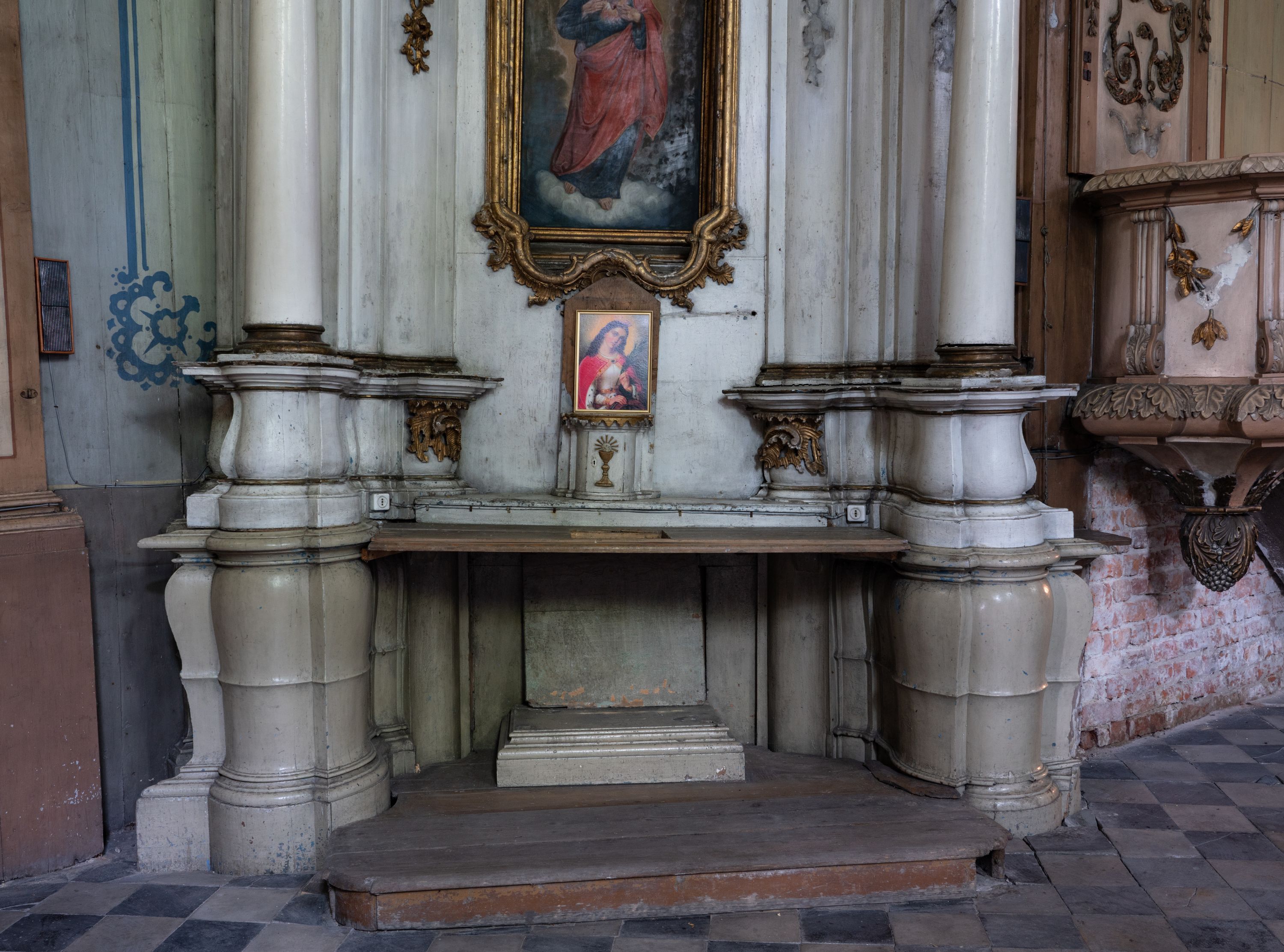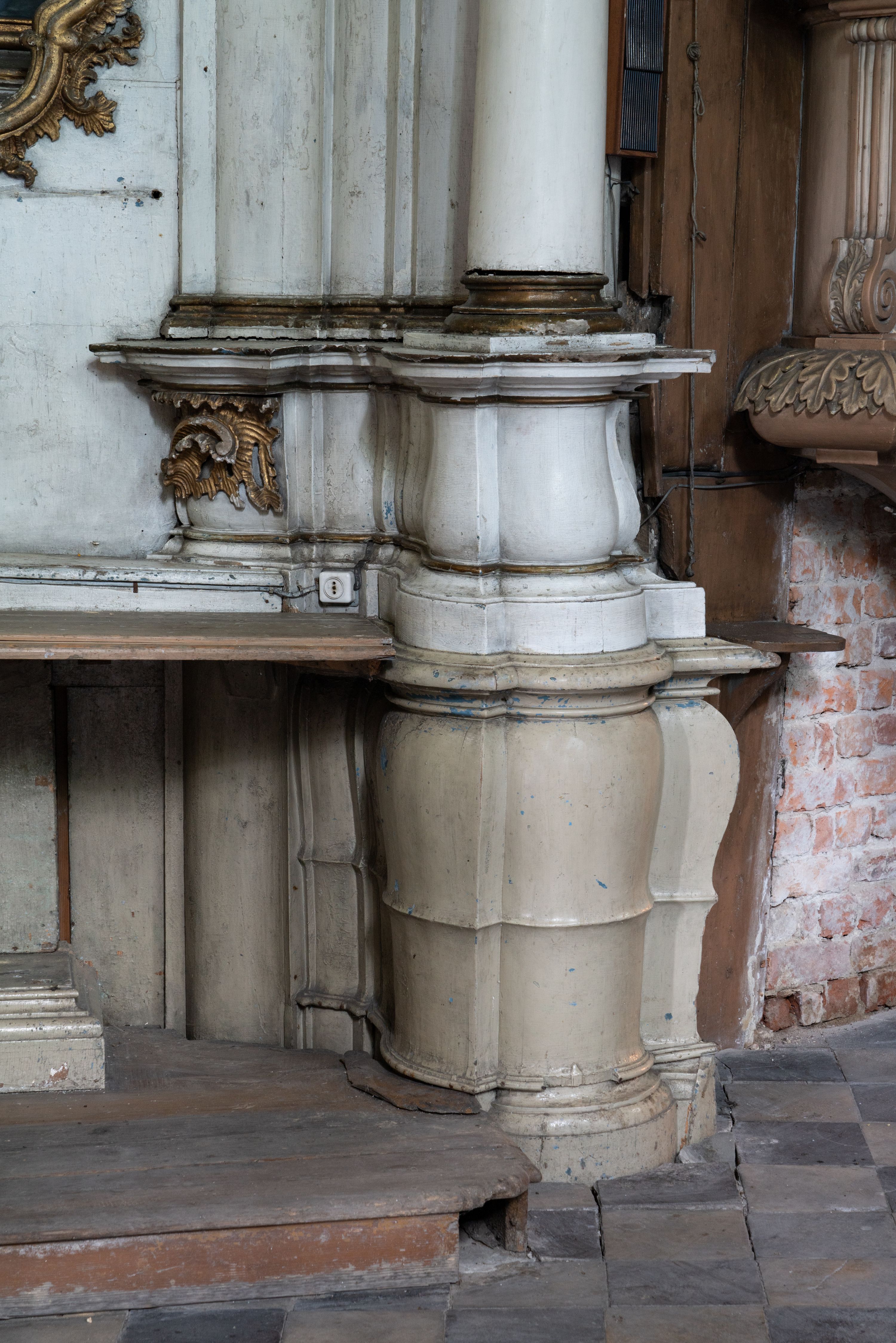 Nastawa wyraźnie jest przechylona. Widoczne są liczne ubytki mechaniczne, przetarcia złoceń i polichromii. Można dostrzec brak części ornamentów, brak rocaille’owego, ażurowego stipesu ołtarza. Całość struktury jest bardzo mocno zabrudzona.