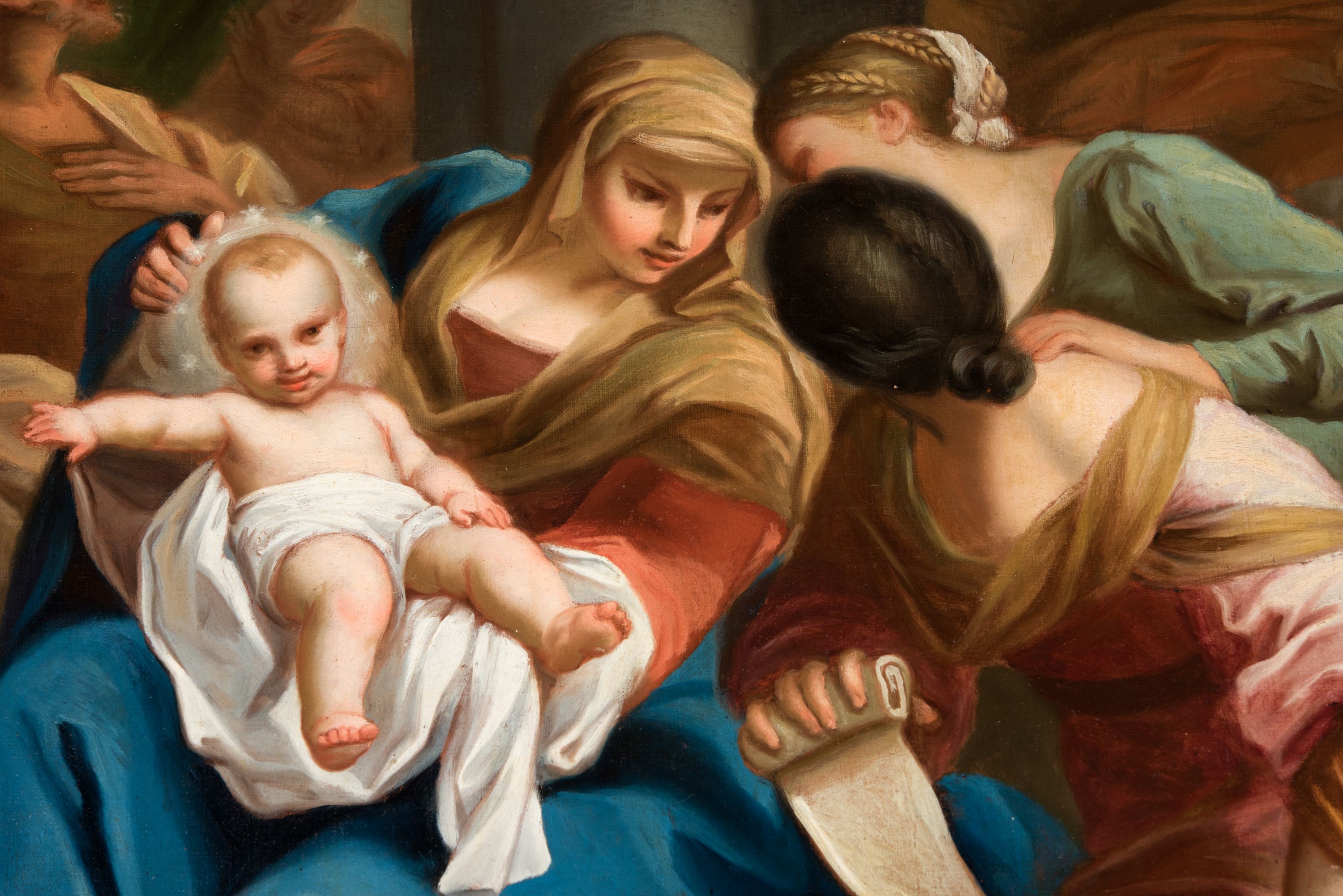 Kompozycja owalna w drewnianej, czarnej, profilowanej ramie. Na pierwszym planie ukazane trzy kobiety, z których jedna trzyma urodzoną właśnie Marię. Kobieta ukazana frontalnie, w pozycji siedzącej, ubrana w czerwoną suknię, niebieski płaszcz i brązową chustę na głowie, zwrócona w kierunku dwóch pozostałych piastunek. Na rękach trzyma dziecko, opatulone w białą pieluchę, z odsłoniętą klatką piersiową oraz nóżkami, z aureolą z gwiazd. Druga z kobiet ukazana z boku, z głową o czarnych włosach odwróconą od widza, z bandażem i dzbanem na wodę w rękach, ubrana w różową suknię i zieloną spódnicę. Trzecia z kobiet stojąca nieco z tyłu pochyla się nad nimi, ukazana z profilu, ubrana w zieloną suknię z włosami przewiązanymi chustą. W tle zarysowane szkicowo postacie: Joachima w brązowej sukni i białym płaszczu, z lewą ręką złożoną na piersi, prawą opuszczoną w dół, postać wyglądająca zza zielonej kotary oraz Anna leżąca na łożu, w zielonej sukni i białym welonie, przy której siedzi kobieta w brązowej sukni i białej chuście na głowie. Przed kobietami głęboka miedziana misa z wodą oraz fragment kołyski z poduszką. Pomieszczenie, w którym rozgrywa się scena, jest podzielone pośrodku kolumną, w lewej części widoczna półkolista arkada z kotarą, a po prawej pomieszczenie z łożem i podwieszoną pod sufitem, zieloną kotarą. Obok łoża Anny znajduje się stolik z okrągłym blatem, na którym leży miska z łyżką.