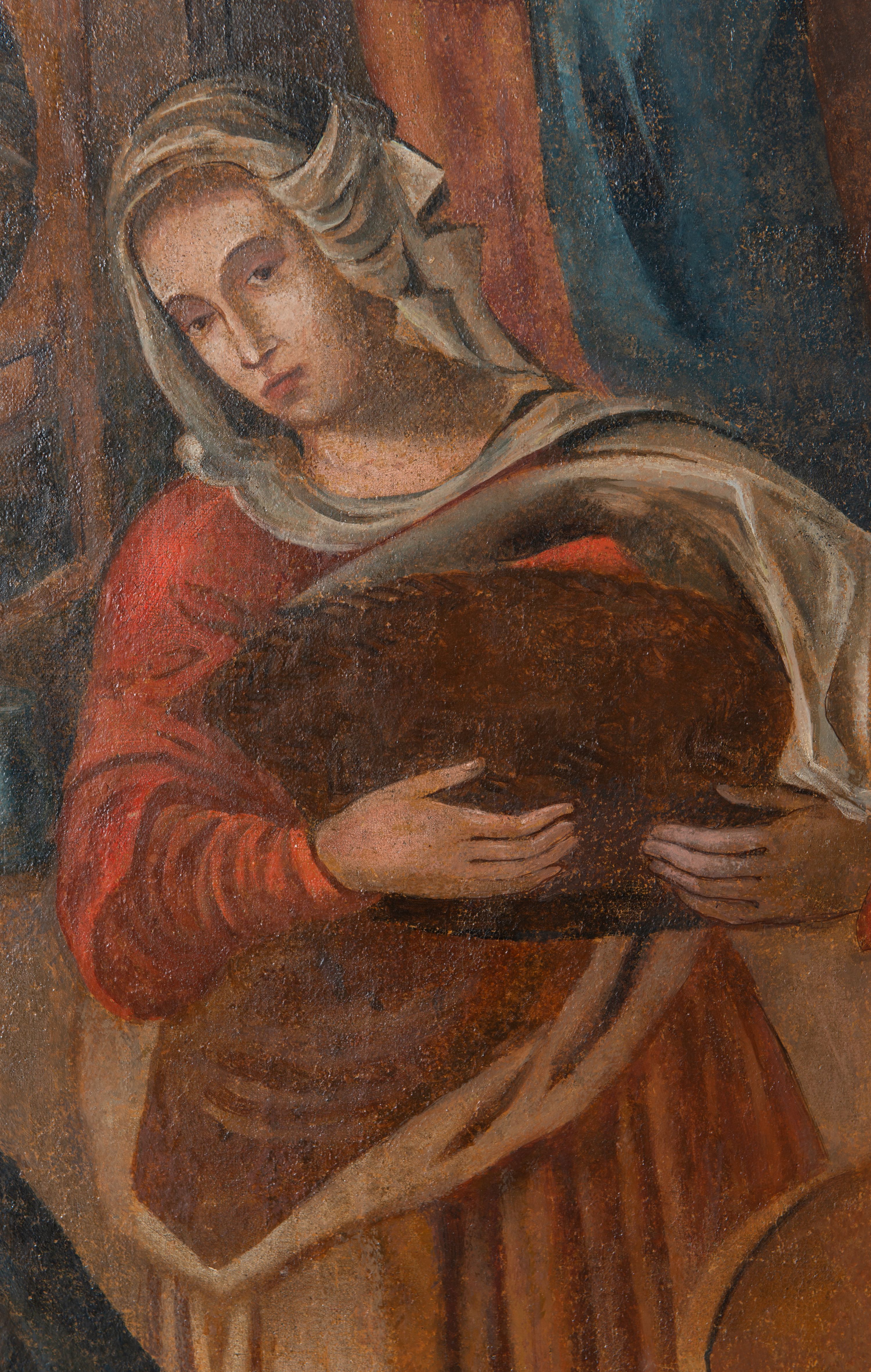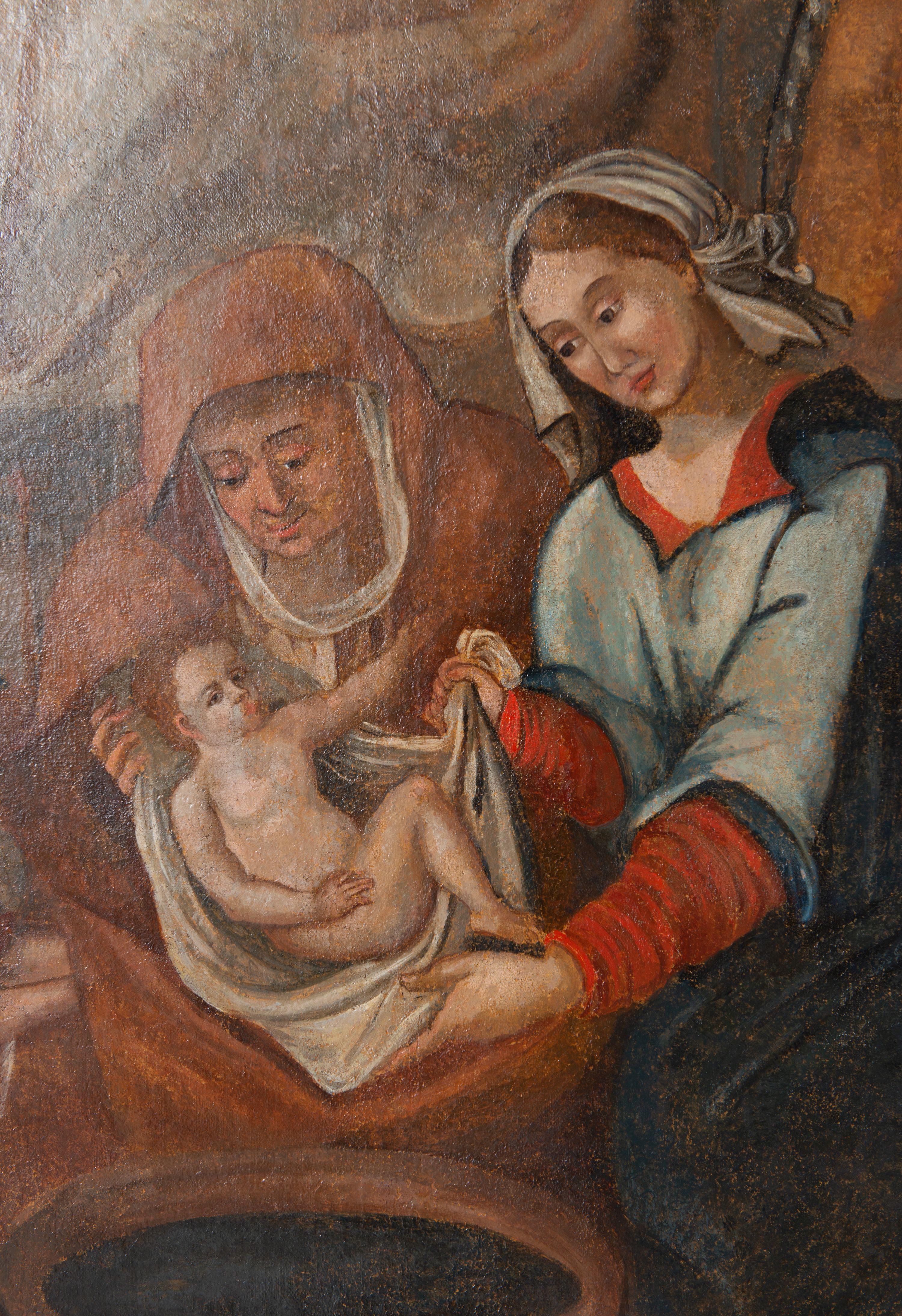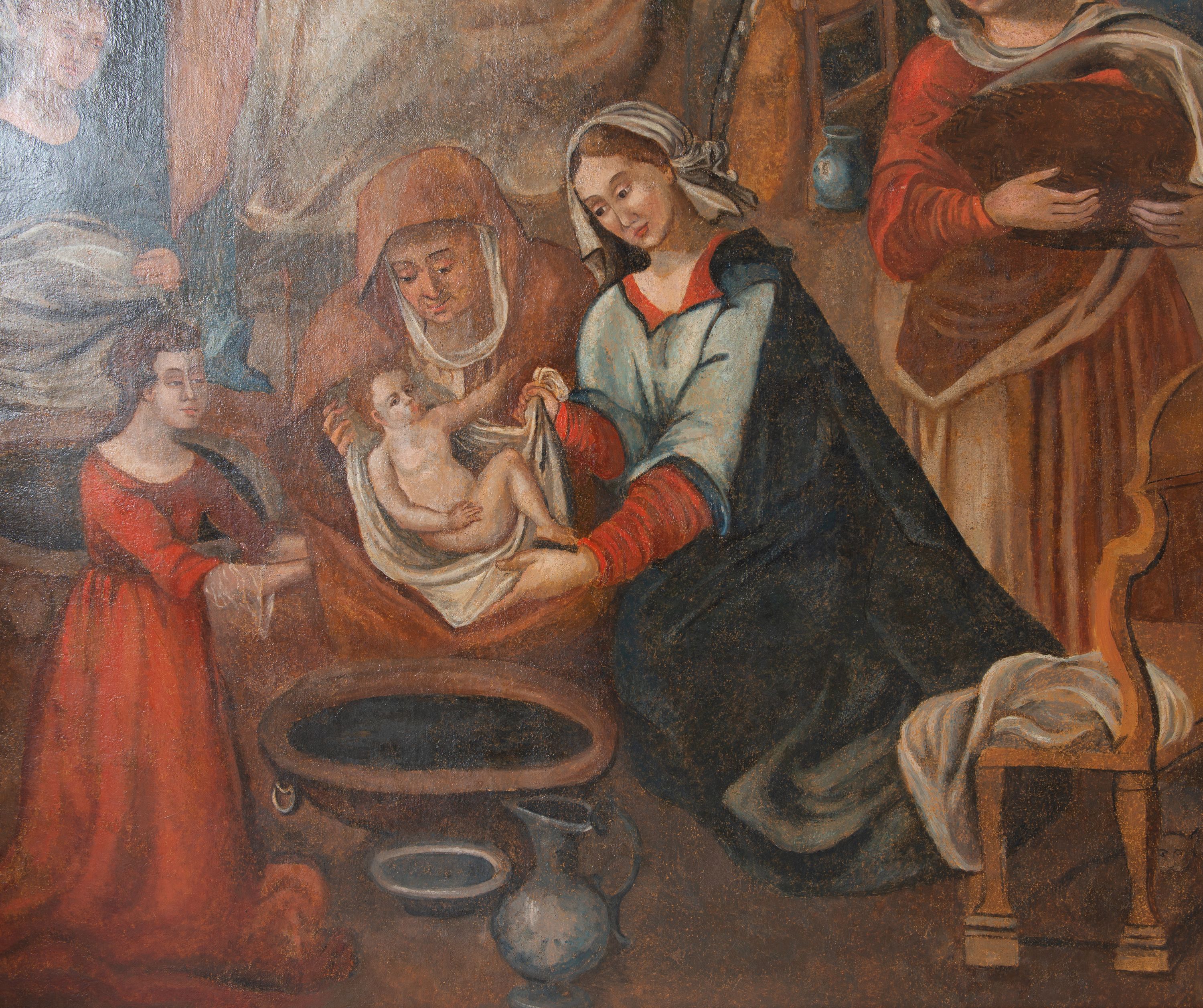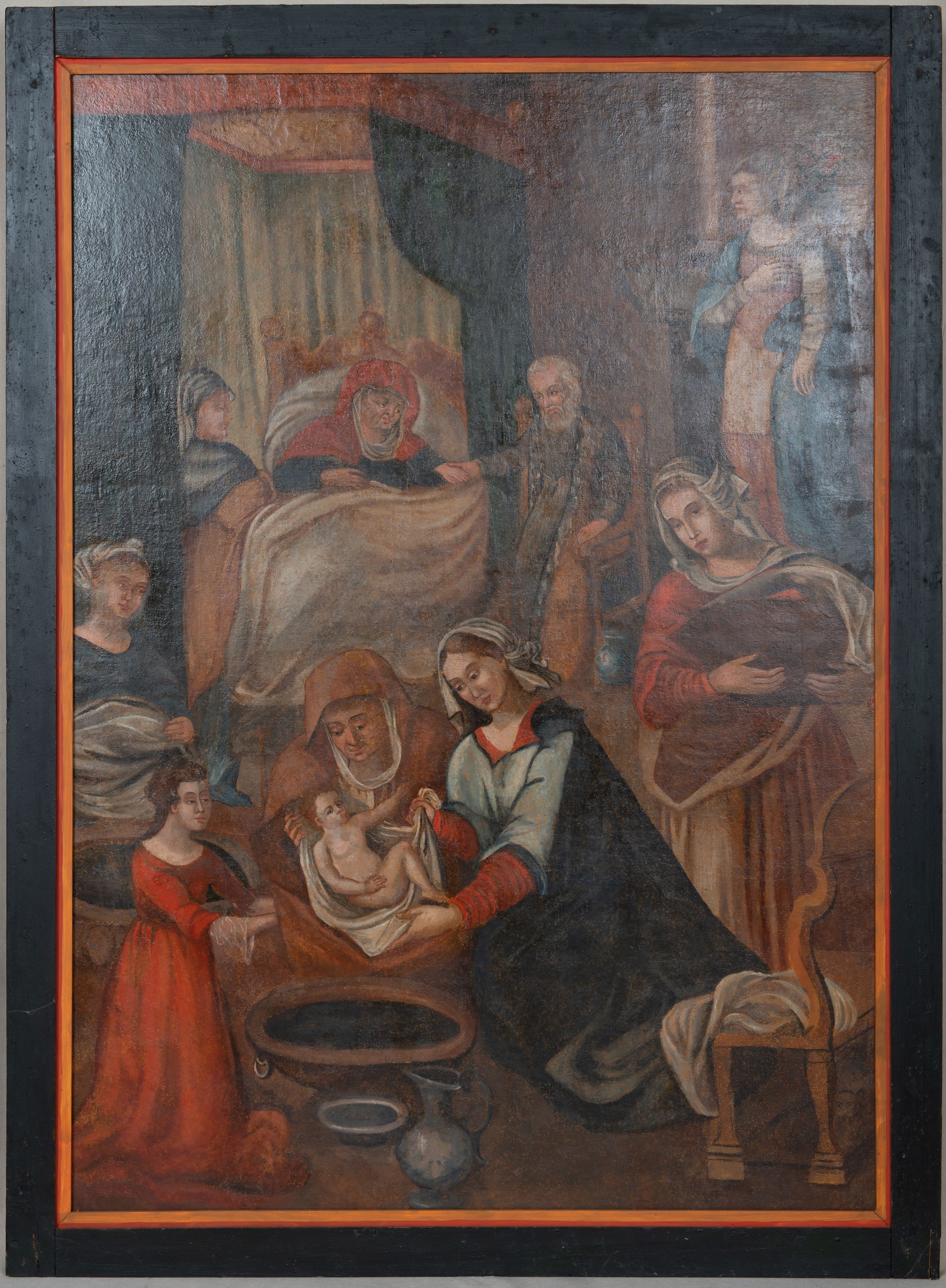 Obraz w kształcie stojącego prostokąta przedstawiający Narodziny Marii. Kompozycja wielopostaciowa, usytuowana we wnętrzu komnaty. Na pierwszym planie, po lewej stronie ukazana scena kąpieli Marii podtrzymywanej na białej chuście przez trzy położne ukazane w pozycji klęczącej. Kobieta po prawej zwrócona w prawo, w stronę Marii, ubrana jest w czerwoną suknię z długimi rękawami, bladoniebieską tunikę oraz ciemnogranatowy płaszcz, na głowie ma zawiązaną białą chustkę. Obok postać starszej kobiety, z pochyloną głową, ubranej w jasnobrązowy płaszcz, wokół twarzy podwika. Po lewej stronie dziewczęca postać w czerwonej sukni. Po prawej stronie obrazu postać służącej niosącej kosz, ukazanej frontalnie, ubranej w czerwoną suknię i jasnobrązową spódnicę oraz płaszcz. Na głowie ma udrapowaną białą chustę, zawiniętą wokół szyi i opadającą na lewe ramię. Na dalszym planie św. Anna przedstawiona w podeszłym wieku, leżąca na łożu z baldachimem. Święta zwrócona jest w lewo, w stronę siedzącego na krześle św. Joachima. Jest ubrana w granatową suknię i czerwoną chustę na głowie, wokół twarzy podwika. Święta lewą rękę podaje św. Joachimowi, ukazanemu jako stary mężczyzna, ubranemu w szarą tunikę i długi kubrak. Po lewej stronie widoczny fragment klęczącej kobiety, przysłoniętej kotarą baldachimu. Po prawej postać młodej kobiety, stojącej, zwróconej w trzech czwartych w prawo. Kobieta ubrana jest w jasnobrązową suknię i błękitny płaszcz okrywający prawe ramię i lewy bok postaci. Głowa ukazana profilem, częściowo okryta białą chustą. Scena rozgrywa się w komnacie, na tle brązowych ścian i podłogi. Z prawej strony z przodu widać fragment krzesła z białą tkaniną na siedzeniu, w tle kominek. Obraz oprawiony w prostą, czarną ramę z żółto-czerwonym profilem od strony wewnętrznej.