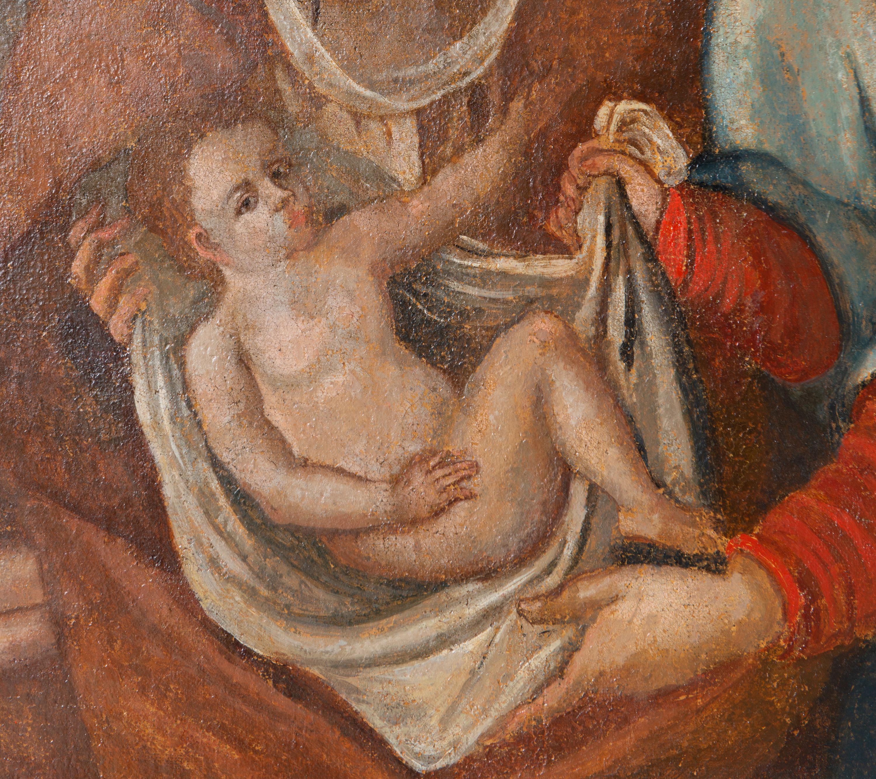 Kompozycja wykorzystana na harklowskim obrazie swoją genezą sięga do wczesnośredniowiecznego typu ikonograficznego, stosowanego przy ukazywaniu narodzin różnych osób świetych. Najpierw narodzin Chrystusa w tzw. typie syryjskim, a następnie w przedstawieniach, jak w tym przypadku, narodzin Najświętszej Marii Panny lub innych, np. św. Jana Chrzciciela, św. Mikołaja biskupa, itp. Zasadniczym elementem takiego przedstawienia jest odpoczywającą po połogu matka leżąca na posłaniu lub w łożu. Najczęściej usługują jej osoby towarzyszące. Równocześnie przedstawiano kąpiel noworodka. Stosunkowo często występuje tu także siedzący ojciec dziecka, np. jak tutaj św. Joachim, św. Józef, św. Zachariasz, itd.