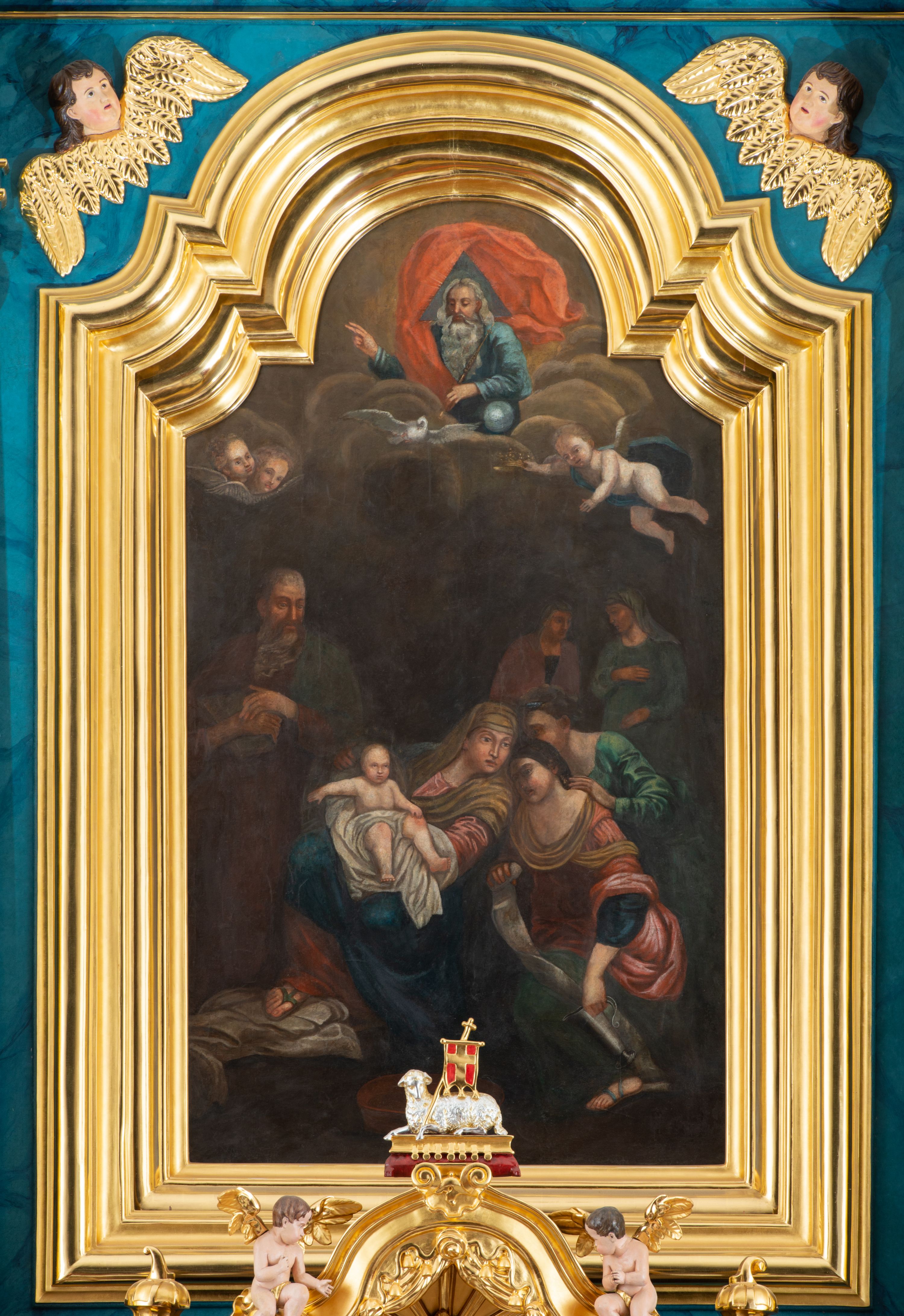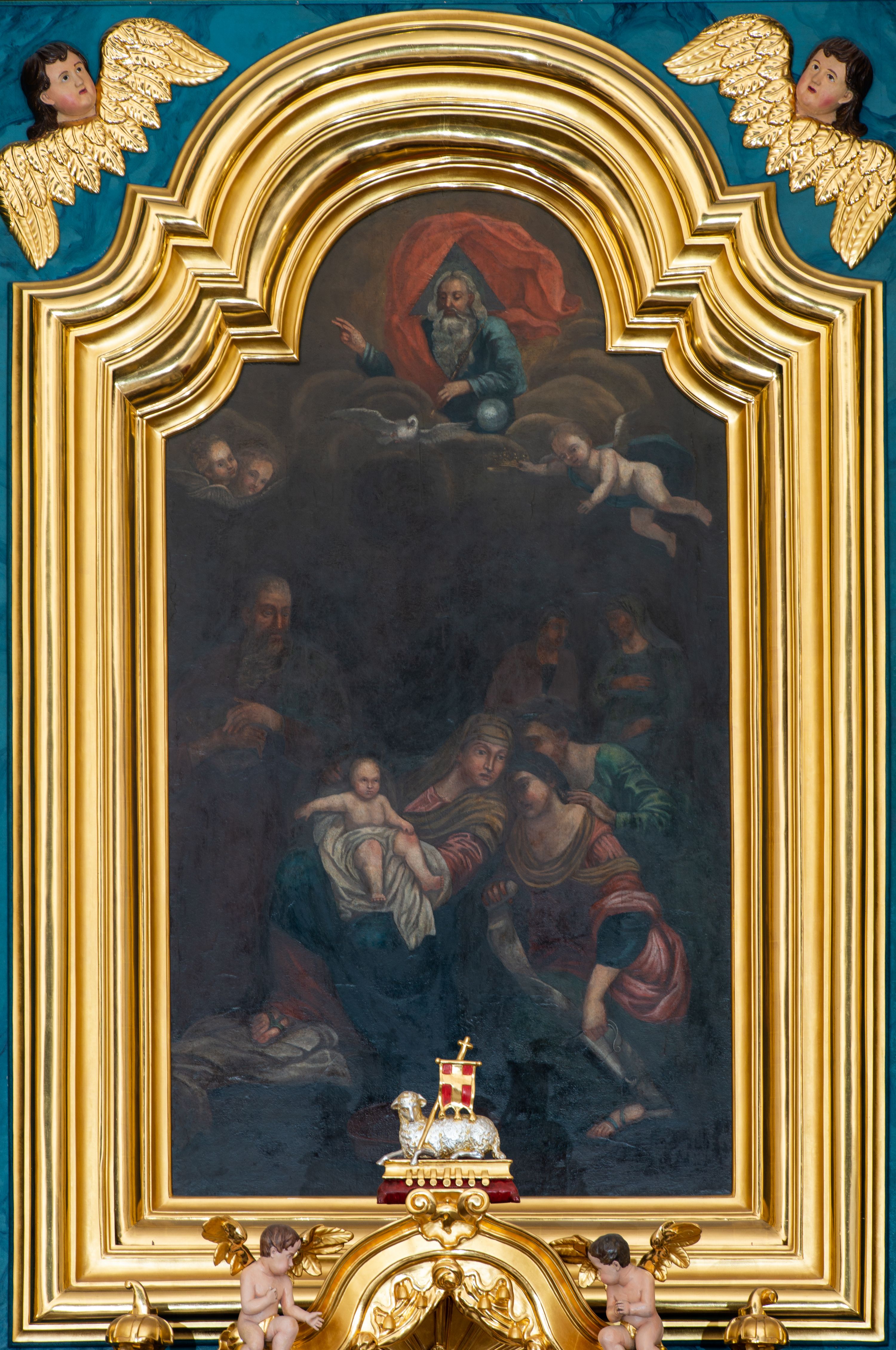 Obraz jest w kształcie stojącego prostokąta zamkniętego nadwieszonym łukiem z uskokiem, ujętego profilowaną, złoconą ramą. Dwustrefowa kompozycja przedstawia scenę Narodzin Marii. W dolnej partii, pośrodku ukazana jest siedząca i zwrócona w trzech czwartych w prawo św. Anna. Odchylając się znacznie, głowę kieruje w lewo. Święta ubrana jest w jasnoczerwoną suknię, ciemnoniebieski płaszcz i ciemnożółtą chustę osłaniającą jej głowę i ramiona. Na stopach ma sandały. Oburącz podtrzymuje małą Marię ukazaną w pozycji siedzącej, zwróconą nieznacznie w lewo, z prawą rączką wyciągniętą w bok, lewą wspartą na kolanie. Jej nagą sylwetkę osłania obszerna, biała szata. Święta Anna pochyla się ku przyklękającej obok kobiecie zwróconej w trzech czwartych w prawo. Jest ona ubrana w ciemnoniebieską bluzkę i zieloną spódnicę, które są widoczne spod czerwonej sukni wierzchniej. Głęboki dekolt okala żółty szal, a głowę kobiety osłania ciemna chusta. Niewiasta w lewej ręce trzyma srebrny dzban, w prawej powijaki. Tuż za nią stoi pochylona ku św. Annie druga z kobiet, wspierając się ręką na ramieniu pierwszej. Ubrana jest w zieloną suknię, w upiętych włosach ma niebieską ozdobę. W głębi widoczne są pozostałe dwie, zwrócone ku sobie kobiety. Stojąca po prawej stronie, ubrana w niebieską suknię i chustę na głowie, prawą rękę wspiera na piersiach, lewą na brzuchu. Druga ma na sobie ciemną suknię, czerwony płaszcz i chustę na głowie. Zaokrąglone twarze kobiet i Marii charakteryzują pełne rysy. Po lewej stronie kompozycji, tuż za św. Anną stoi św. Joachim w trzech czwartych zwrócony w lewo. Pociągłą twarz mężczyzny charakteryzują wyraziste rysy i długi, siwy zarost. Ubrany jest w ciemnobrązową suknię i ciemnozielony płaszcz. Ręce, z trzymaną w prawej dłoni księgą, skład na klatce piersiowej. Na pierwszym planie, u stóp św. Anny leży miedziana misa. W górnej partii obrazu pośród obłoków ukazana jest zwrócona w trzech czwartych w prawo sylwetka spoglądającego w dół Boga Ojca o długich, siwych włosach i zaroście. Ubrany jest w niebieską suknię i czerwony, silnie rozwiany płaszcz. Prawą rękę unosi w geście błogosławieństwa, w lewej, wspartej na globie, trzyma berło. Głowę Boga Ojca ujmuje trójkątny nimb. Poniżej ukazana jest gołębica Ducha Świętego. Na tle obłoków unosi się para uskrzydlonych główek anielskich po lewej stronie kompozycji i anioł po prawej, o nagiej sylwetce przesłoniętej niebieską szatą. W wyciągniętej przed siebie ręce trzyma koronę.