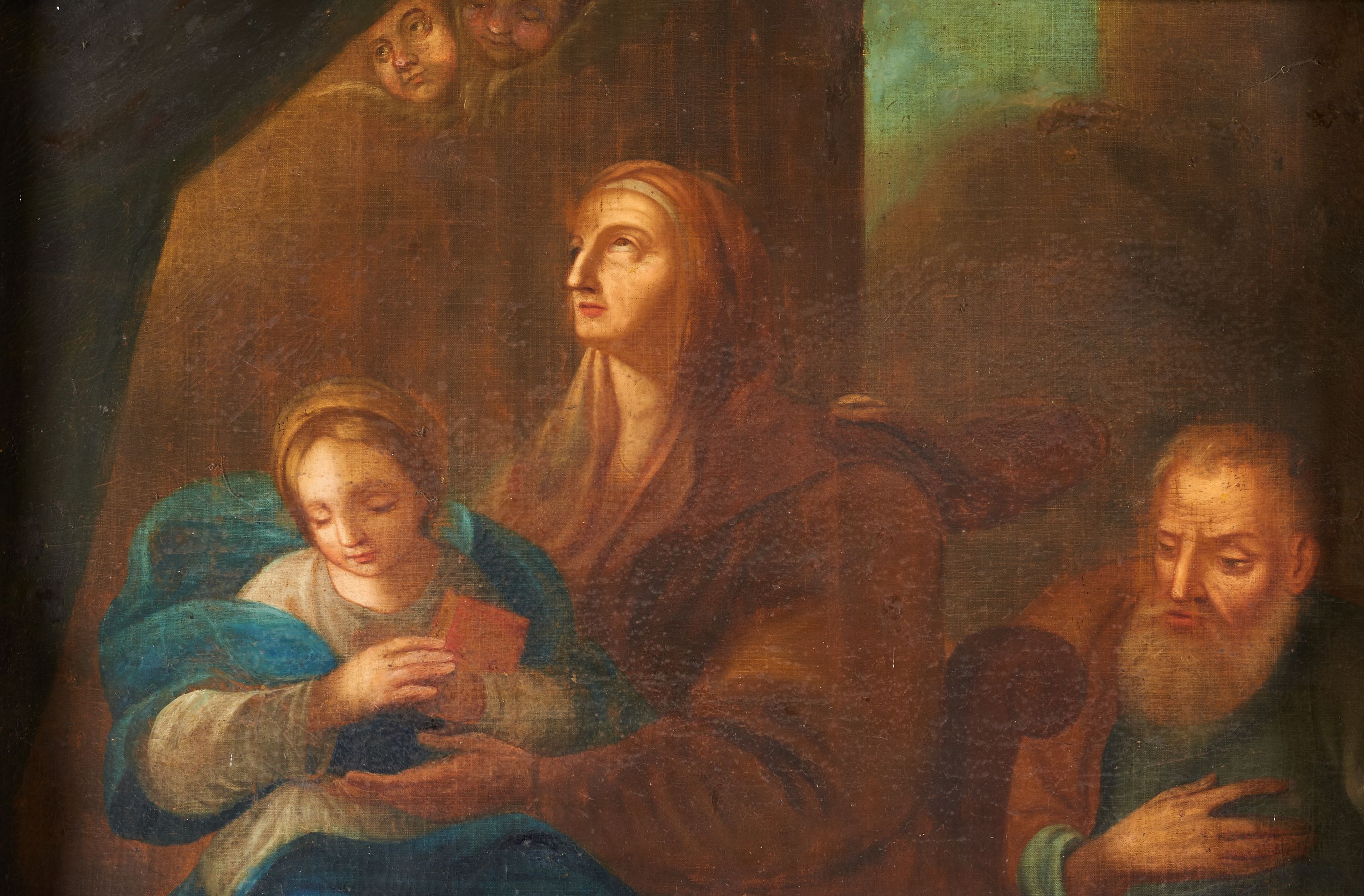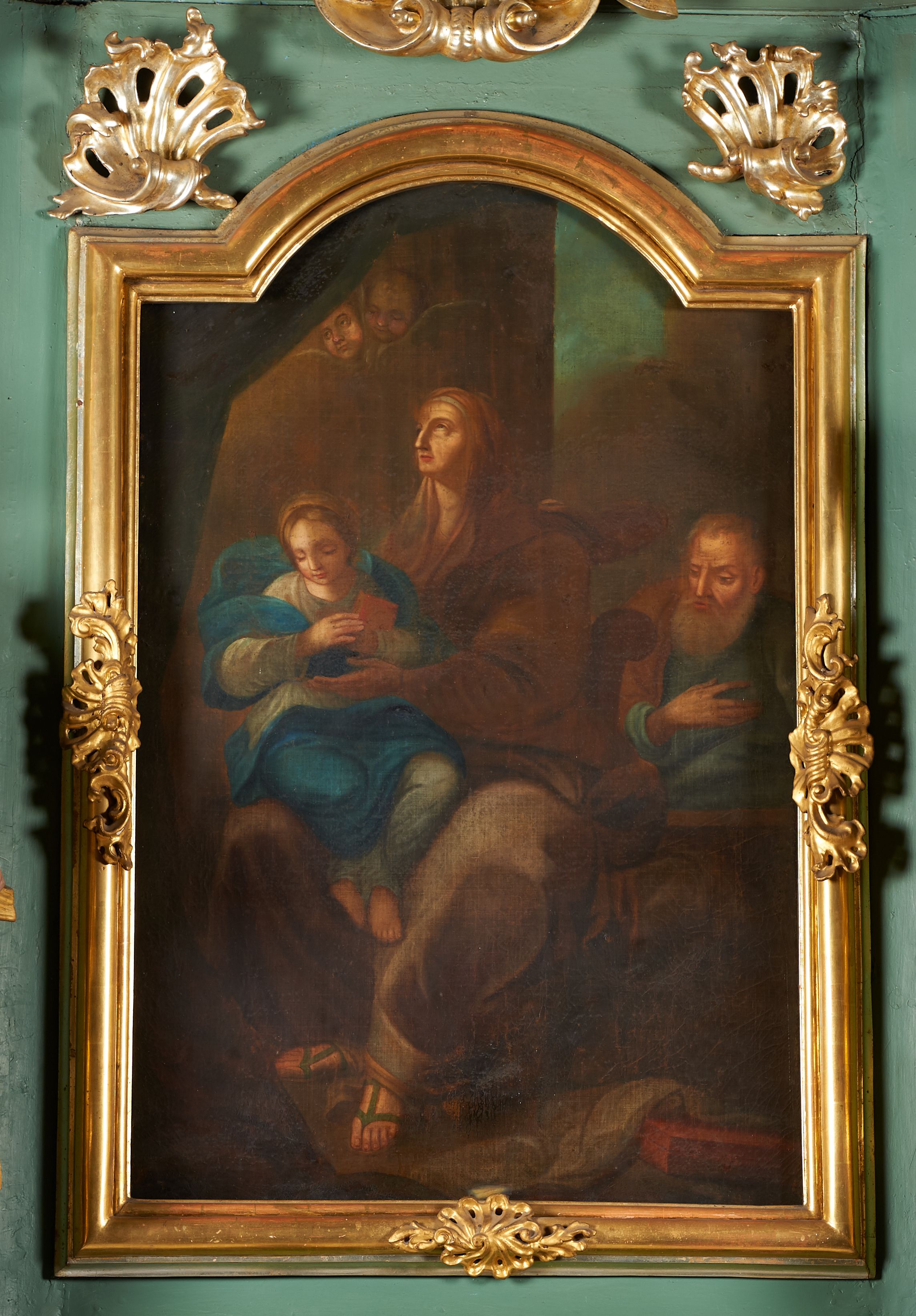 Obraz w dawnej literaturze wymieniony z nieczytelną dziś sygnaturą, jako dzieło Piotra Le Brun'a. Według kroniki parafialnej sprawiono go w 1849 roku na zasuwę ołtarza bocznego różańcowego. Obraz przedstawia scenę Nauczania Marii, w której św. Anna miała pouczyć Marię o tym, że zostanie matką Zbawiciela.