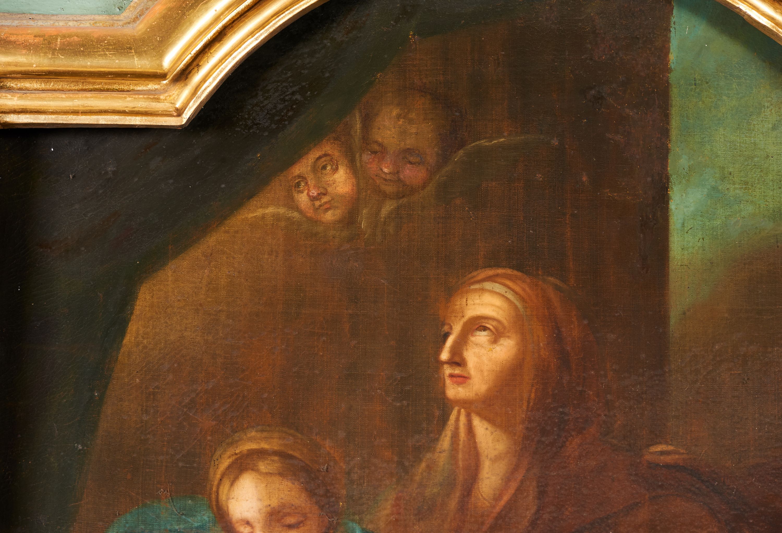 Obraz w formie stojącego prostokąta zamkniętego łukiem segmentowym nadwieszonym. W centrum została przedstawiona św. Anna z młodą Marią, za nią zaś znajduje św. Joachim. Anna siedzi na ławie, zwrócona jest w trzech czwartych w prawo, z lekko uniesioną głową, lewą ręką przytrzymuje siedzącą na jej prawym kolanie Marię. Twarz Anny o starczych rysach, oczach zwróconych ku gorze, długim, prostym nosie, z niewielkimi ustami. Święta ubrana jest w szarą suknię oraz jasnobrązowy płaszcz zarzucony na głowę i ramiona, na stopach ma sandały. Maria została ukazana jako dziewczynka, zwrócona jest w trzech czwartych w lewo, delikatnie pochylona, z głową skierowaną w prawo, przytula obiema rękami do piersi księgę. Twarz ma owalną, o łagodnych rysach, zamkniętych oczach, prostym nosie i małych ustach, okoloną jasnymi włosami upiętymi z tyłu głowy. Maria ubrana jest w jasnoniebieską tunikę oraz rozwiany z tyłu, niebieski płaszcz zarzucony na ramiona i kolana, na głowie ma jasnobrązowy welon. Za św. Anną ukazany został frontalnie, lekko pochylony św. Joachim, z głową skierowaną w prawo oraz z prawą ręką złożoną na piersi. Jego twarz jest pociągła, o starczych rysach, z prostym nosem, półprzymkniętymi oczami, wąskimi ustami, okolona długą, siwą brodą i krótkimi włosami. Ubrany jest w jasnoniebieską tunikę i brązowy płaszcz. Scena ukazana jest we wnętrzu, z widoczną za św. Anną kolumną i fragmentem muru. W lewym górnym rogu znajduje się zielona kotara, spod której emanuje światło, ku któremu zwraca się św. Anna, nad nią dwie uskrzydlone główki anielskie. W dolnej części obrazu rozrzucona tkanina, gdzie w prawym, dolnym rogu znajduje się księga. Kolorystyka obrazu z przewagą brązów i żółcieni.