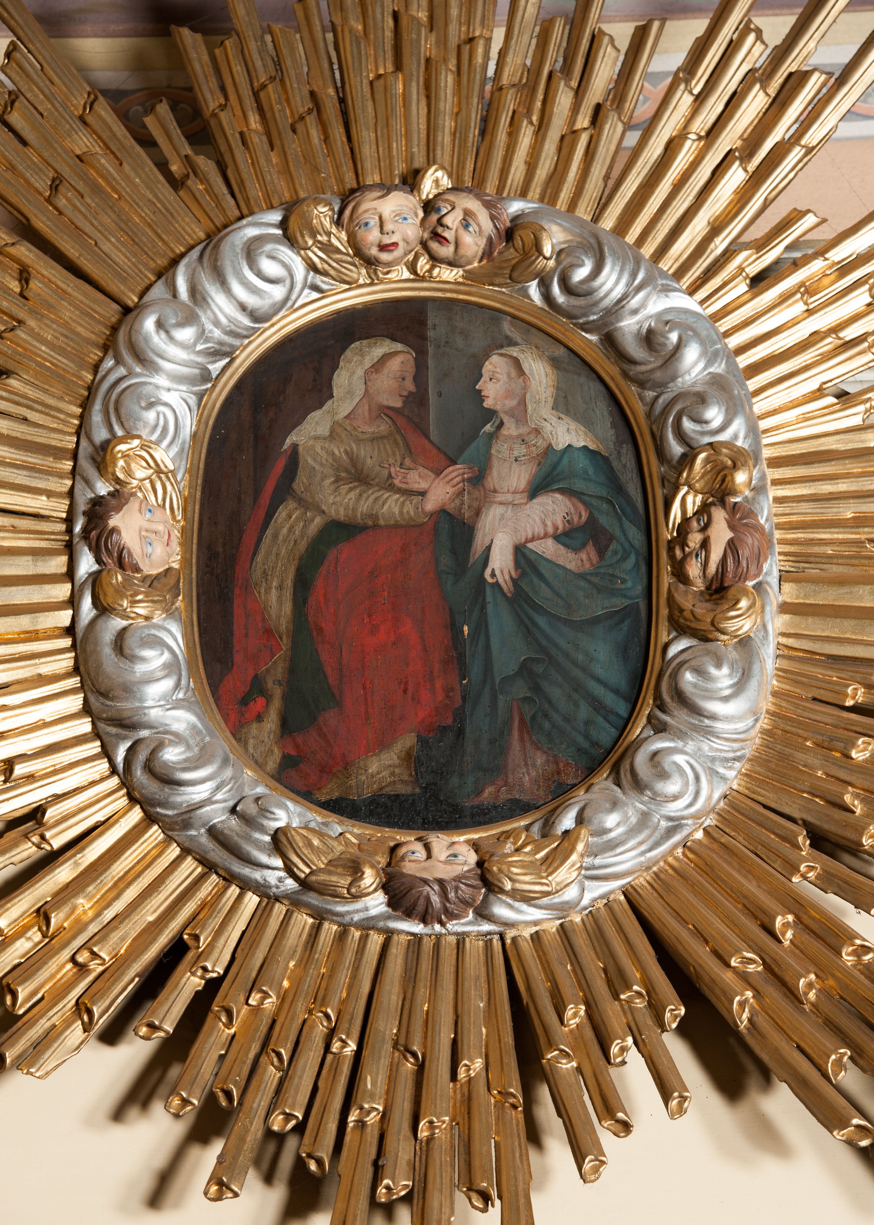 Obraz przedstawia scenę Nawiedzenia przez Marię św. Elżbiety opisaną w Ewangelii św. Łukasza: „W tym czasie Maryja wybrała się i poszła z pośpiechem w góry do pewnego miasta w [pokoleniu] Judy. Weszła do domu Zachariasza i pozdrowiła Elżbietę. Gdy Elżbieta usłyszała pozdrowienie Maryi, poruszyło się dzieciątko w jej łonie, a Duch Święty napełnił Elżbietę. Wydała ona okrzyk i powiedziała: «Błogosławiona jesteś między niewiastami i błogosławiony jest owoc Twojego łona. A skądże mi to, że Matka mojego Pana przychodzi do mnie? Oto, skoro głos Twego pozdrowienia zabrzmiał w moich uszach, poruszyło się z radości dzieciątko w moim łonie. Błogosławiona jesteś, któraś uwierzyła, że spełnią się słowa powiedziane Ci od Pana»” (Łk 1, 39-45).