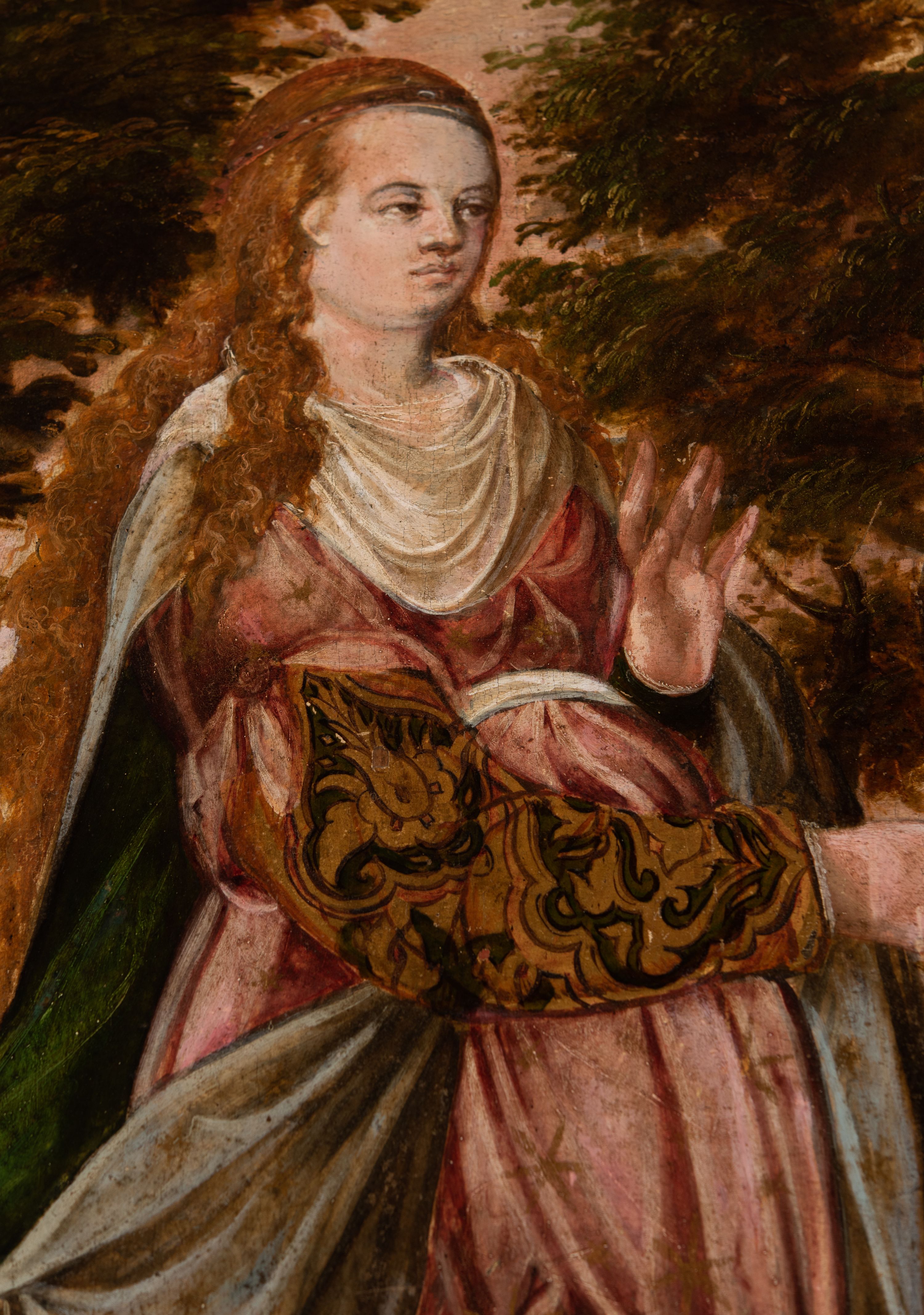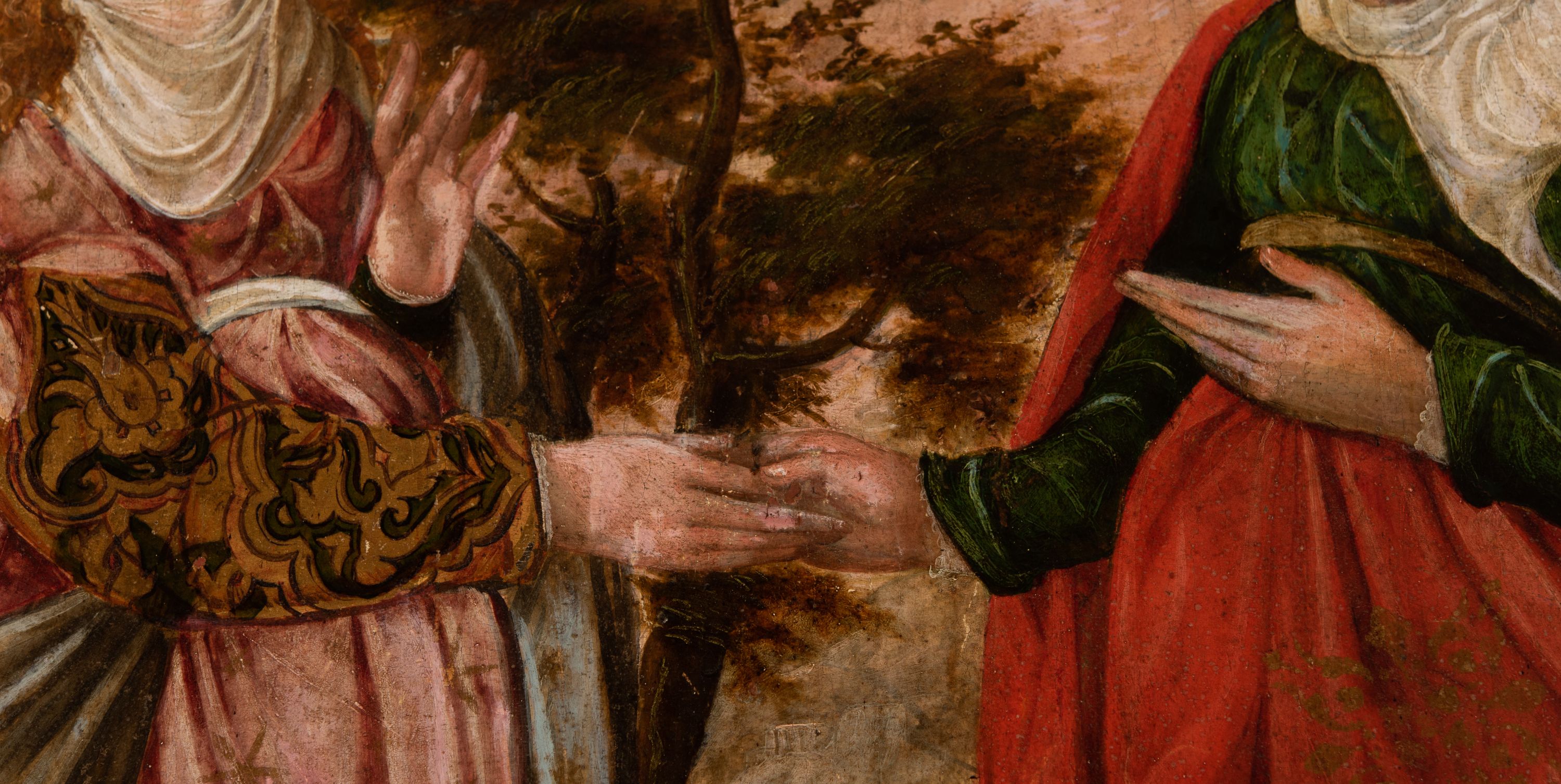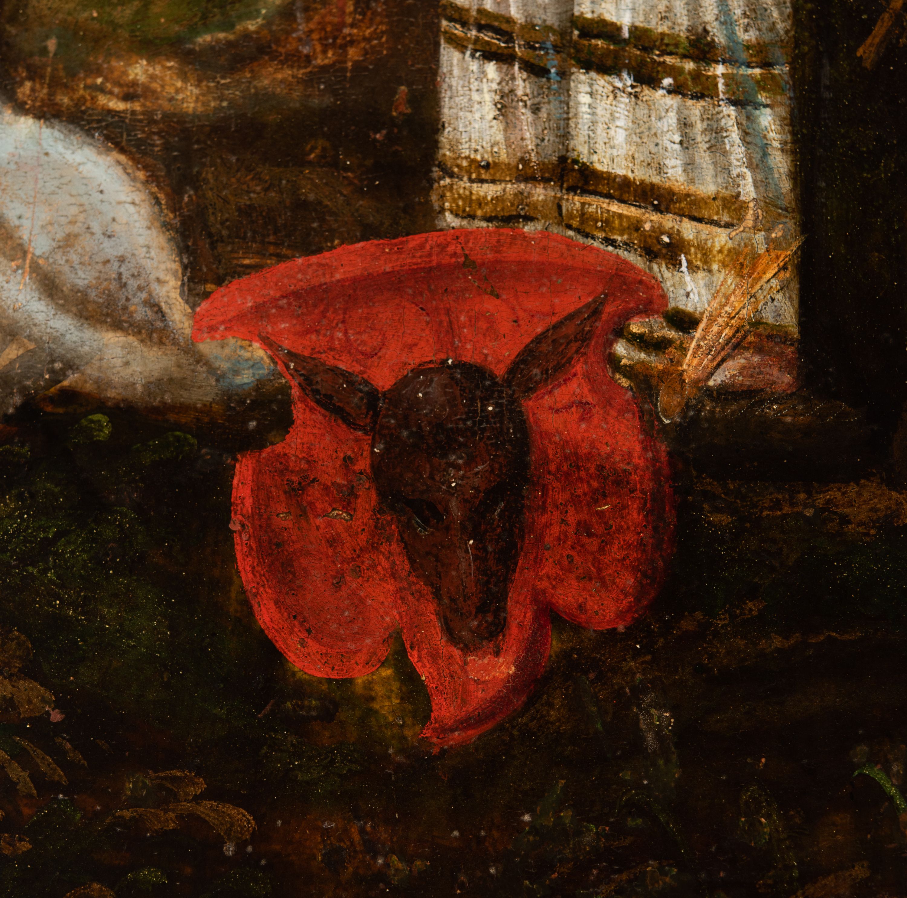 Obraz kilkakrotnie przemalowany. Przetarcia złoceń w przyłuczach. Przetarcia i zabrudzenia warstwy malarskiej.