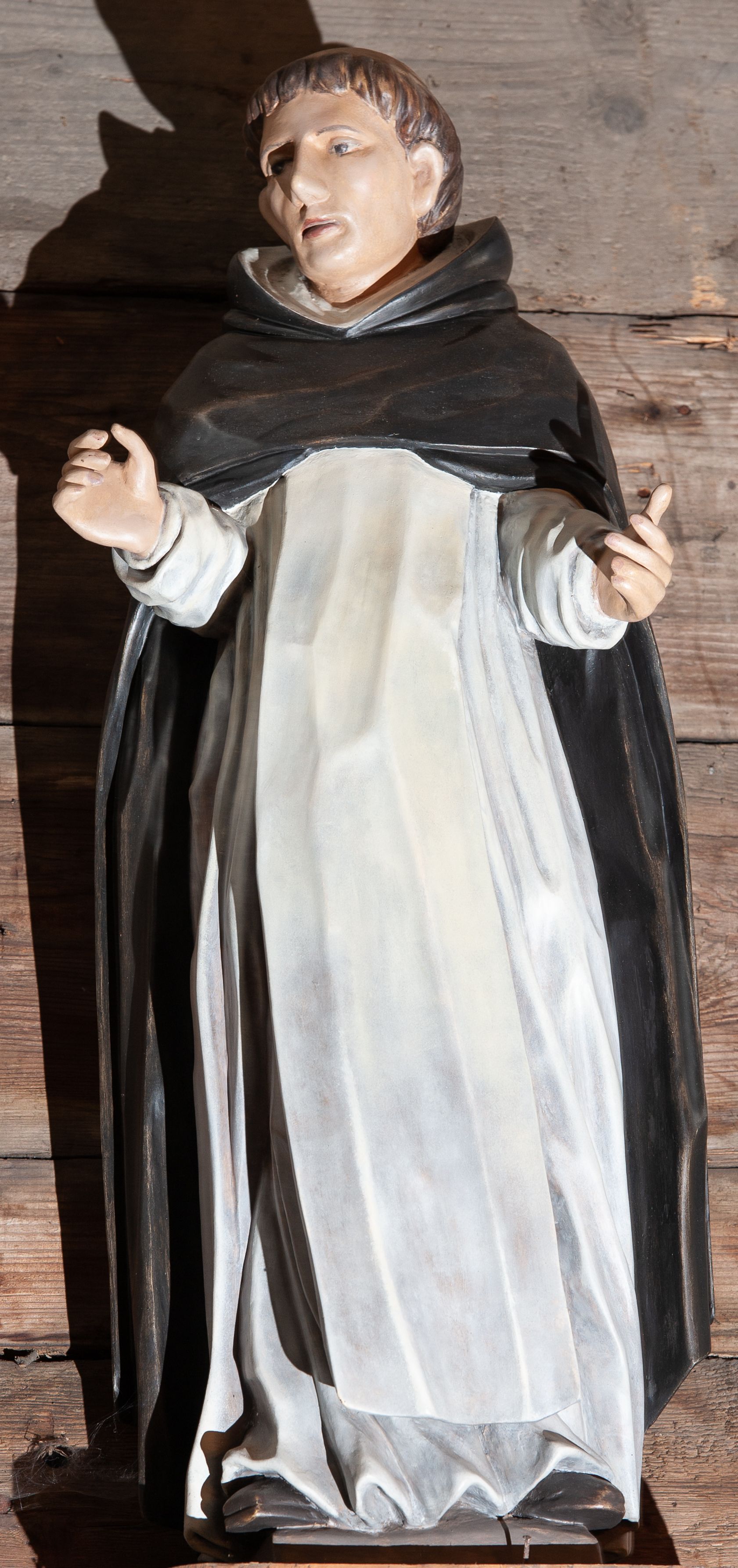 Włosy koloru brązowego. Na głowie widoczna tonsura. Święty ubrany jest w biały habit dominikański ze szkaplerzem oraz czarny płaszcz z kapturem. Spod habitu widoczne są brązowe buty. Szaty podkreślające anatomię. Figura w pełni polichromowana.