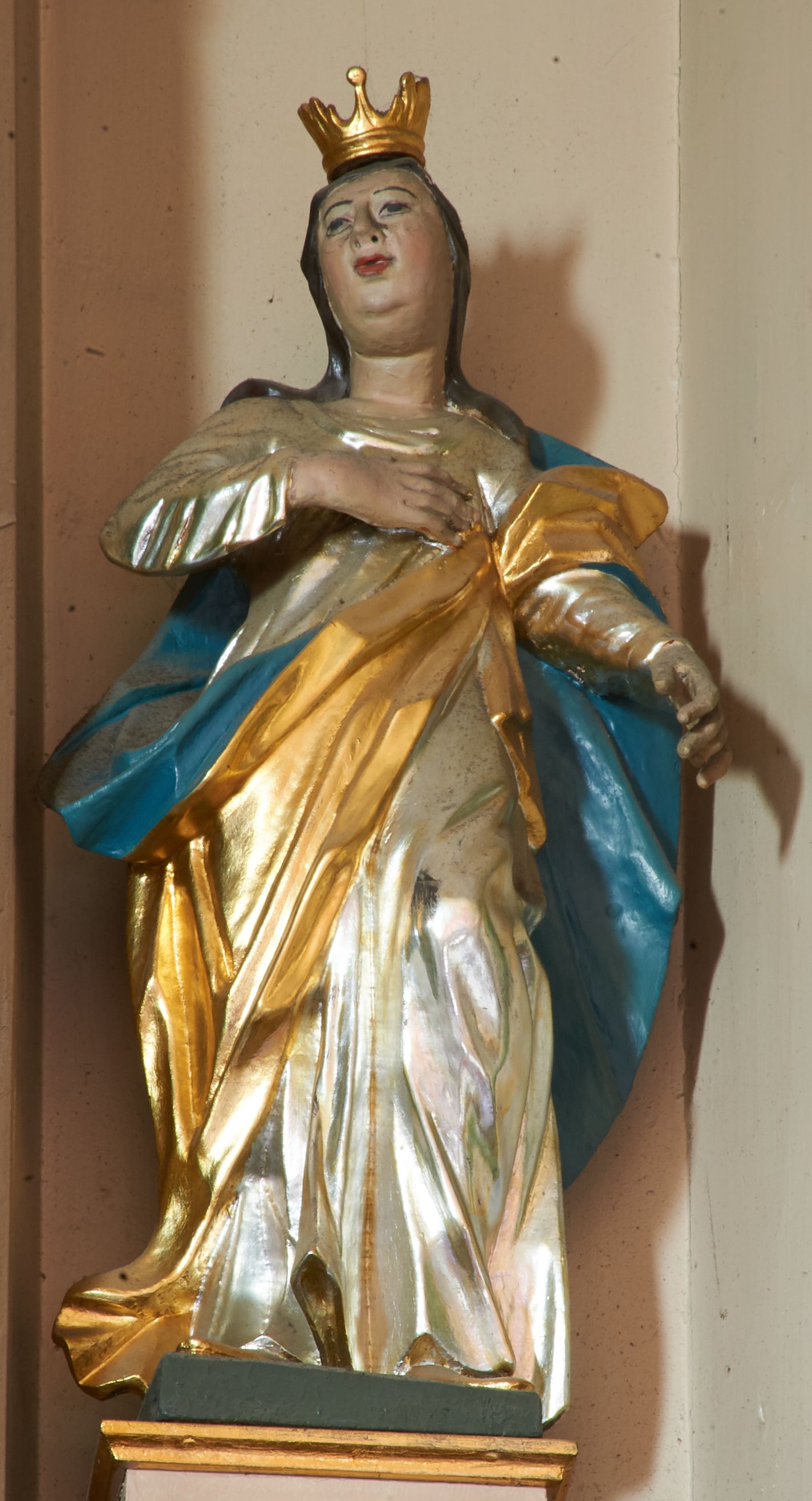 Figura niezidentyfikowanej świętej pochodzi z dawnego ołtarza głównego z około 1749 roku, który mieścił się w poprzednim kościele w Piekielniku. Po wybudowaniu nowych kościoła i nastawy głównej wprawiono do niej dawne rzeźby. Brak atrybutu w omawianej figurze nie pozwala na jej identyfikację.