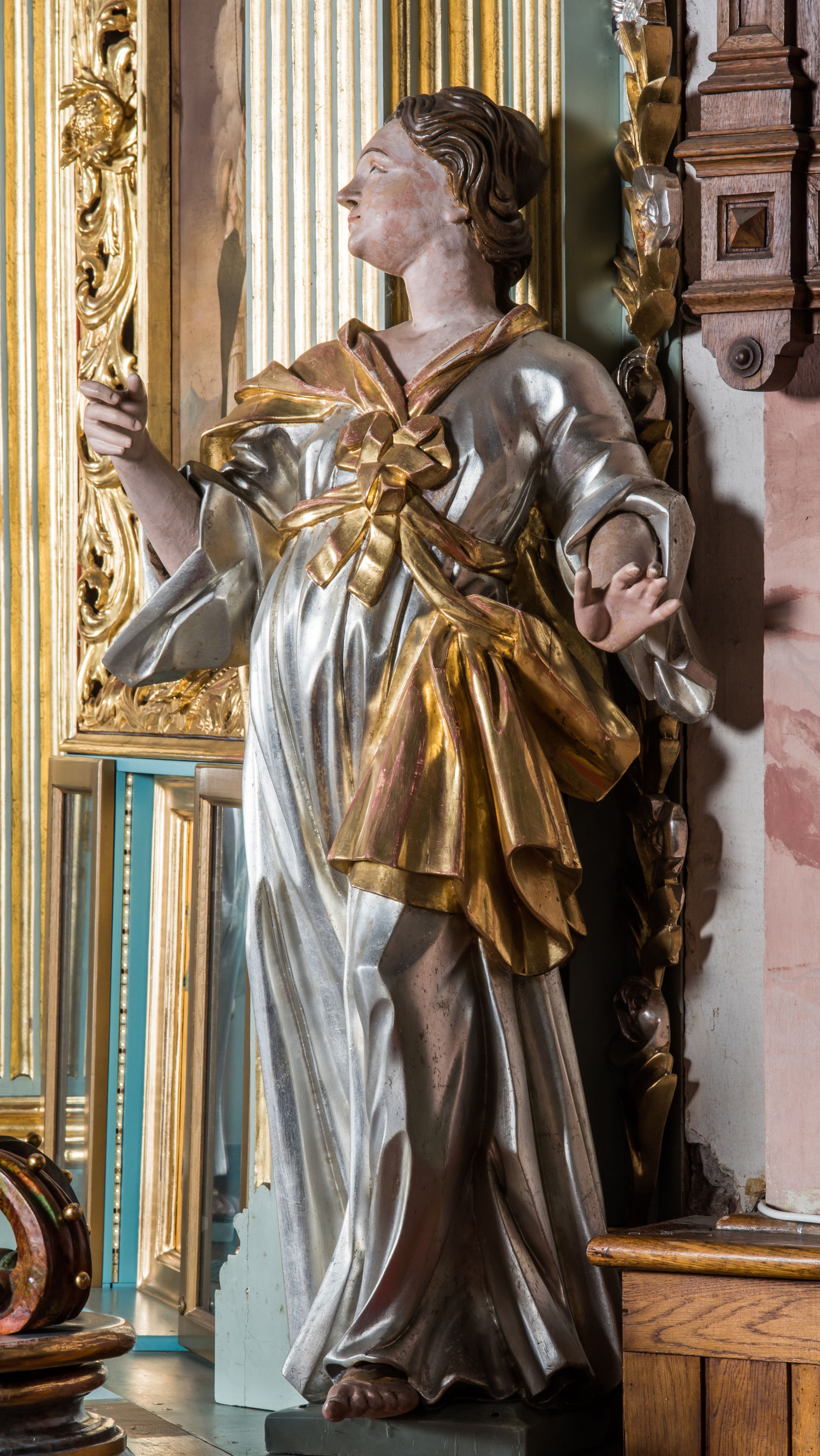 Pełnopostaciowa figura ukazuje stojącą frontalnie świętą niewiastę w kontrapoście. Święta z odchyloną nieznacznie do tyłu głową prawą ręką unosi na wysokości piersi trzymając w niej niezachowany przedmiot, lewą zaś lekko odsuwa od siebie. Kobieta ma pociągłą twarz o pucułowatych, rumianych policzkach, wyrazisty nos i usta. Jej głowę otaczają brązowe włosy spływające na ramiona. Ubrana jest w srebrzoną tunikę przewiązaną na piersi szarfą oraz narzucony na ramiona złoty płaszcz osuwający się z tyłu postaci. Spod tuniki widać fragment lewej stopy obutej w sandał.