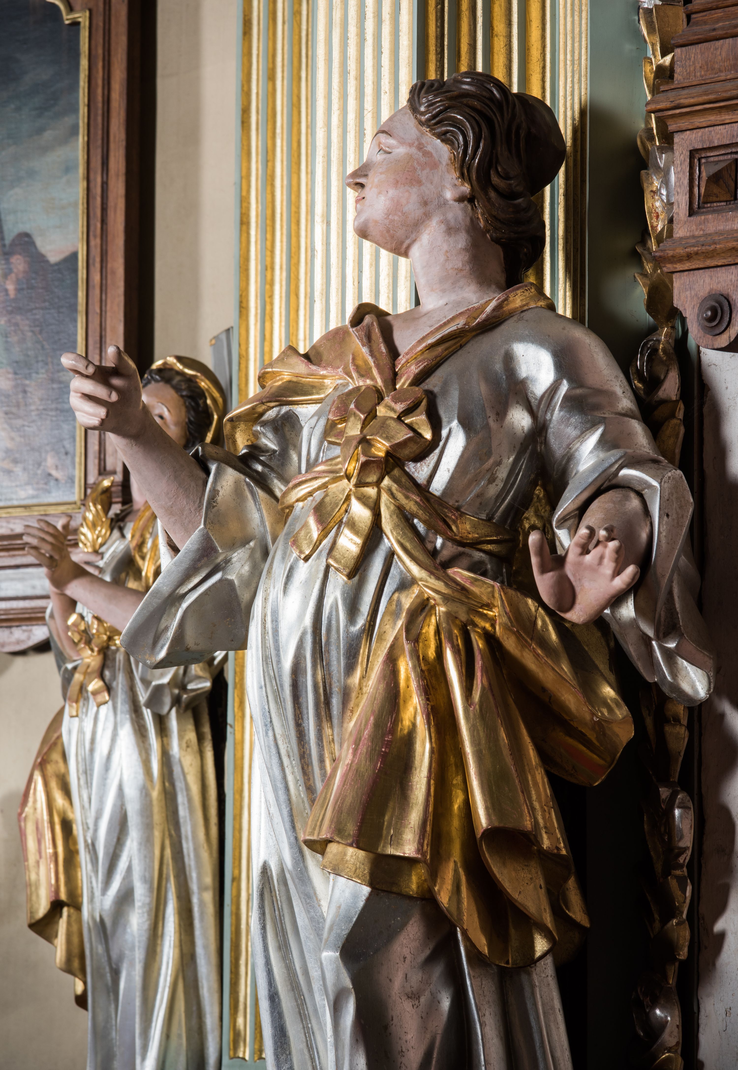 Rzeźby zaatakowane przez drewnojada, widoczne są niewielki ubytki (palce) oraz przetarcia warstwy malarskiej.