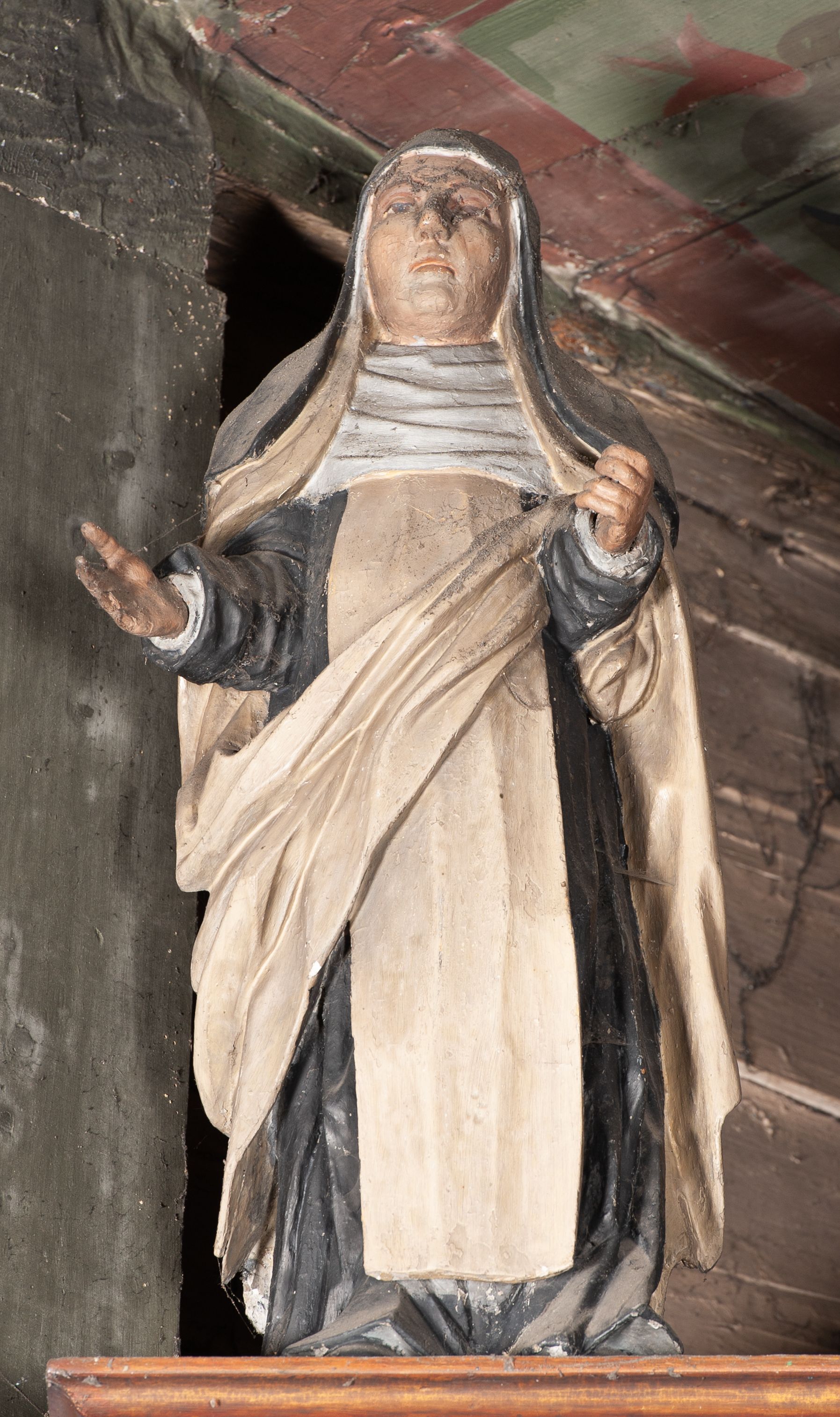 Rzeźba pełnoplastyczna, przyścienna, ścięta z tyłu, przedstawiająca świętą zakonnicę, być może dominikankę (?), umieszczona po prawej stronie glorii w zwieńczeniu ołtarza bocznego. Postać ukazana frontalnie, w pozycji stojącej, z ugiętą w kolanie prawą nogą, ręce zgięte w łokciach, wysunięte do przodu. W prawej dłoni święta trzyma otwartą księgę. Święta ubrana w czarny habit z białym szkaplerzem i biały płaszcz, którego prawa poła przełożona ukośnie przez przód postaci; na głowie czarny welon, wokół twarzy podwika. Twarz pociągła z wydatnym nosem, oczy o opadających zewnętrznych kącikach, usta lekko rozchylone.