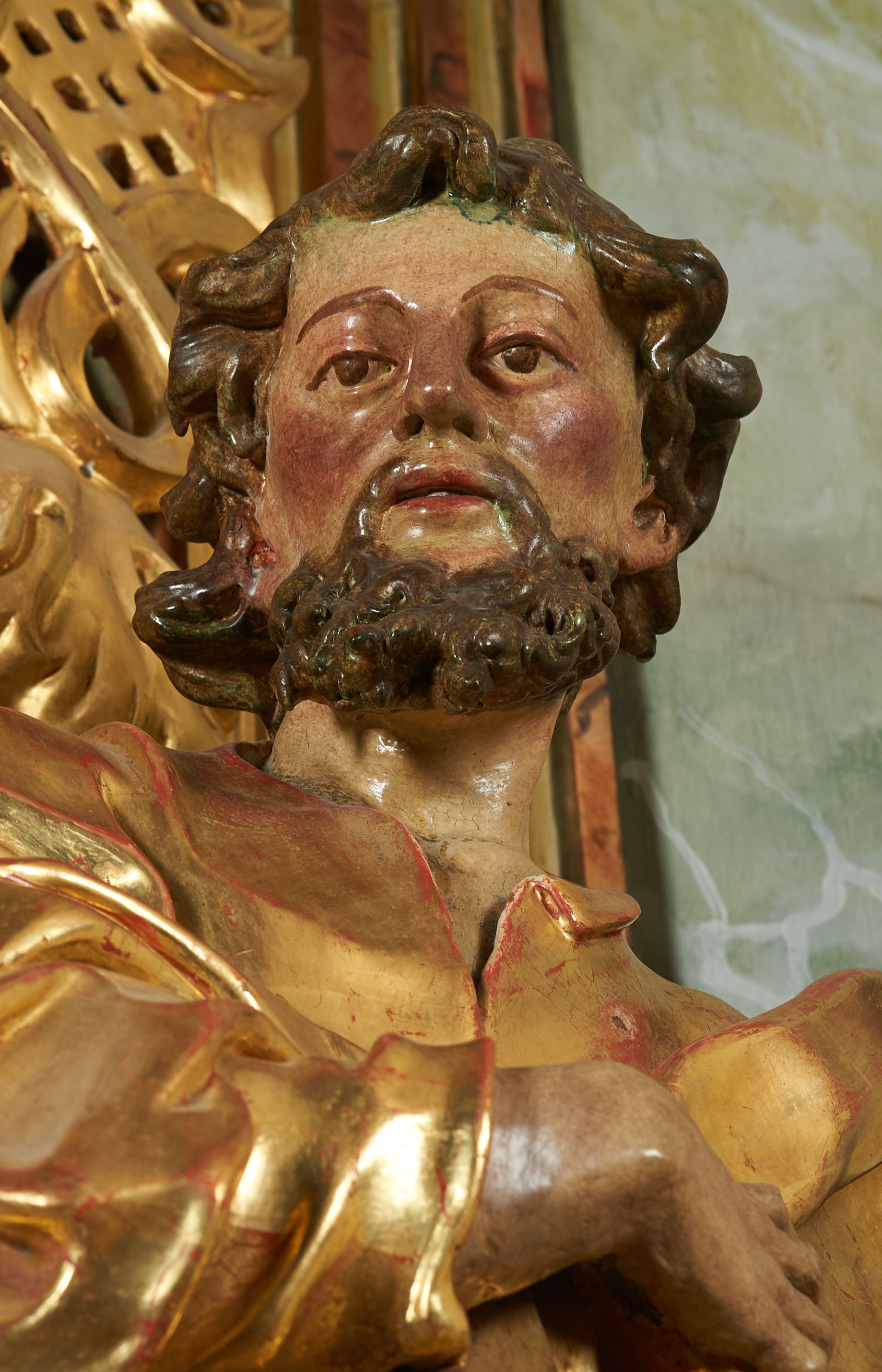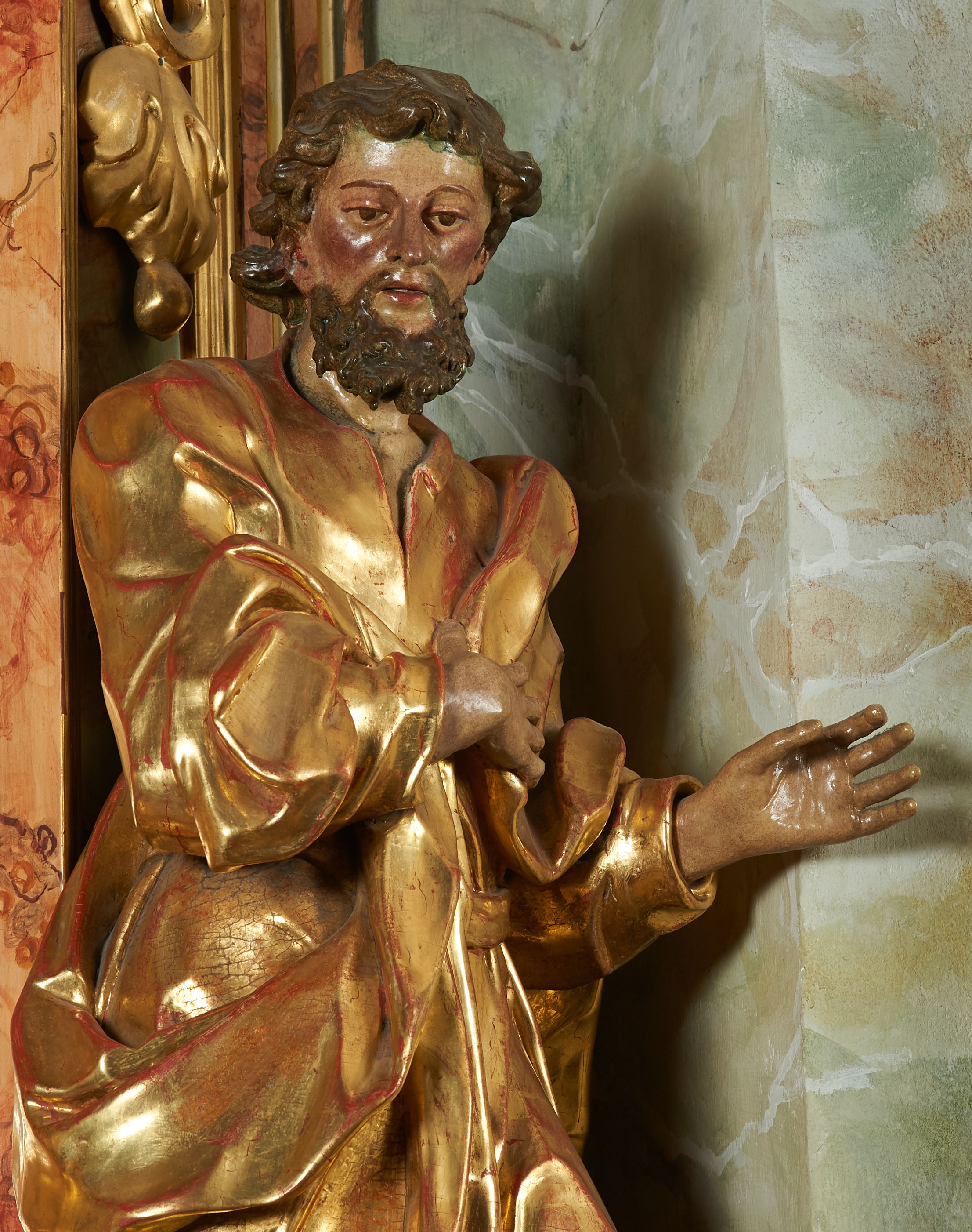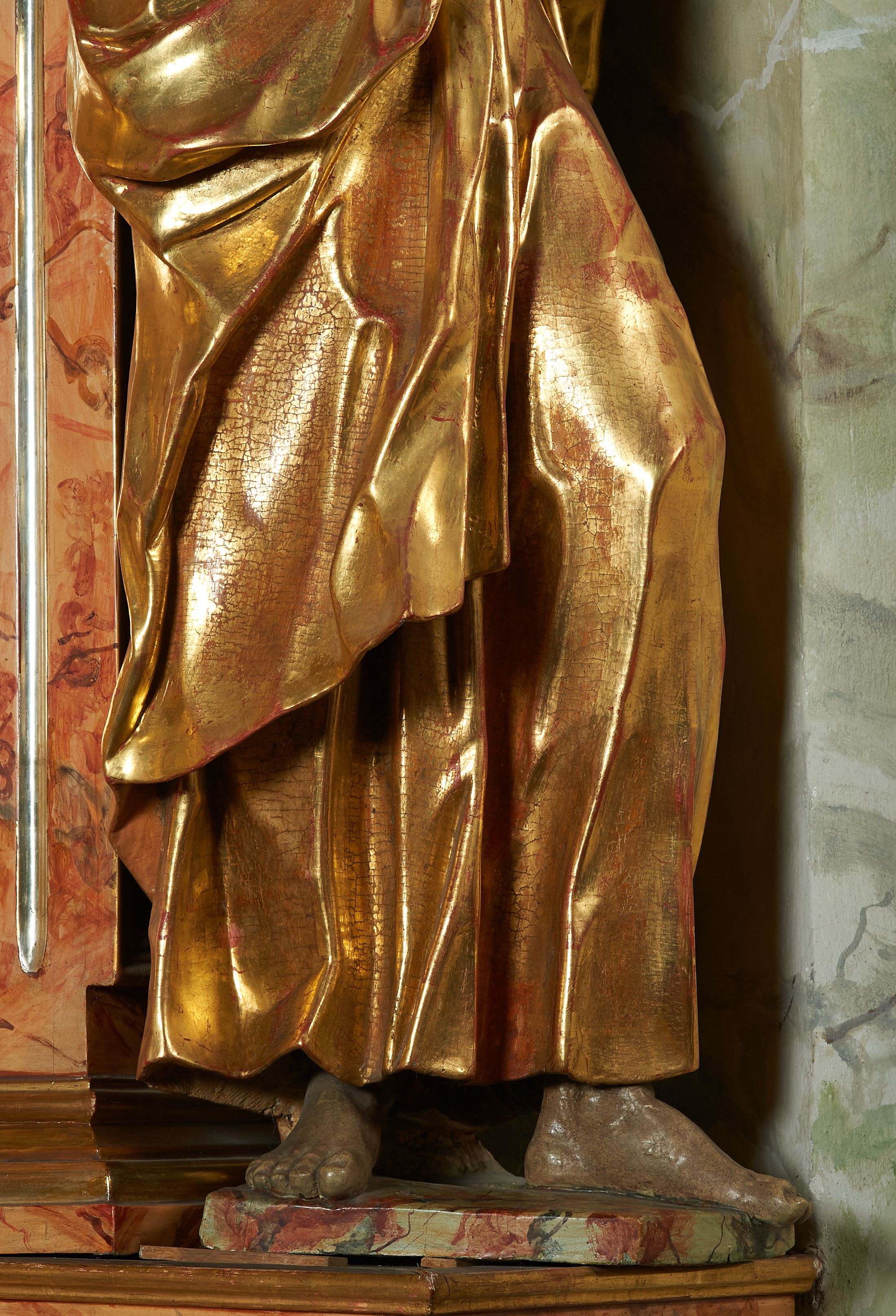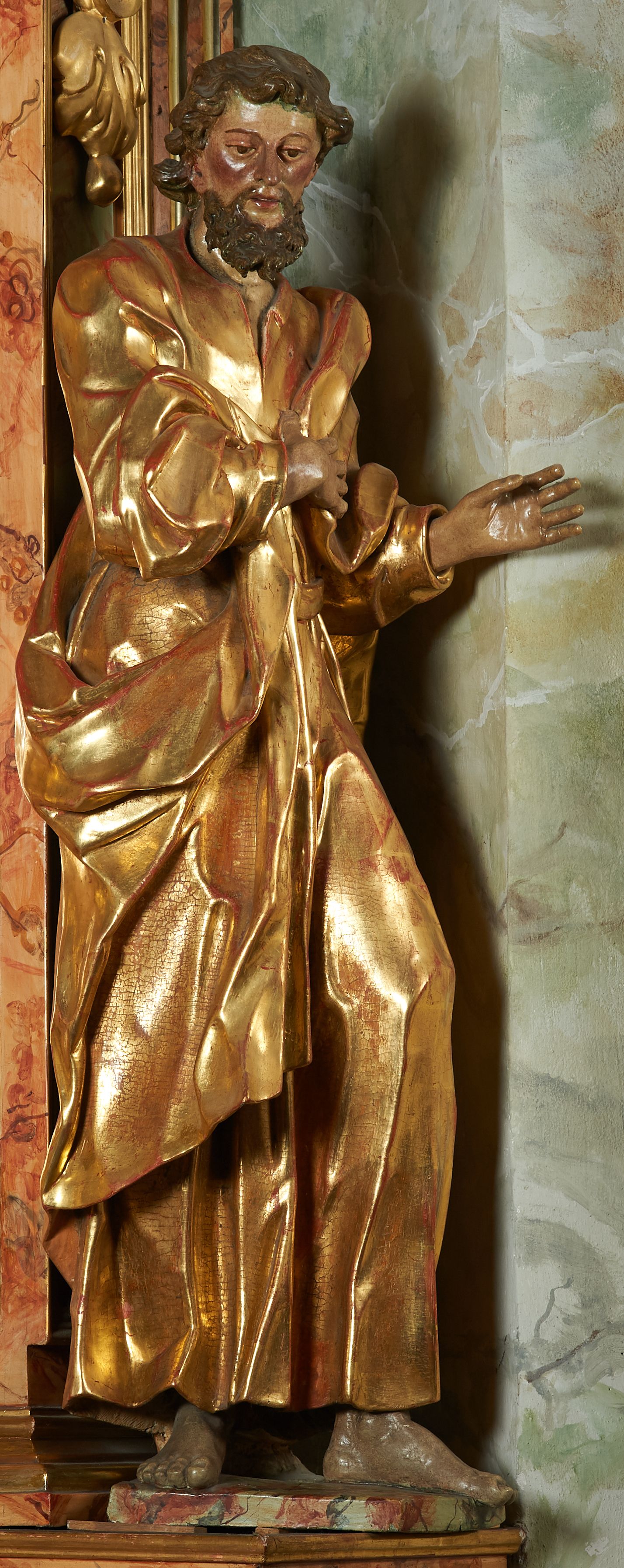 Rzeźba z ołtarza św. Katarzyny przedstawia świętego stojącego w lekkim wykroku z lewą nogą nieco wysuniętą do przodu. Głowa lekko pochylona, włosy kręcone, broda długa. Prawą rękę trzyma na piersi, lewa jest ugięta i uniesiona. Płaszcz i tunika bogato drapowane i złocone.