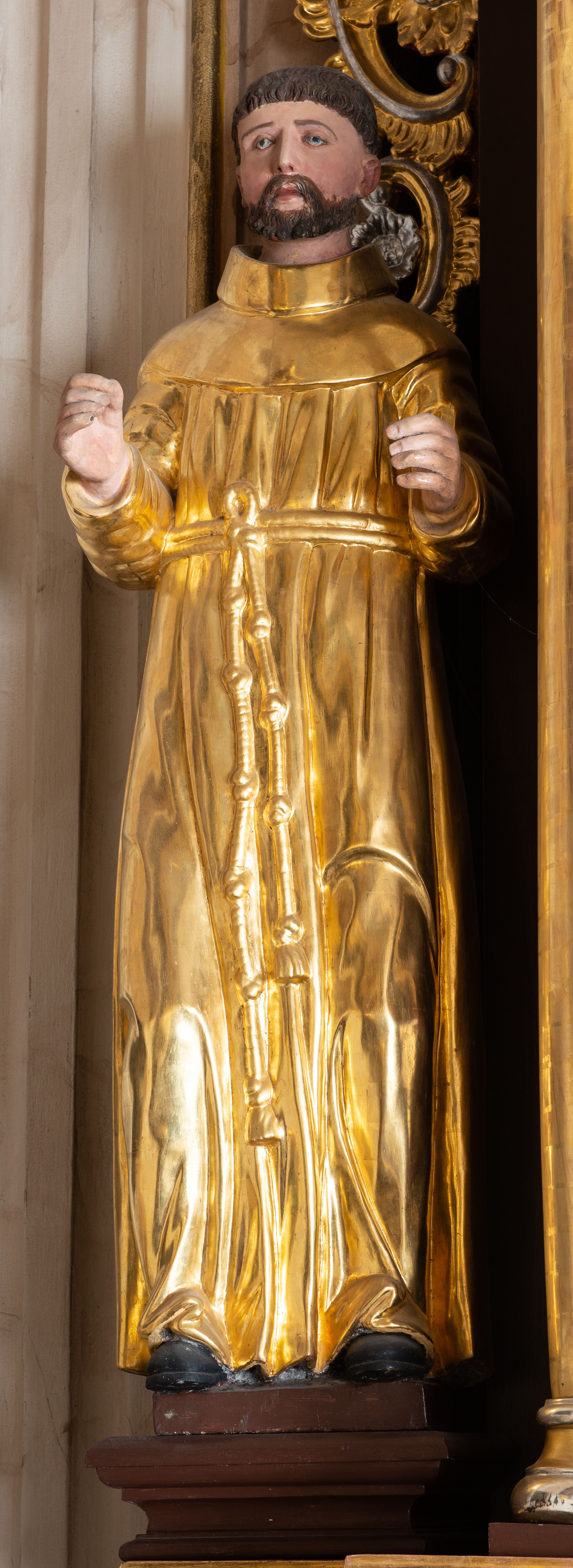 Całopostaciowa, drążona z tyłu figura nieznanego świętego zwróconego na wprost i stojącego w kontrapoście na niewysokiej, prostopadłościennej podstawie. Szeroką twarz charakteryzują delikatne rysy o długim, prostym nosie, małych, szeroko rozstawionych oczach i krótkim zaroście. Włosy są krótkie, ciemnobrązowe. Święty ubrany jest w złocony, drobno fałdowany habit zakonny przewiązany sznurem, na stopach ma brązowe buty. Zgięte w łokciach ręce wyciąga przed siebie.