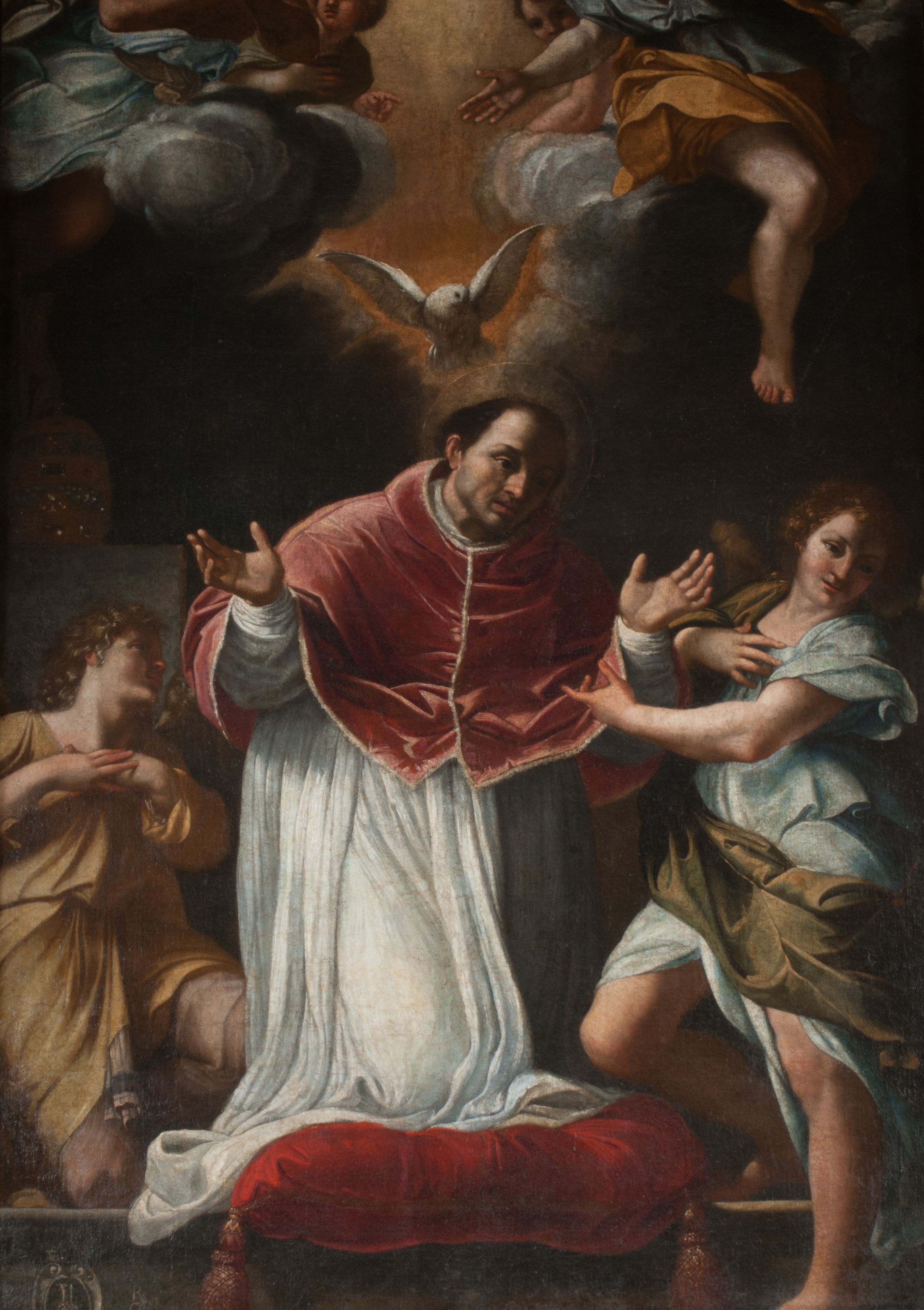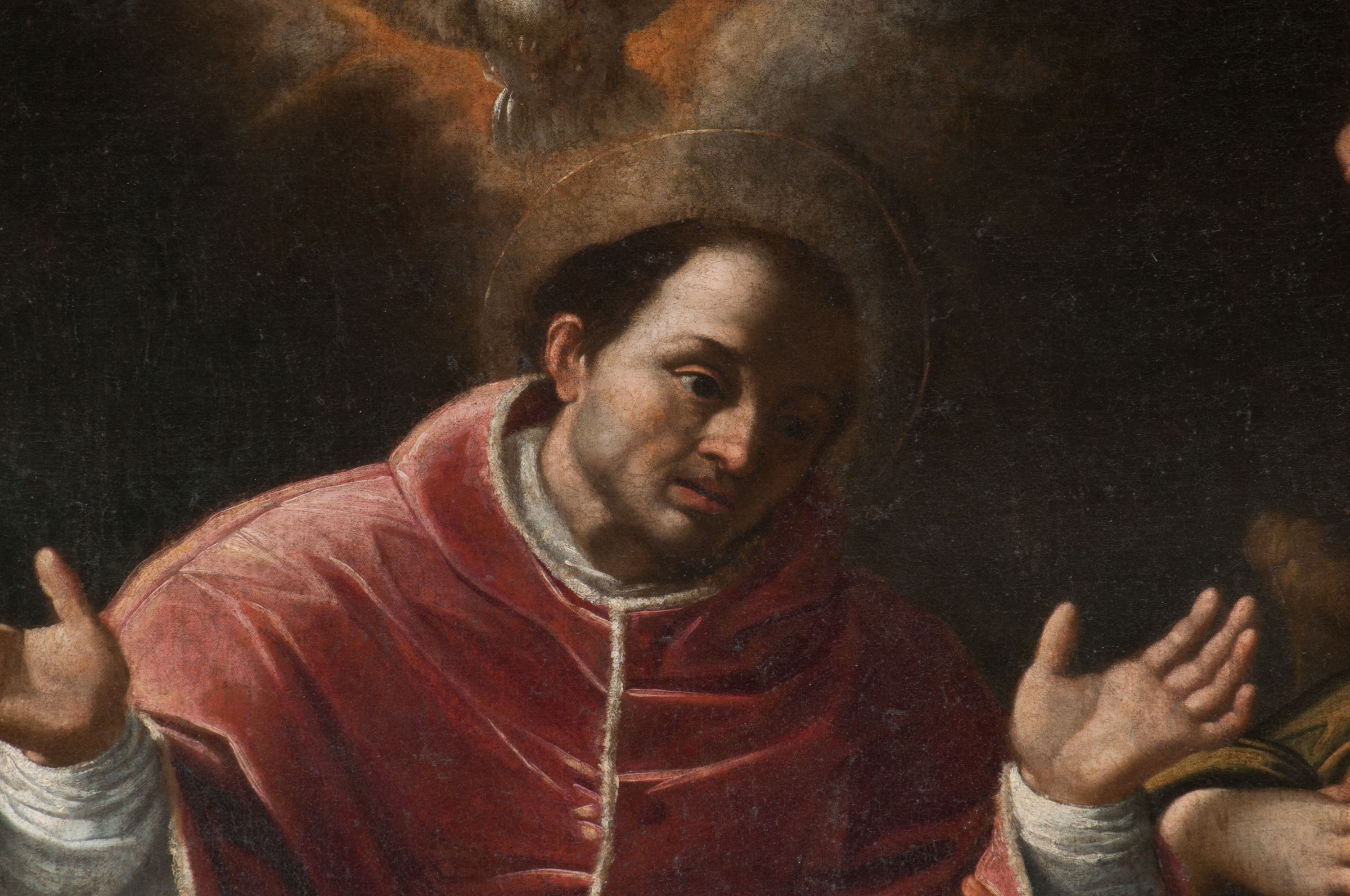 Kompozycja wielofigurowa i dwustrefowa. W strefie dolnej klęczący na poduszce papież Grzegorz Wielki podtrzymywany przez anioły. W strefie górnej gołębica Ducha Świętego oraz aniołowie na tle rozświetlonego otwartego nieba.