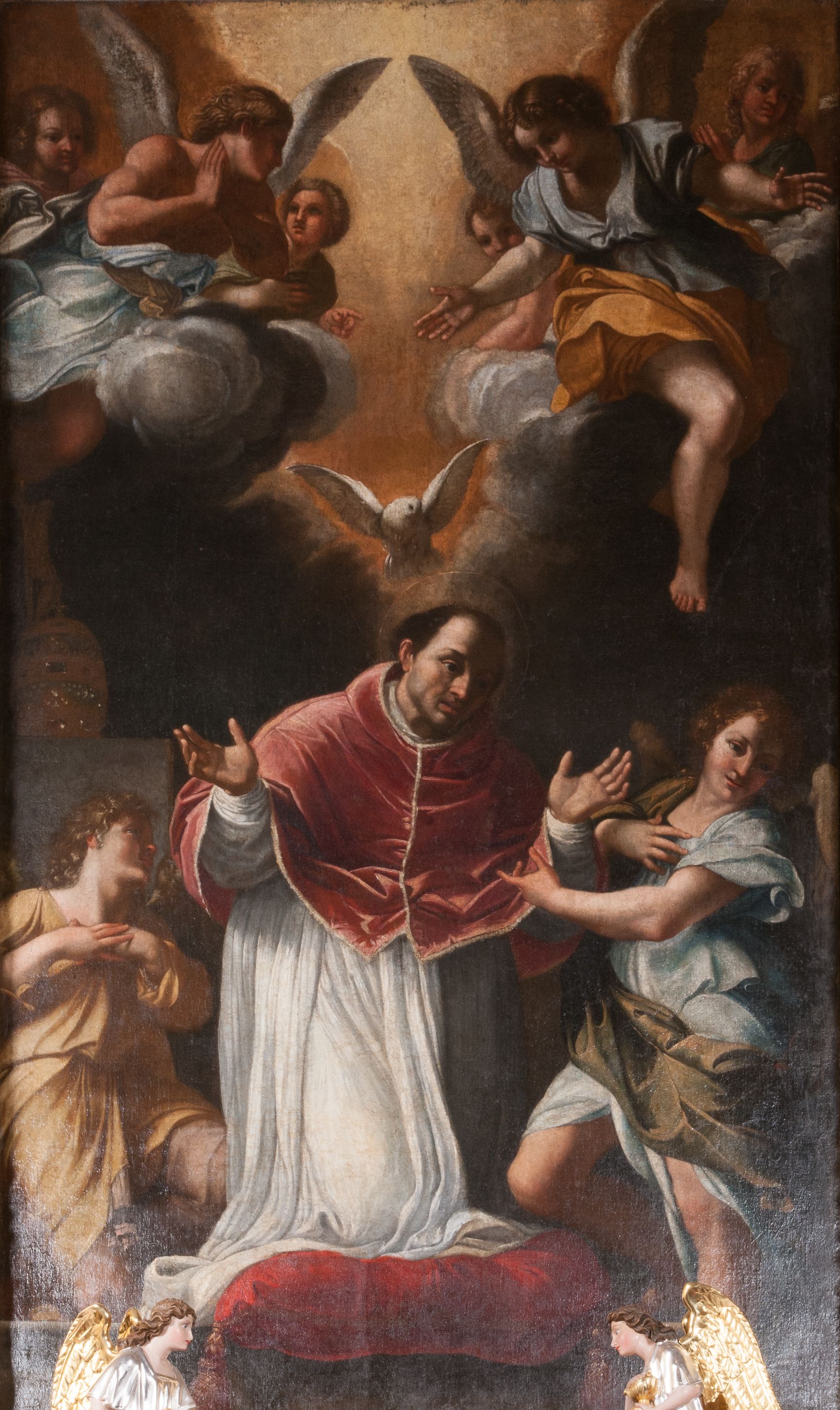 Obraz o kształcie stojącego prostokąta, ukazujący apoteozę św. Grzegorza Wielkiego. Kompozycja wielofigurowa, dwustrefowa. W dolnej strefie św. Grzegorz i aniołowie, w górnej gołębica Ducha Świętego i aniołowie na tle rozświetlonego otwartego nieba. Pośrodku św. Grzegorz, ukazany w trzech czwartych, klęczy na czerwonej poduszce ze złotymi chwostami. Po jego lewej stronie, na pierwszym planie, stoi anioł wymownym gestem w lewej ręki wskazuje na modlącego się papieża. Po jego prawej stronie, nieco w głębi, klęczący anioł z dłońmi splecionymi na wysokości piersi. Święty papież pochylony w lewą stronę, ręce wzniesione w geście oranta. Twarz pociągła, włosy ciemne, krótkie, odsłaniające uszy. Czoło wysokie, nos długi i prosty. Święty odziany w albę i purpurowy mucet ze złotą bordiurą. Anioł po lewej ukazany w dynamicznej pozie, w trzech czwartych. Lewa noga wyprostowana, prawa ugięta i uniesiona. Lewą ręką wskazuje na św. Grzegorza, prawa dłoń położona na piersi. Twarz okrągła, włosy krótkie, kręcone. Anioł odziany jest w krótką, błękitną tunikę, z krótkimi, szerokimi rękawami i brązowy płaszcz zarzucony na biodra. Anioł po lewej ukazany w pozycji klęczącej, w trzech czwartych, głowa odchylona. Ręce złożone na piersiach. Twarz pociągła, włosy krótkie, kręcone. Anioł odziany w beżową tunikę, opinająca ciało. W głębi po lewej widoczny fragment mensy ołtarza, na której tiara papieska. W górnej strefie grupa sześciu aniołów, siedzących na obłokach, w dynamicznych pozach, odzianych w rozwiane szaty. Dolna strefa ciemna, górna jasna, rozświetlona, chmury ciemne. W dolnej części obrazu nierozpoznany, częściowo zatarty herb lub gmerk z inicjałami wokół.