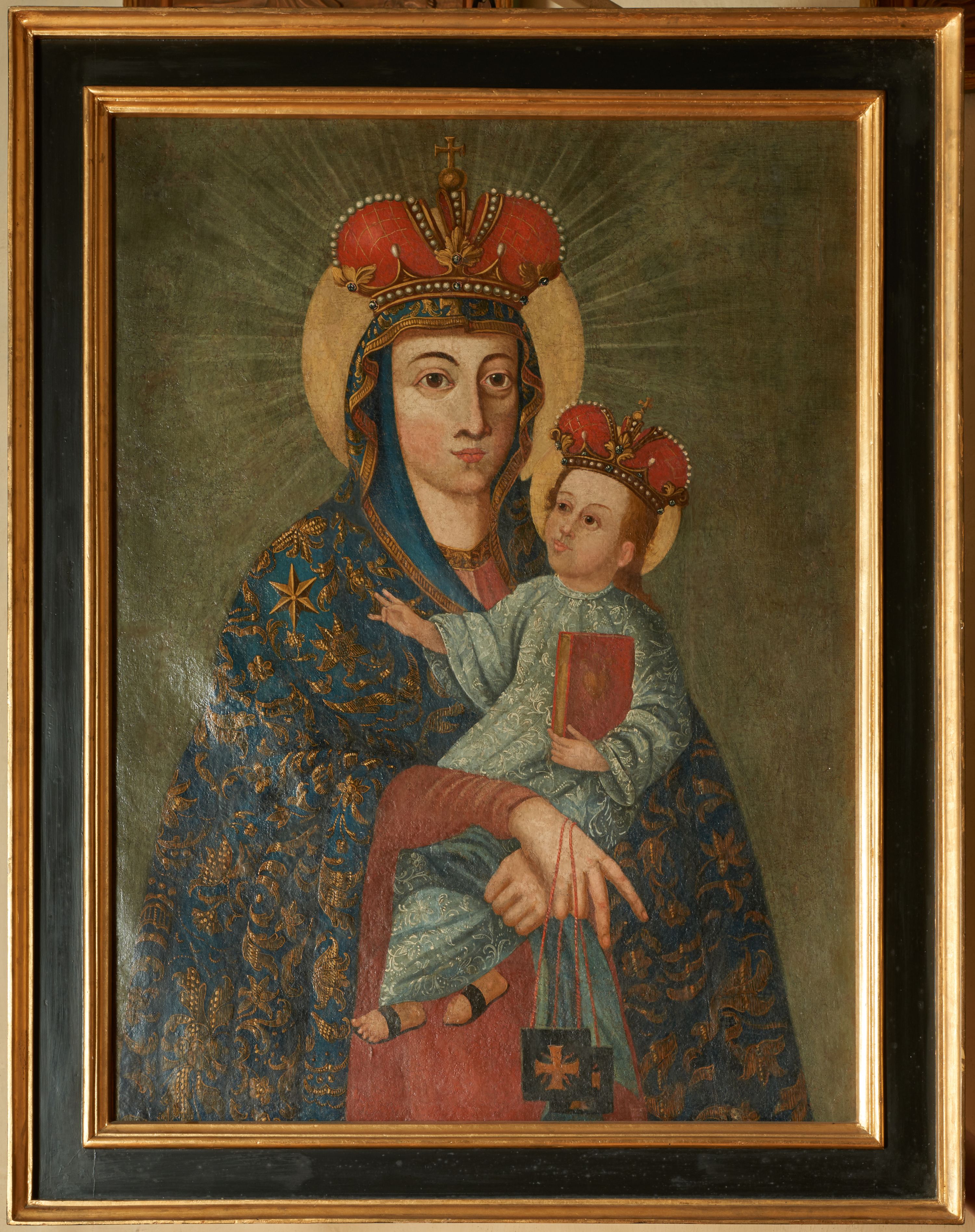Obraz w formie stojącego prostokąta. Na awersie wizerunek Matki Boskiej z Dzieciątkiem. Maria ukazana w półpostaci, zwrócona w trzech czwartych w lewo, obiema rękami podtrzymuje Dzieciątko, krzyżując dłonie, z których prawa jest w geście błogosławieństwa i trzyma szkaplerz. Twarz ma owalną, o regularnych rysach, dużych, migdałowatych oczach, wąskim, długim nosie i małych ustach o pełnych wargach. Maria ubrana jest w blado czerwoną suknię, przy szyi lamowaną złotą taśmą oraz ciemnoniebieski maforion o złoconym wzorze kwiatowym i złoconą lamówką, z sześcioramienną gwiazdą na prawym ramieniu, narzucony na głowę i ramiona. Na głowie ma koronę zamkniętą dekorowaną malowanymi perłami i kamieniami szlachetnymi. Dzieciątko w pozycji siedzącej, zwrócone w trzech czwartych w prawo, z uniesioną głową, prawą rękę unosi w geście błogosławieństwa, lewą przytrzymuje przy boku czerwoną księgę. Ma pociągła twarz o pełnych policzkach, o dużych, migdałowatych oczach, wąskim nosie i małych istach; okoloną jasnobrązowymi włosami sięgającymi ramion. Ubrane jest w luźną, jasnoniebieską tunikę o białym wzorze roślinnym, na stopach ma sandały, na głowie koronę zamkniętą dekorowaną malowanymi perłami i kamieniami. Wokół głów obojga nimby zamknięte oraz gloria promieniska naokoło Marii. Postacie ukazane na cieniowanym szaro-zielonym tle.