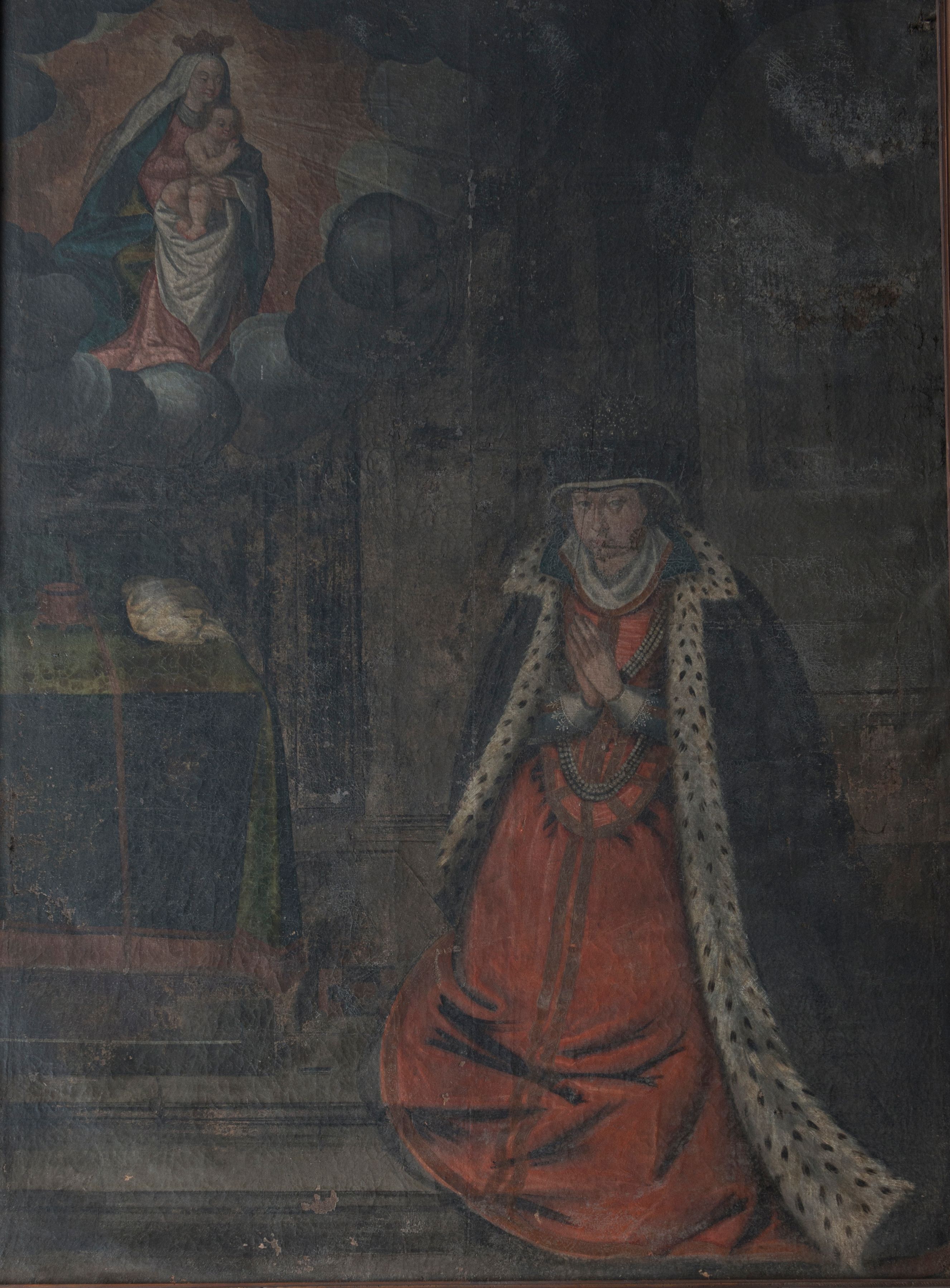 Obraz uzyskał kształt stojącego prostokąta, zamkniętego w profilowaną, ciemną ramę o rzeźbionych narożach. We wnętrzu komnaty o ścianach artykułowanych pilastrami ukazano klęczącą na stopniach Zofię z Komorowskich Giebułtowską. Komnata z prawej strony otwiera się półkolistą arkadą na kolejne pomieszczenie z perspektywicznie malowanymi podziałami architektonicznymi. Zofia klęczy przed stołem-domowym ołtarzykiem ustawionym na trzystopniowym podwyższeniu, nakrytym ciemnozieloną tkaniną, przeszytą przez środek złotą taśmą i lamowaną u spodu złotymi frędzlami. Na stole-ołtarzyku stoi złoty zegar tzw. kaflak, obok którego leży zwinięta biała tkanina. Ponad ołtarzykiem-stołem na szarobiałych obłokach unosi się siedząca Madonna z Dzieciątkiem w promienistej glorii. Madonna jest zwrócona w trzech czwartych w lewo. Na kolanach obiema rękami podtrzymuje siedzącego małego Jezusa. Maria ma owalną twarz z rumianymi policzkami, kształtnym nosem, wydatnymi ustami i lekko przymkniętymi oczami. Na głowie Matka Boska ma złotą koronę, spod której widoczny jest biały welon opadający na niebieski płaszcz podbity zielenią, który okrywa ramiona i częściowo nogi. Spod płaszcza widać czerwoną suknię z białym kołnierzem. Dzieciątko siedzące w kontrapoście jest nagie. Zwrócone w trzech czwartych w lewo siedzi na białej chuście. Ma pucułowatą twarz o rumianych policzkach, małym nosku i ciemnych oczach. Na głowie widoczne są jasne, kręcone włosy. Mały Jezus lekko nachylając się prawą rączką błogosławi klęczącą Zofię. Kobieta zwrócona jest w trzech czwartych w prawo, spoglądając w stronę widza. Ma złożone na piersi do modlitwy ręce. Zmarła ma dojrzałą, owalną twarz o rumianych policzkach, wydatnym nosie i nieznacznie podkrążonych, szeroko otwartych oczach. Jej czerwone usta są mięsiste. Ubrana jest w szeroką, purpurową spódnicę obszytą galonem i taki sam lamowany i przeszywany złotym galonem gorset. Gorset został ozdobiony dwoma potrójnymi sznurami pereł - krótszym i dłuższym. Spod spodu widać ciemnoniebieskie rękawy sukni zakończone koronkowym obszyciem oraz duży wywinięty kołnierz od przodu zakryty podwiką. Na szyi widoczny jest kosztowny naszyjnik. Ramiona okrywa opadający do ziemi ciemny płaszcz obszyty gronostajami. Zofia na głowie ma białą chustę osłaniającą pukle jasnych włosów, na której nałożony jest obszyty futrem kołpak, w górnej części dekorowany haftem z pereł.