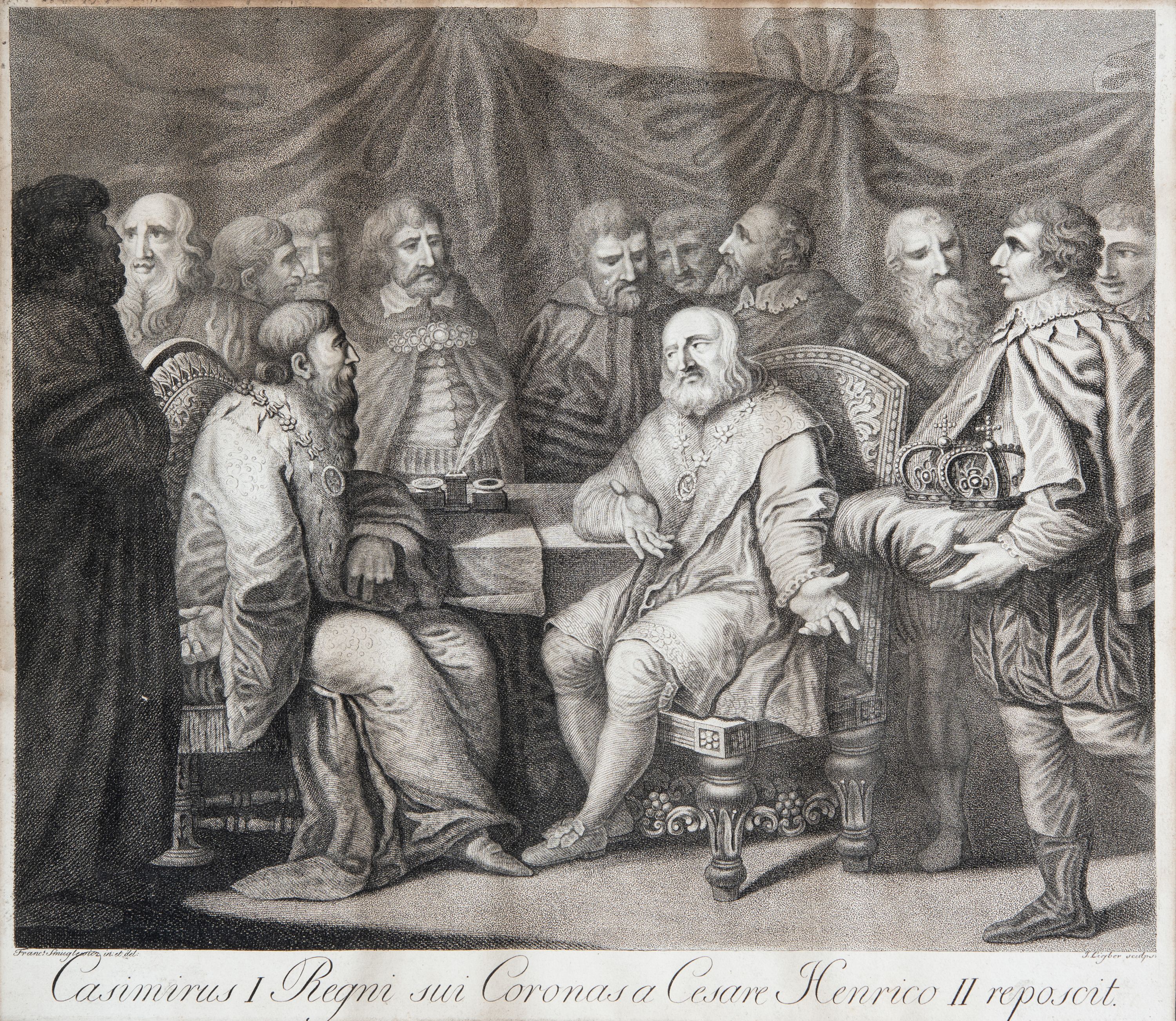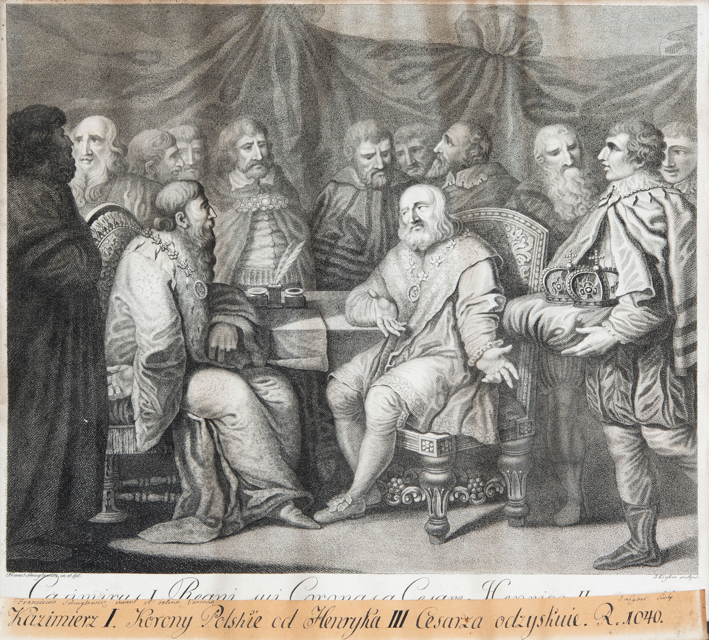 Na grafikę nałożony drugi podpis: "Franciscus Smuglewicz invenit et deline Varsovia", "I. Ligber sculp." i "Kazimierz I Korony Polskie od Henryka III Cesarza odzyskuie. R. 1040."