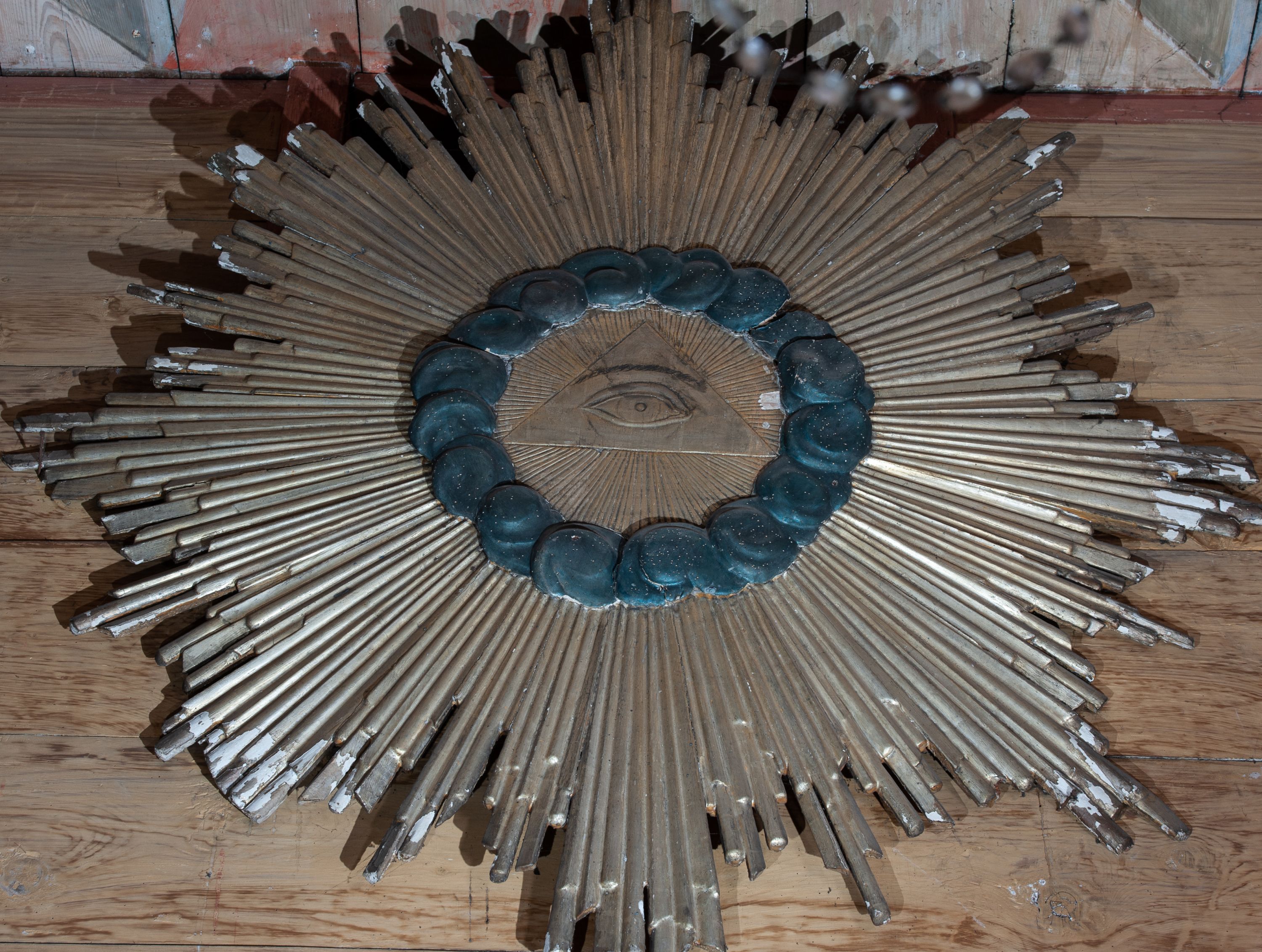 Drewniane, rzeźbione, polichromowane i złocone wyobrażenie Oka Opatrzności Bożej otoczonego błękitnymi obłokami i glorią z promieni o różnej długości. Datowane na XVIII wiek dzieło pochodzi zapewne z dekoracji rzeźbiarskiej jednego z ołtarzy.