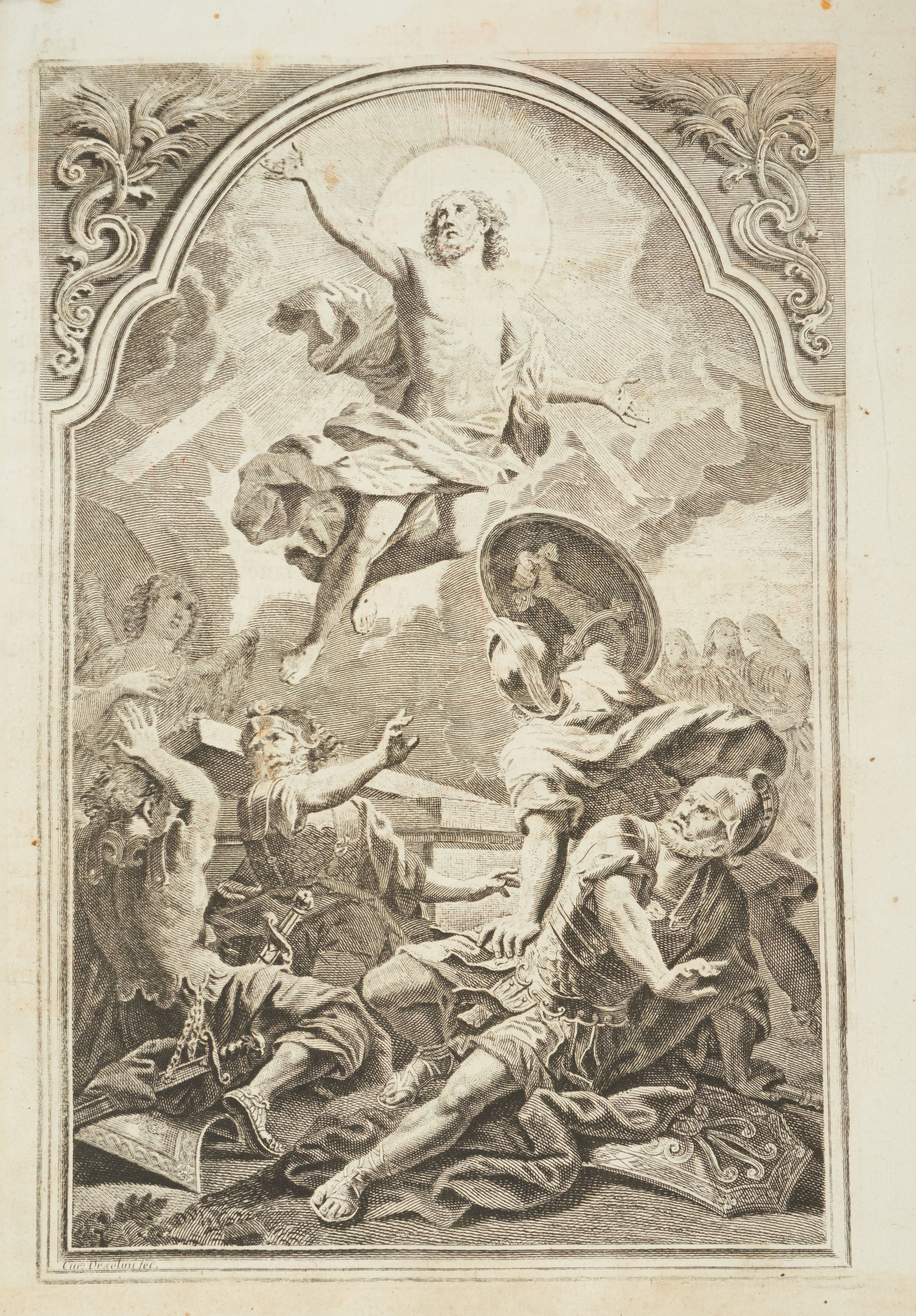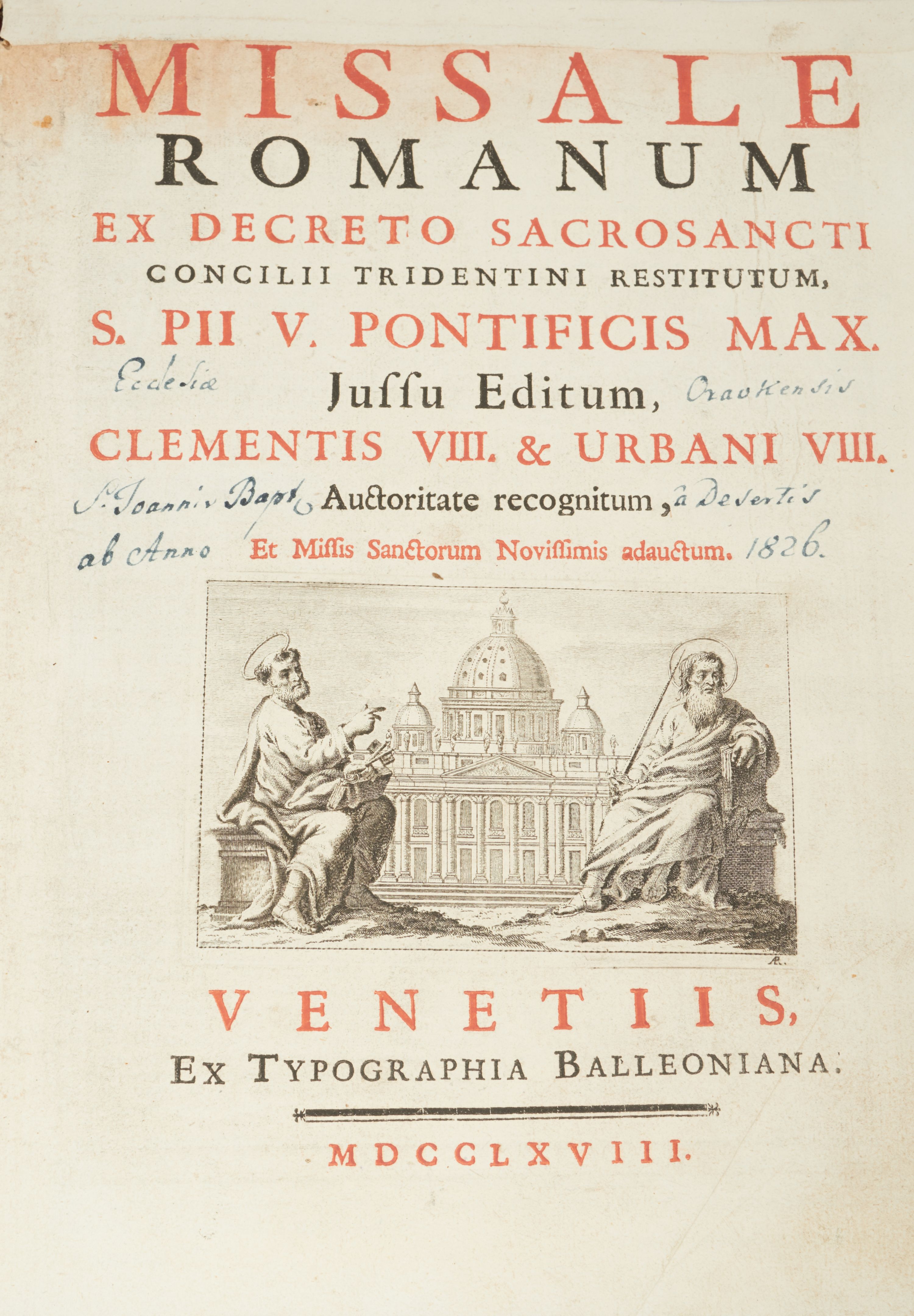 Okucia w kształcie częściowo ażurowych plakiet rozmieszczone na oprawie mszału wydanego w Wenecji w 1768 roku, na tle desek obciągniętych ciemnoczerwonym aksamitem. W narożach górnej i dolnej okładki trójkątne plakiety z motywami uskrzydlonych główek aniołów i ornamentem małżowinowym; przy krawędziach gładkie listwy łączące plakiety. Przy prawej krawędzi górnej okładziny i przy lewej krawędzi okładziny dolnej szyldziki zapięcia w formie bukietów kwiatów wyrastających z masek. Pośrodku okładzin rombowe plakiety z przedstawieniami – na górnej okładzinie Chrystus Salwator siedzący na obłokach, na dolnej Arma Christi; w narożach grzebienie ornamentu rocaille’owego (?) oraz motywy muszli i wolut.