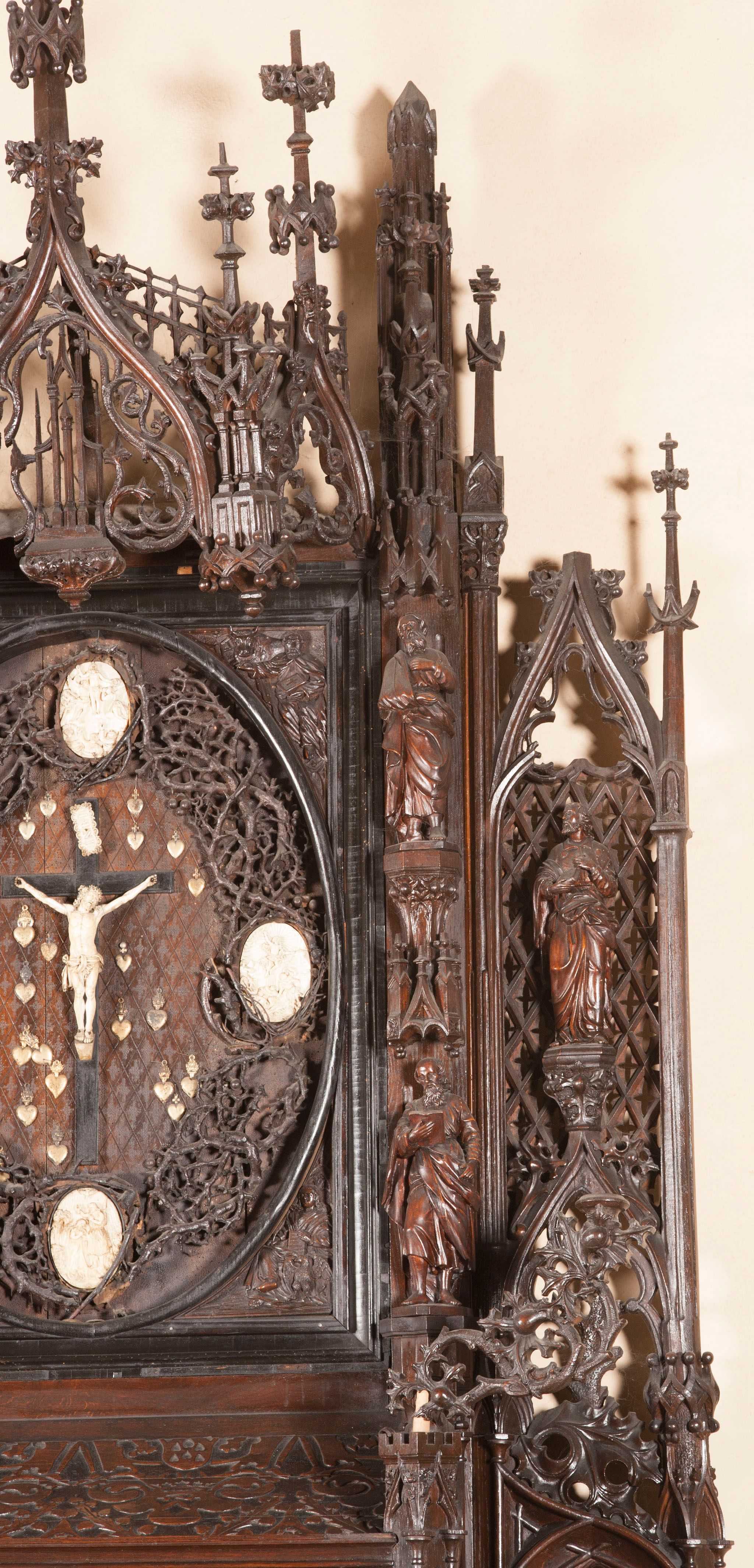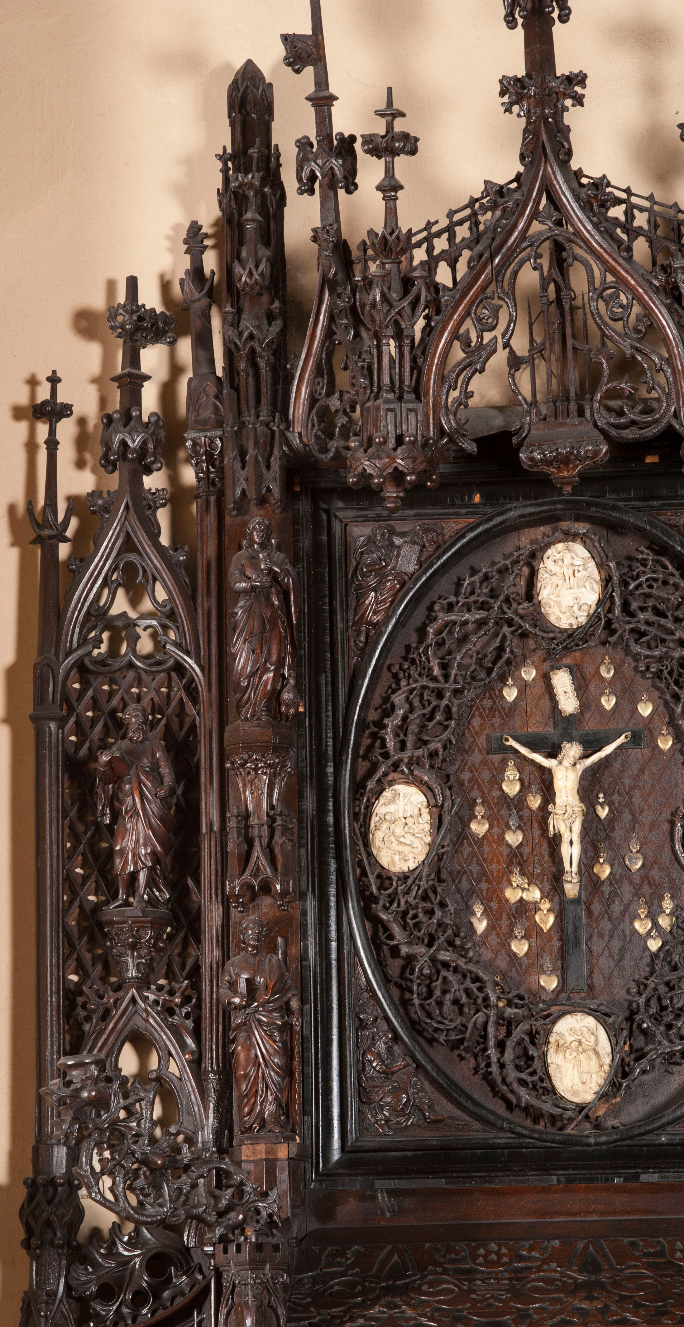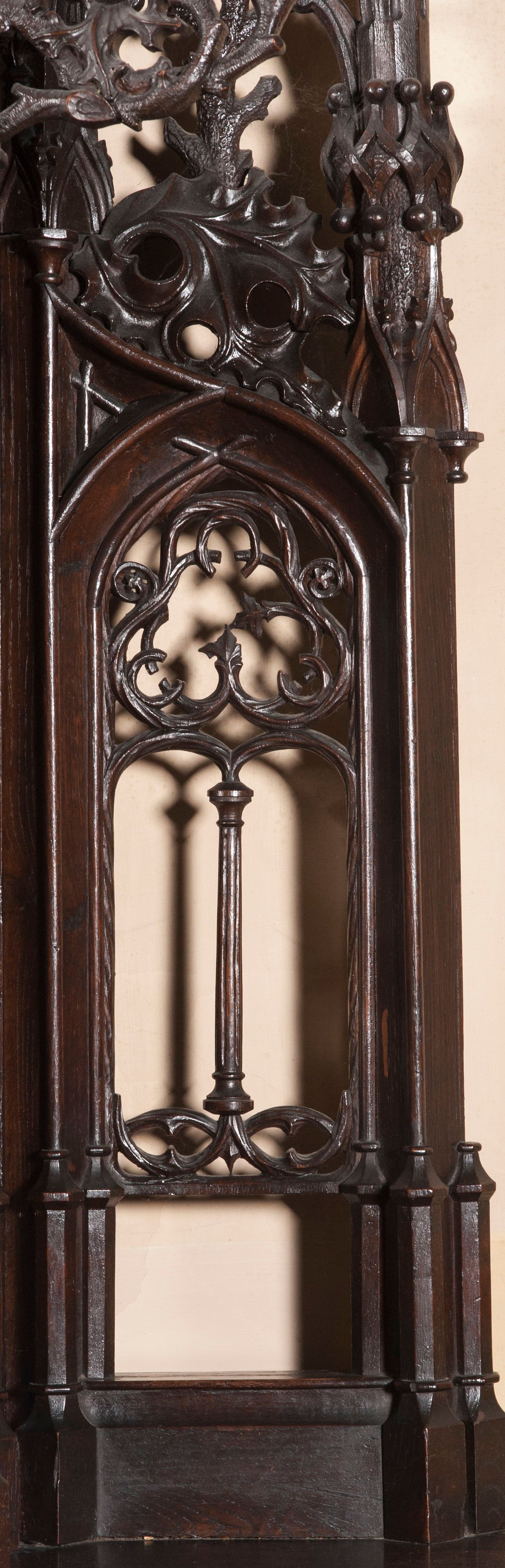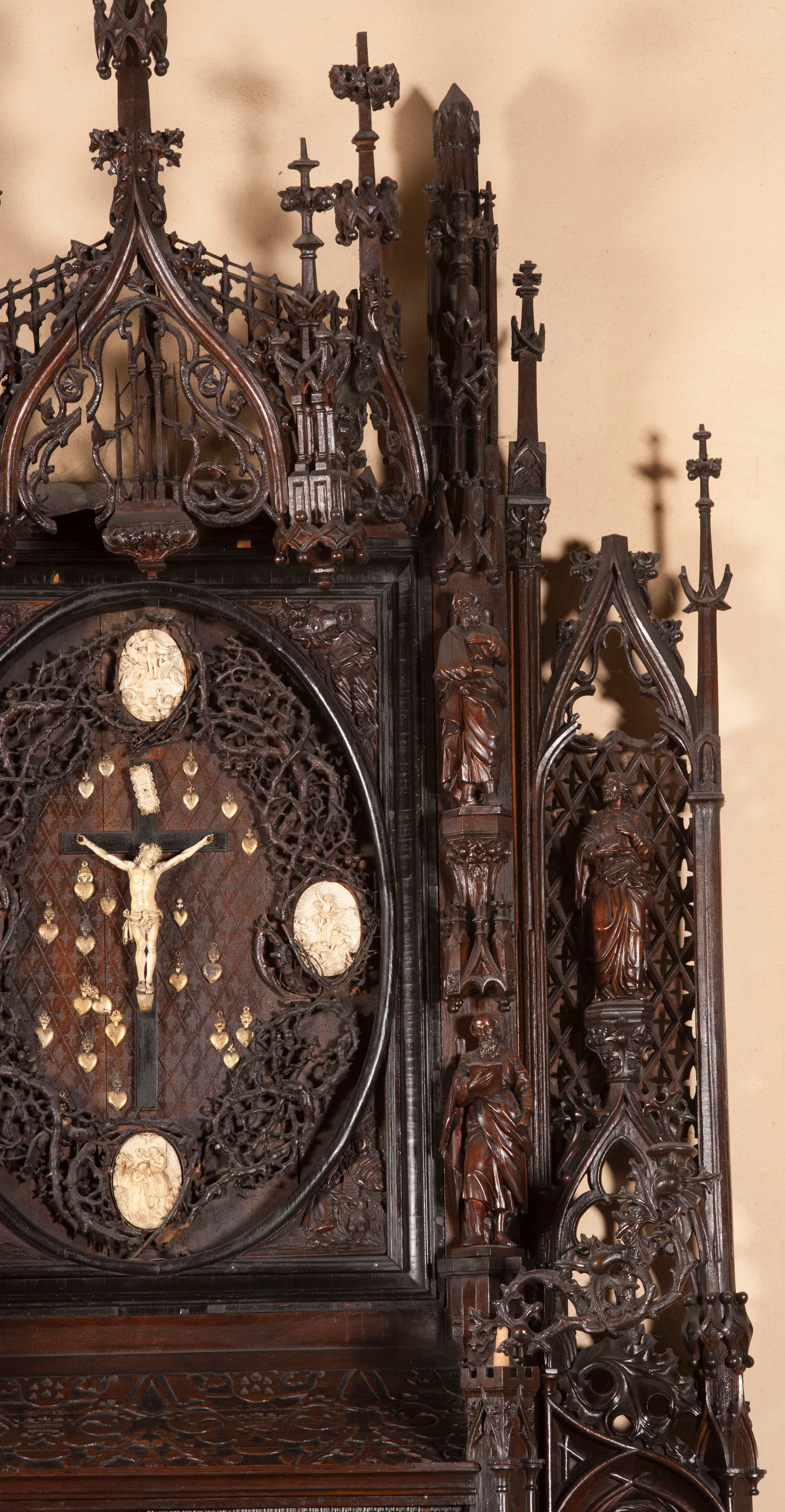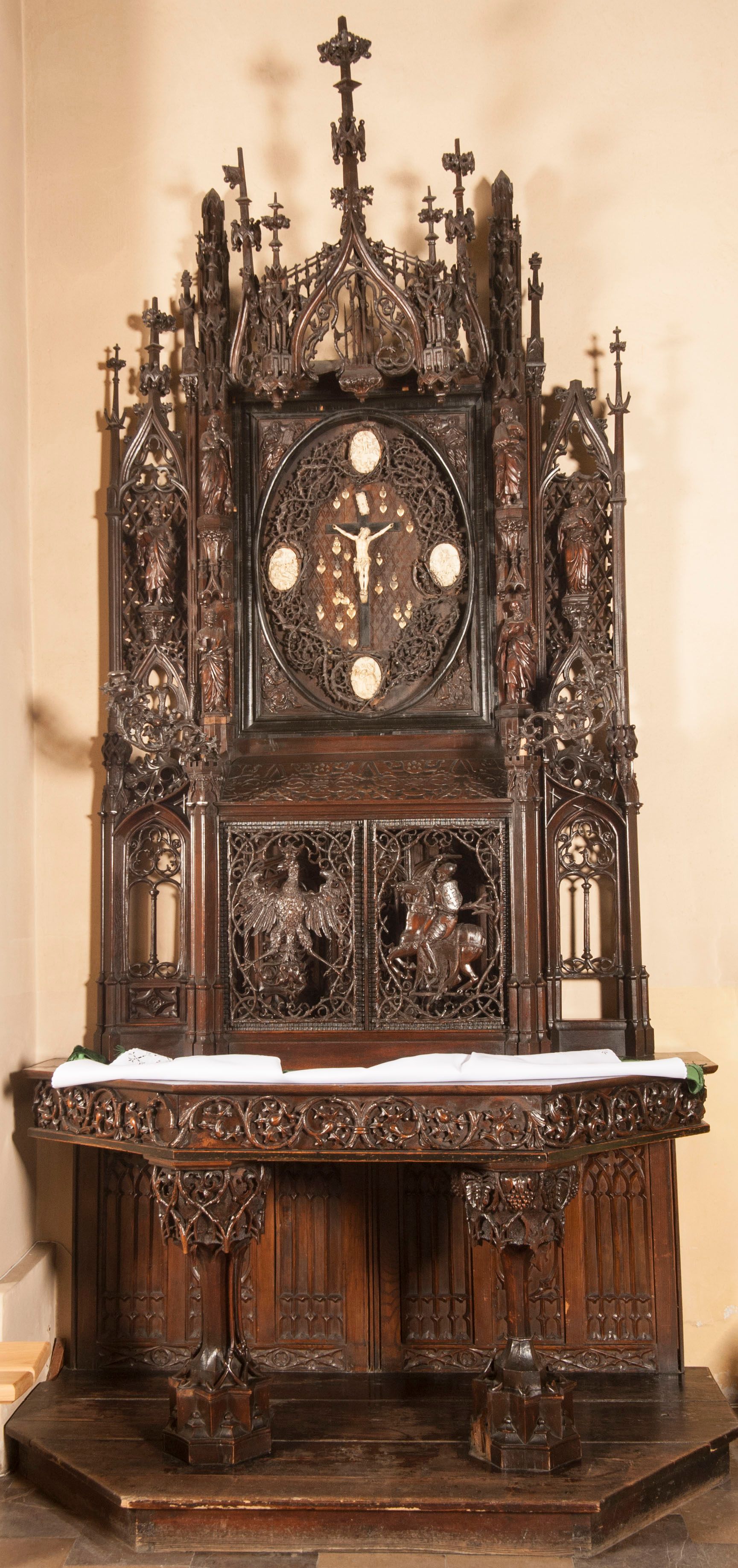 Ołtarz architektoniczny, dwukondygnacyjny ze zwieńczeniem, trójosiowy. Neogotycki na trapezowym postumencie. Mensa wsparta na dwóch kolumnach o schodkowych, bazach w formie ośmioramiennych gwiazd na siedmiobokach z wklęsłymi ramionami. Z każdego ramienia gwiazd strzeliście unosiła się ku kapitelowi wzdłuż trzonu służka, tworząc u dołu romboidalną, wklęsłą siatkę. Struktura ta zachowała się mniej niż w połowie na lewej kolumnie. Kapitel lewy ornamentalnie pokryty regularną siatką ze stylizowanych, suchych gałęzi, które tworzą trzy strefy pól ornamentalnych. Dolne przypominają ostre łuki, krzyżują się w nich gałęzie. Środkowe, romboidalne są puste a górne wypełniają sploty suchego akantu. Prawy kapitel posiada podobne podziały pól, różni się wypełnieniem górnej ze stref, gdzie przestrzeń całkowicie zajmują na przemian bujne winne grona oraz pochylające się kłosy zbóż. Zaplecek pod mensą, od frontu podzielono na sześć stref. Na dwóch zewnętrznych i dwóch środkowych znajdują się przedstawienia płaskorzeźbionych łuków okiennych z maswerkami. Druga płaszczyzna od lewej i prawej ozdobiona jest płaskorzeźbą roślinną. Ryzalitowana w części środkowej kondygnacja pierwsza stanowi tabernakulum na cokole. Zadaszenie spadziste pokryte różnorodnym zdobieniem, flankowane czworokątnymi filarami, na których kapitelach wspierają się ramiona ostrych łuków z wimpergami. Powyżej kapitele filarów stanowią blanki z których wyrastają ażurowe formy zbudowane z kilku esownic stylizowane na oset, zakończone profitkami. Widać wnętrze tabernakulum przez ażurowe, dwuskrzydłowe drzwiczki. Na lewych jest przestrzenna rzeźba Orła w koronie osadzona w nieznacznie uszkodzonej oprawie ze splotów gałęzi. Z prawej podobnie wykonane przedstawienie Pogoni Litewskiej. Konny rycerz ma złamany miecz. W centrum ołtarza w prostokątnej ramie znajduje się owalne pole wewnątrz otoczone ciasnym splotem guzowatych gałęzi. W środkowych punktach owalu z gałęzi wstawiono owalne płaskorzeźby z kości słoniowej ze scenami z życia Chrystusa. W samym środku niewielka rzeźba Jezusa Ukrzyżowanego. Ramę główną flankują postacie Ewangelistów po dwóch z każdej strony, jeden nad drugim, na postumentach i pod gotyckimi baldachimami, najwyższy jest okazalszy. Zwieńczenie ołtarza stanowi wysunięta balustrada zbudowana z ostrołukowych ramion ze sterczynami, centralne ramiona zbiegają się i łączą w sterczynę zakończoną krzyżem. Ołtarz flankowany strzelistymi formami z typowych dla neogotyckiej stylizacji elementami architektonicznymi, w które wkomponowano po jednej postaci świętych z każdej strony.