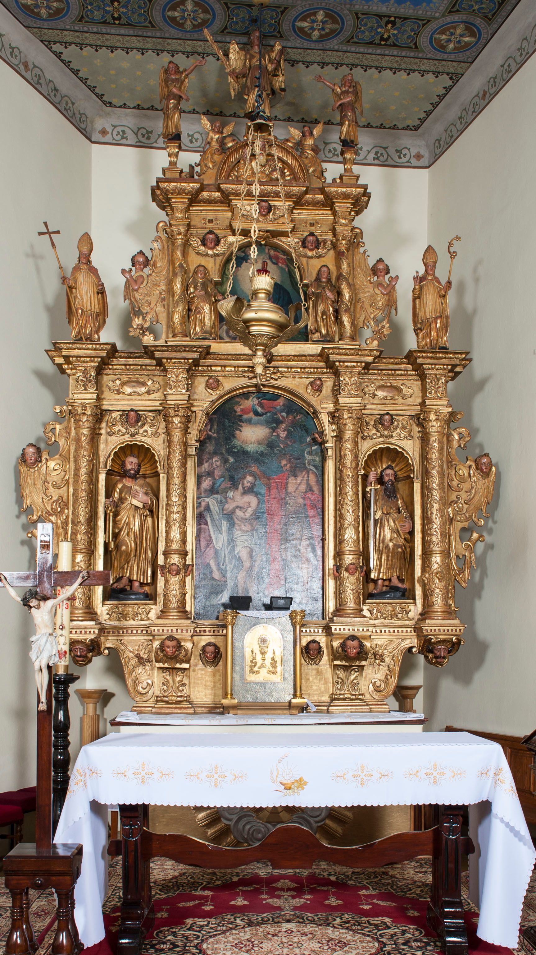 Ołtarz architektoniczny, z wydzieloną predellą, trójosiowy, dwukondygnacyjny ze zwieńczeniem. Predella węższa od nastawy, rozszerzająca się ku górze. Dolna kondygnacja artykułowana kolumnami o trzonach przedzielonych opaską w jednej trzeciej wysokości, zdobionych główkami aniołków, girlandami i dekoracją kandelabrową; kapitele kompozytowe; w osiach zewnętrznych kolumny nadwieszone na konsolach, w osiach wewnętrznych ustawione na postumentach. Kolumny wspierają belkowanie i gzyms występujące nad nimi. W polu środkowym prostokątna nisza zamknięta półkoliście, w niej obraz: Chrzest Chrystusa; w polach bocznych mniejsze nisze prostokątne zamknięte półkoliście, muszlowe, w nich rzeźby: Św. Piotr i Św. Paweł. Górna kondygnacja ujęta kolumnami o kręconych trzonach z dekoracją roślinną i kompozytowych kapitelach, wspierającymi belkowanie i profilowany gzyms. W polu środkowym nisza zamknięta półkoliście w niej obraz: Matka Boska z Dzieciątkiem. Po bokach obrazu rzeźby: Św. Anna (?) i Św. Marcin (?). Dolna i górna kondygnacje flankowane rzeźbionymi, ażurowymi uszakami z motywem herm aniołów. W osiach kolumn dolnej kondygnacji rzeźby: Św. Wojciech i Św. Stanisław. Zwieńczenie w kształcie półkolistego przyczółka wspartego na konsoli wchodzącej w pole górnej kondygnacji. W polu zwieńczenia płaskorzeźbione, półplastyczne przedstawienie Boga Ojca w popiersiu, flankowane wolutami z półpostaciami dwóch uskrzydlonych aniołów. Po bokach w zwieńczeniu, w osiach kolumn górnej kondygnacji, rzeźby uskrzydlonych aniołów. W szczycie ołtarza na konsoli rzeźba: Św. Michał Archanioł. W przyłuczach nisz na obrazy, ponad niszami na rzeźby, w predelli, na konsolach i postumentach kolumn dolnej kondygnacji oraz na konsoli poniżej zwieńczenia uskrzydlone główki aniołków. Ponadto poniżej nisz, w tle kolumn oraz na belkowaniu płyciny ornamentalne z motywów roślinnych i motywy rautów. Struktura ołtarza, rzeźby i ornamenty złocone, karnacje i włosy polichromowane.