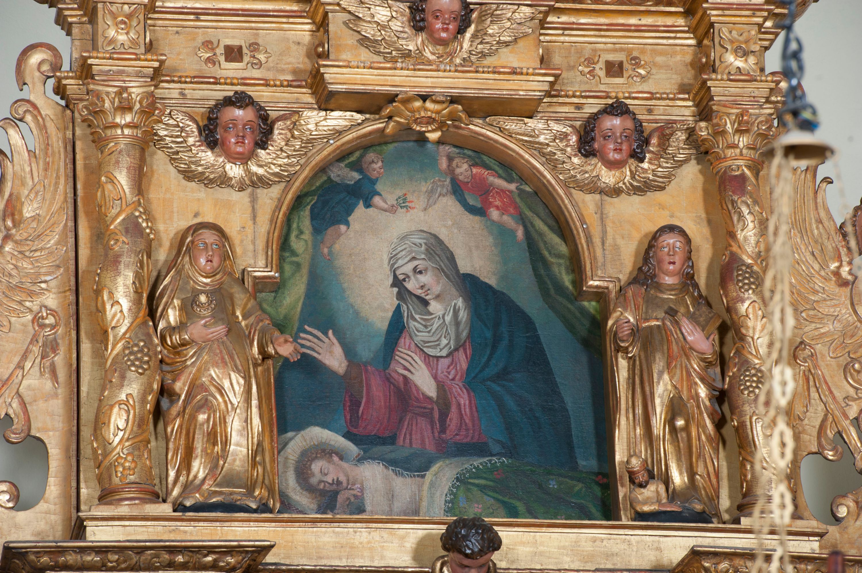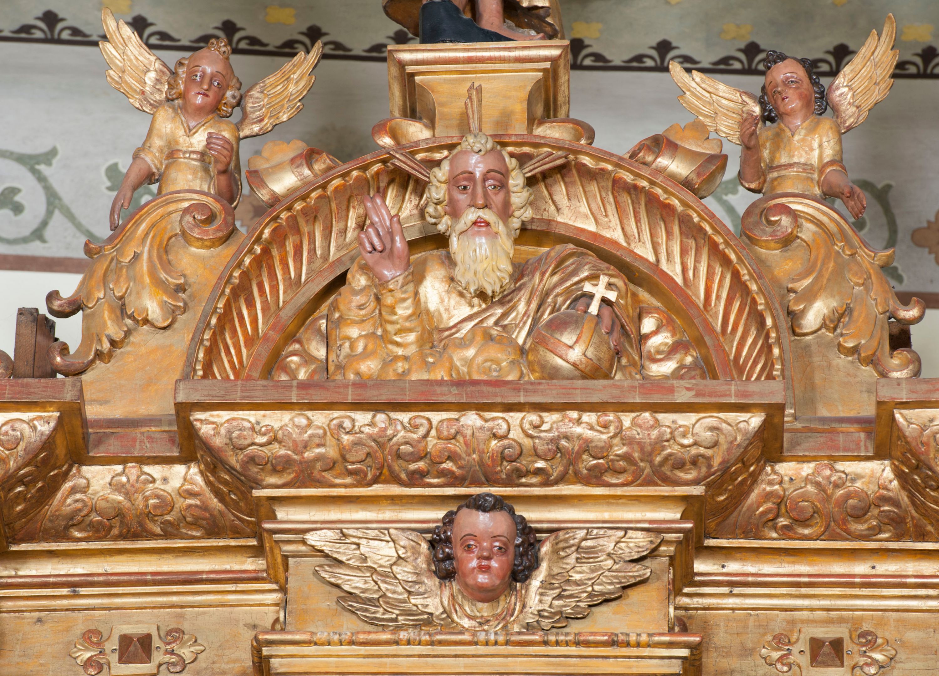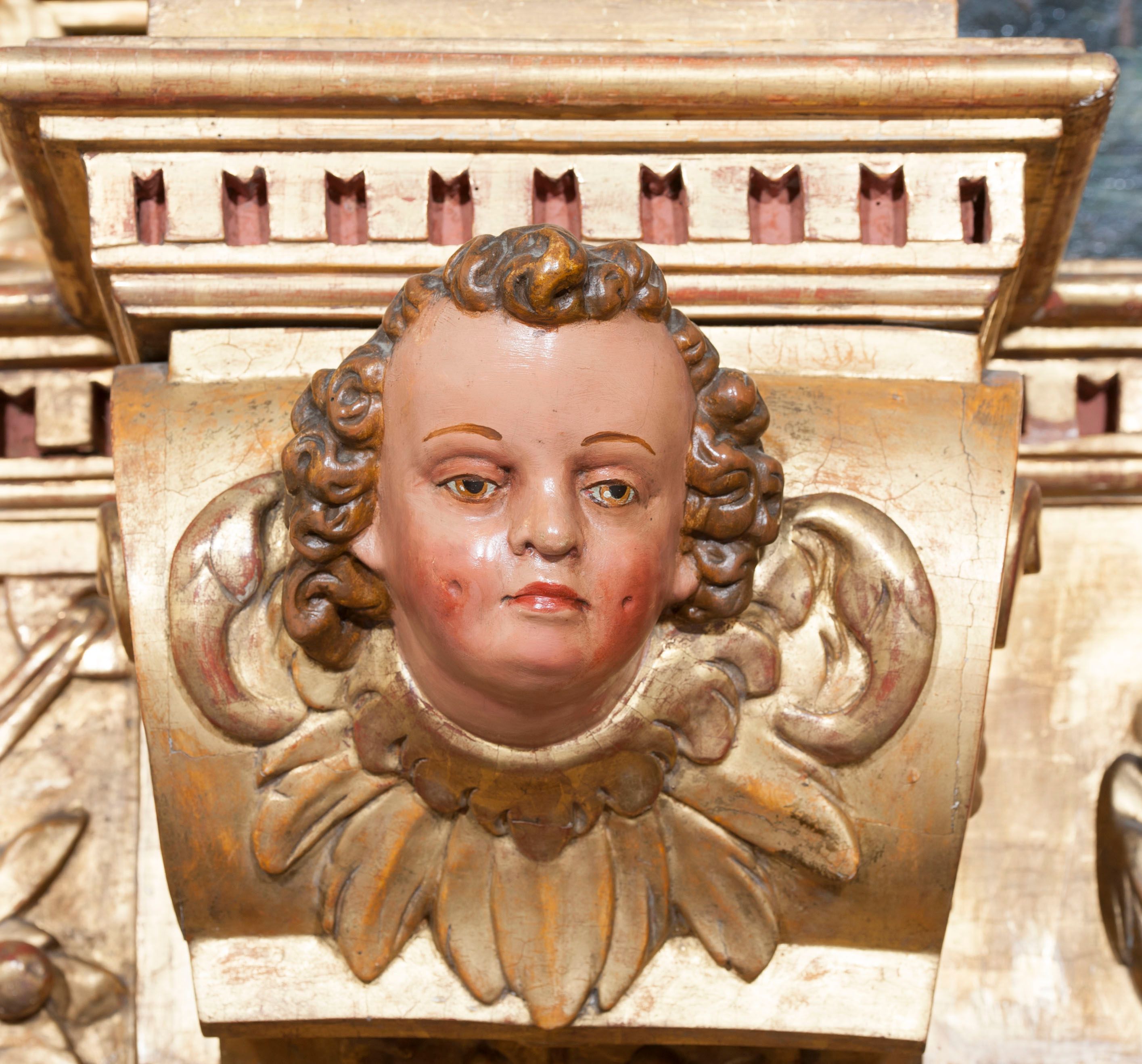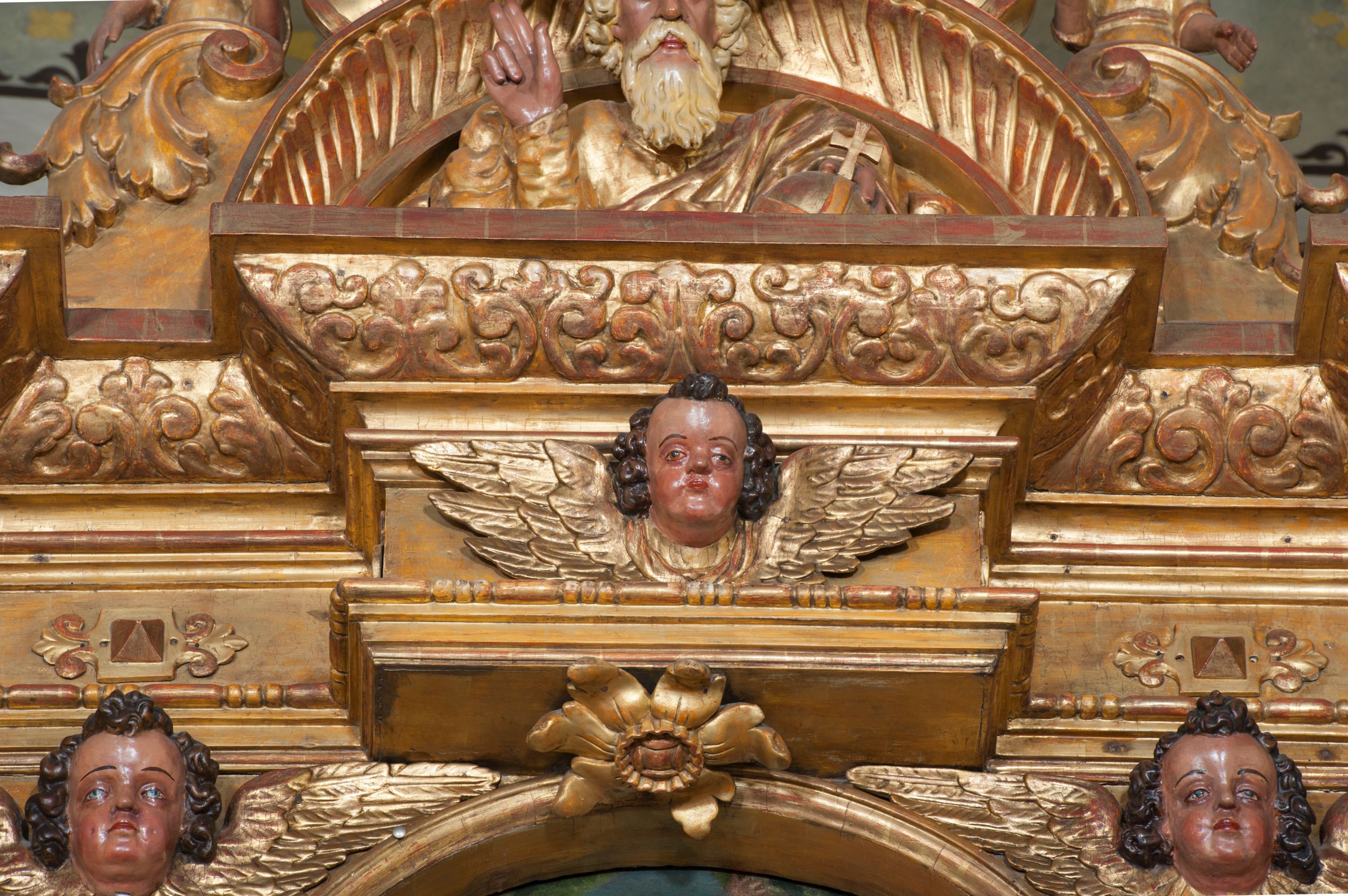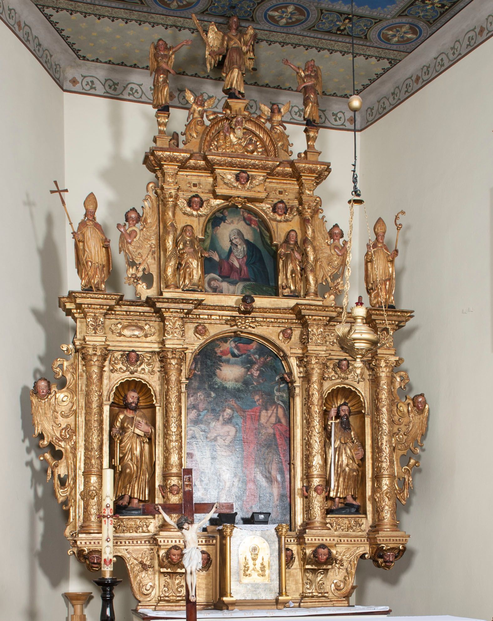 Ołtarz wyjątkowo bogaty, „rojący się od rzeźb”, tryptykowy.