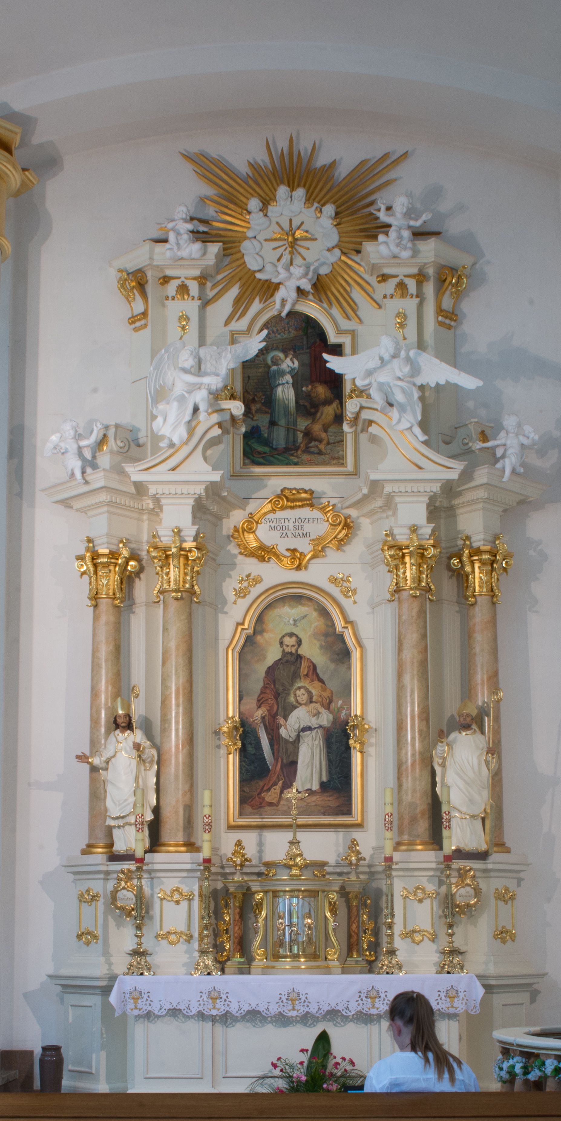 Nastawa architektoniczna, jednoosiowa, dwukondygnacyjna ze zwieńczeniem, ustawiona na dwustrefowym cokole. Ołtarz drewniany, prostopadłościenny z drewnianą mensą, w partii antepedium wyodrębnione zewnętrzne prostopadłościany, dekorowane płycinami. Na ołtarzu znajduje się tabernakulum w formie drewnianej skrzynki o wypukłym licu i wklęsłych bokach, ustawionej na cokole, flankowanej parą pilastrów o trzonach w formie spływów wolutowych oraz zewnętrzną parą kolumienek. Podpory dźwigają profilowany gzyms, na którym znajduje się tron wystawienia w formie cokołu. Drzwiczki w formie stojącego prostokąta z aplikowaną sceną Chrystusa w świątyni. Cokół dwustrefowy z wyodrębnionymi prostopadłościanami dekorowanymi w pierwszej strefie płycinami, w drugiej rocaille'owymi płycinami. Pierwsza kondygnacja flankowana dwiema parami pilastrów i stojących przed nimi kolumn ustawionych na cokołach, druga para zwrócona pod kątem na zewnątrz. Podpory dźwigają wyłamane na ich osi fragmenty belkowania, środkowa para również przerwany, falisty przyczółek. Na belkowaniu i przyczółku siedzi para puttów i para adorujących aniołów. Pomiędzy parami kolumn ustawione figury, u dołu z kartuszami z napisami „św(ięty) Stanisław” i „św(ięty) Wojciech”. W polu głównym znajduje się wnęka w formie stojącego prostokąta zamkniętego łukiem półkolistym nadwieszonym z uskokiem, ujęta profilowaną ramą z obrazem św. Józefa z małym Jezusem. Ponad obrazem kartusz ujęty stylizowanym rocaille'em z napisem „ŚWIĘTY JÓZEFIE / MÓDL SIĘ / ZA NAMI”. Druga kondygnacja flankowane dwiema parami pilastrów, w tym zewnętrzną ustawioną pod kątem na zewnątrz o trzonach przechodzących w woluty spływające na cokoły na belkowaniu pierwszej kondygnacji nastawy. Podpory dźwigają gzyms przerwany na polem. Całość zamknięta medalionem z gołębicą Ducha Świętego w glorii, otoczonym wieńcem z obłoków i uskrzydlonych główek anielskich, w glorii promienistej. U dołu medalionu i na gzymsie znajdują się putta. W polu wnęka w formie stojącego prostokąta zamkniętego łukiem półkolistym nadwieszonym w ramie, z obrazem św. Ignacego Antiocheńskiego. Struktura niemal w całości polichromowana w kolorze białym, trzony kolumn polichromowane na sposób imitujący marmoryzację w kolorze biało-różowym, profile i ornamentyka złocone.