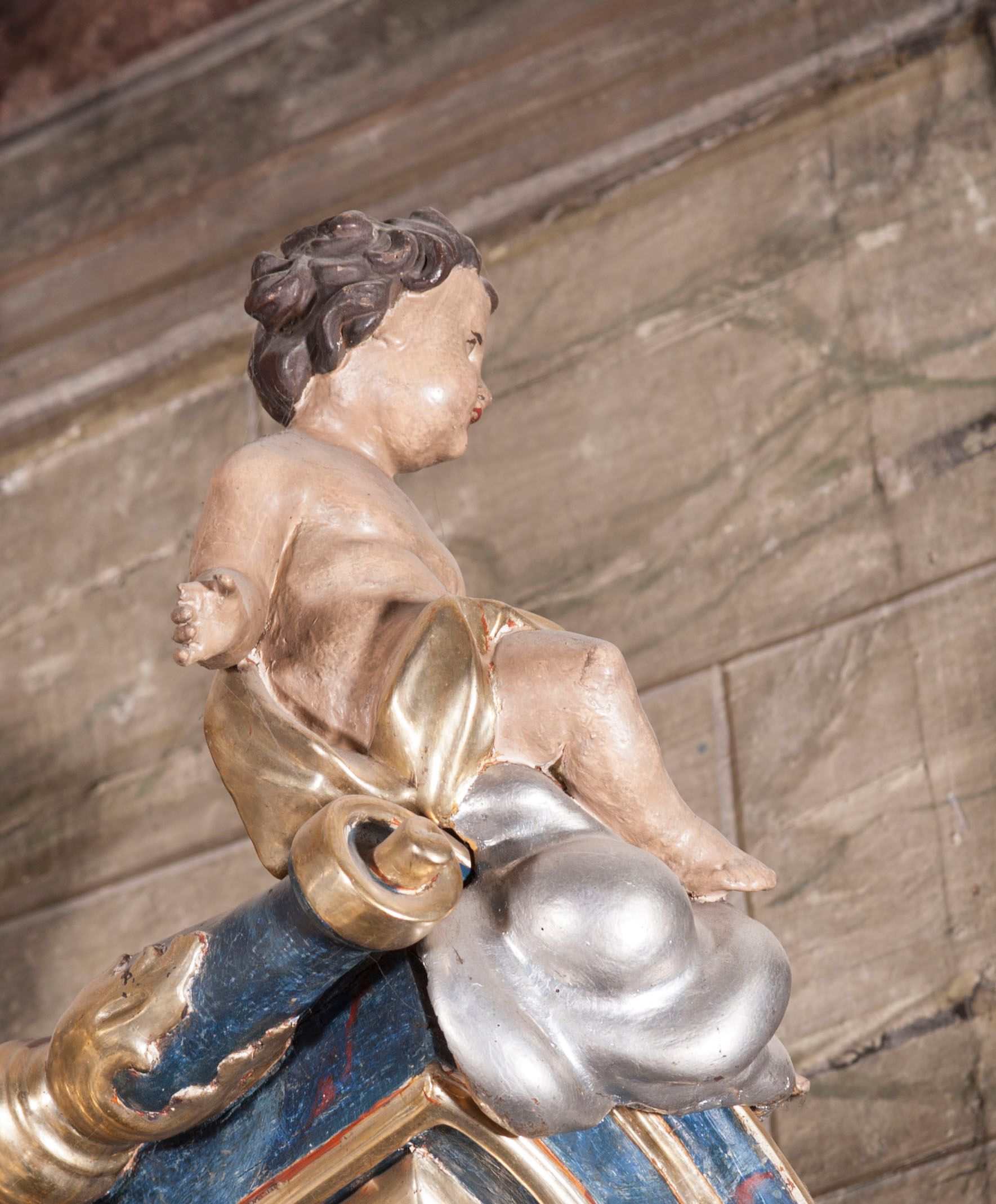 Liczne przetarcia warstwy polichromii, ubytki warstwy gruntu, zwłaszcza w partii belkowania, ołtarza i mensy. Retabulum odnawiane w latach 1887, 1955, 1976.