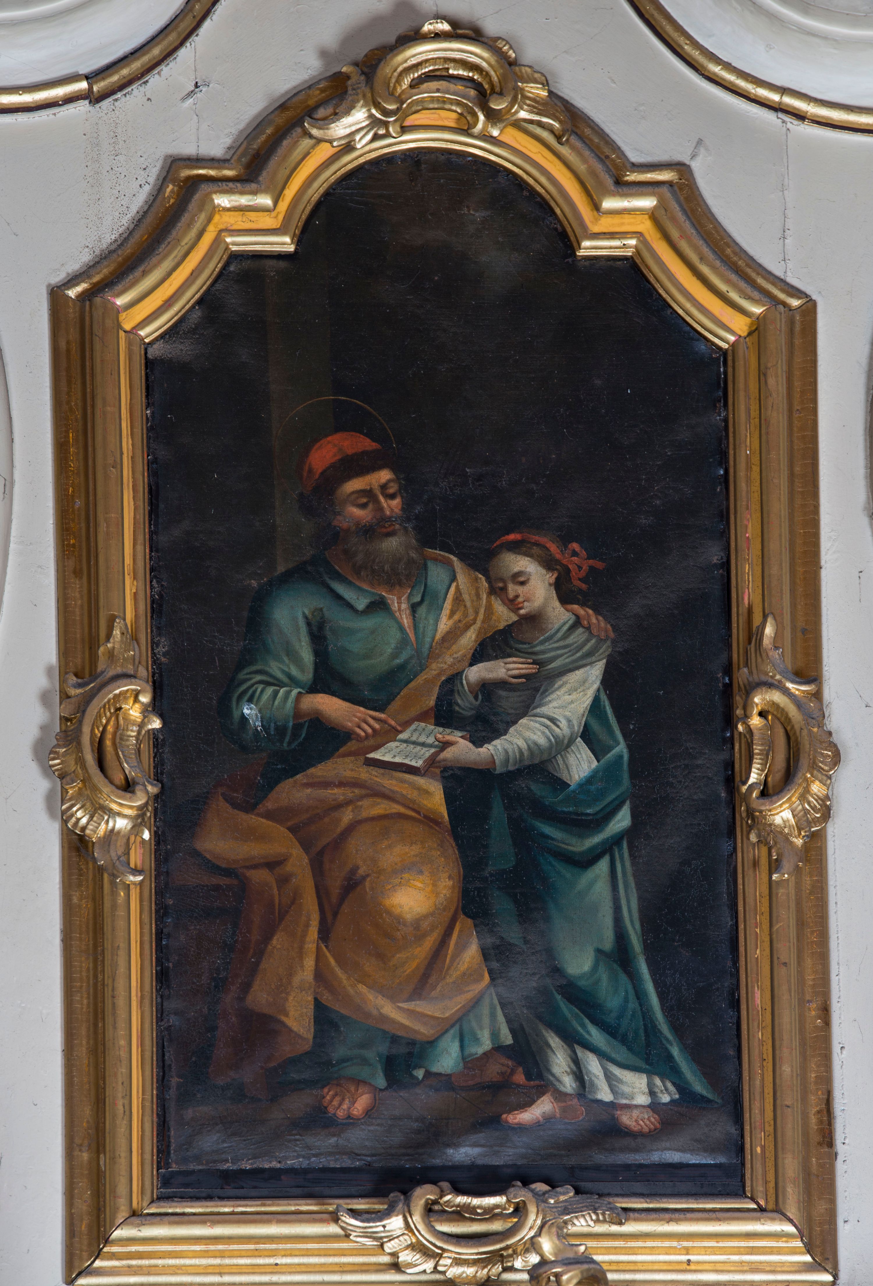 Nastawa ołtarzowa architektoniczna, jednoosiowa, jednokondygnacyjna ze zwieńczeniem, ustawiona na dwustrefowym cokole z wyodrębnionymi prostopadłościanami. Ołtarz kamienny, prostopadłościenny, w drewnianej obudowie. Mensa kamienna z marmurowym portatylem. Antepedium drewniane, w kształcie leżącego prostokąta, ujęte profilowaną ramą, z płaskorzeźbionym monogramem maryjnym oraz fragmentami ornamentu roślinnego. Tabernakulum w kształcie prostopadłościennej skrzynki o wypukłym licu, flankowanej parą kolumienek na cokołach, ustawionych pod kątem, dźwigających woluty oraz gzyms przyjmujący formę łuku segmentowego nadwieszonego. Drzwiczki w kształcie stojącego prostokąta zamkniętego łukiem półkolistym, w opasce, z płaskorzeźbionym przedstawieniem baranka apokaliptycznego, leżącego na księdze, w glorii. Nastawa ujęta dwiema parami pilastrów dekorowanych rocaille'em i stojącą pomiędzy nimi parą kolumn o kapitelach kompozytowych dźwigających pełne belkowanie, wyłamane na ich osi, przerwane pośrodku. Na belkowaniu ustawione dwa wazony. W polu centralnym głęboka wnęka w formie stojącego prostokąta zamkniętego łukiem półkolistym nadwieszonym z uskokiem, ujęta profilowaną ramą, z obrazem Matki Boskiej z Dzieciątkiem w osobnej profilowanej ramie o kształcie stojącego prostokąta zamkniętego ornamentalnym łukiem. Ponad nią, w partii belkowania rokokowy kartusz z rytym monogramem Marii, a poniżej prostokątna płycina z wotami. Pole flankowane dwiema figurami kobiet stojącymi na ćwierćkolistych cokołach. Nastawa ujęta uszami utworzonymi z rocaille'u. Zwieńczenie w formie stojącego prostokąta o wklęsłych bokach, ze spływami z uszakami po bokach, zamknięte gzymsem przyjmującym formę łuku segmentowego nadwieszonego z uskokiem, wyłamanego przy brzegach, dekorowanego rocaille'em. W polu obraz „Nauczanie Marii przez Joachima” ujęty profilowaną ramą w kształcie stojącego prostokąta zamkniętego łukiem segmentowym nadwieszonym z uskokiem.