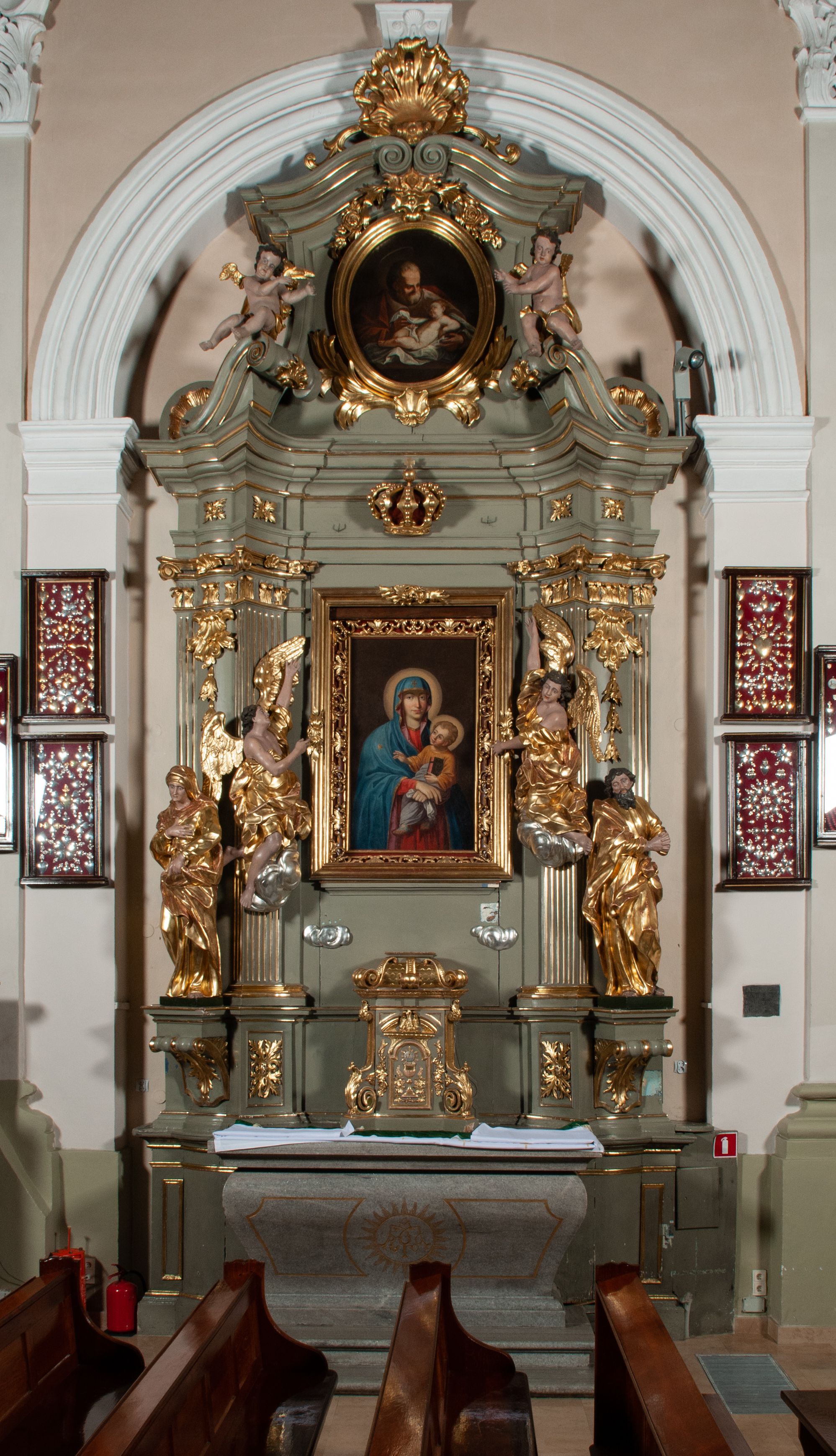 Ołtarz od początku nosił wezwanie Matki Boskiej. Powstał zapewne w połowie XVIII wieku wraz z całym snycerskim wyposażeniem. Ten ołtarz podobnie, jak pozostałe pierwotnie był pomalowany na niebiesko, co odnotowano w inwentarzu z 1831 roku.