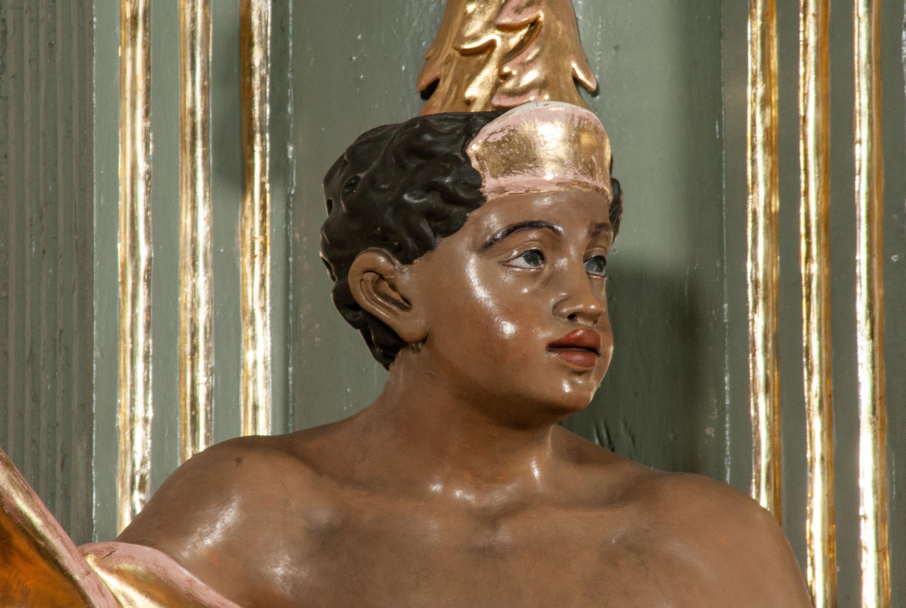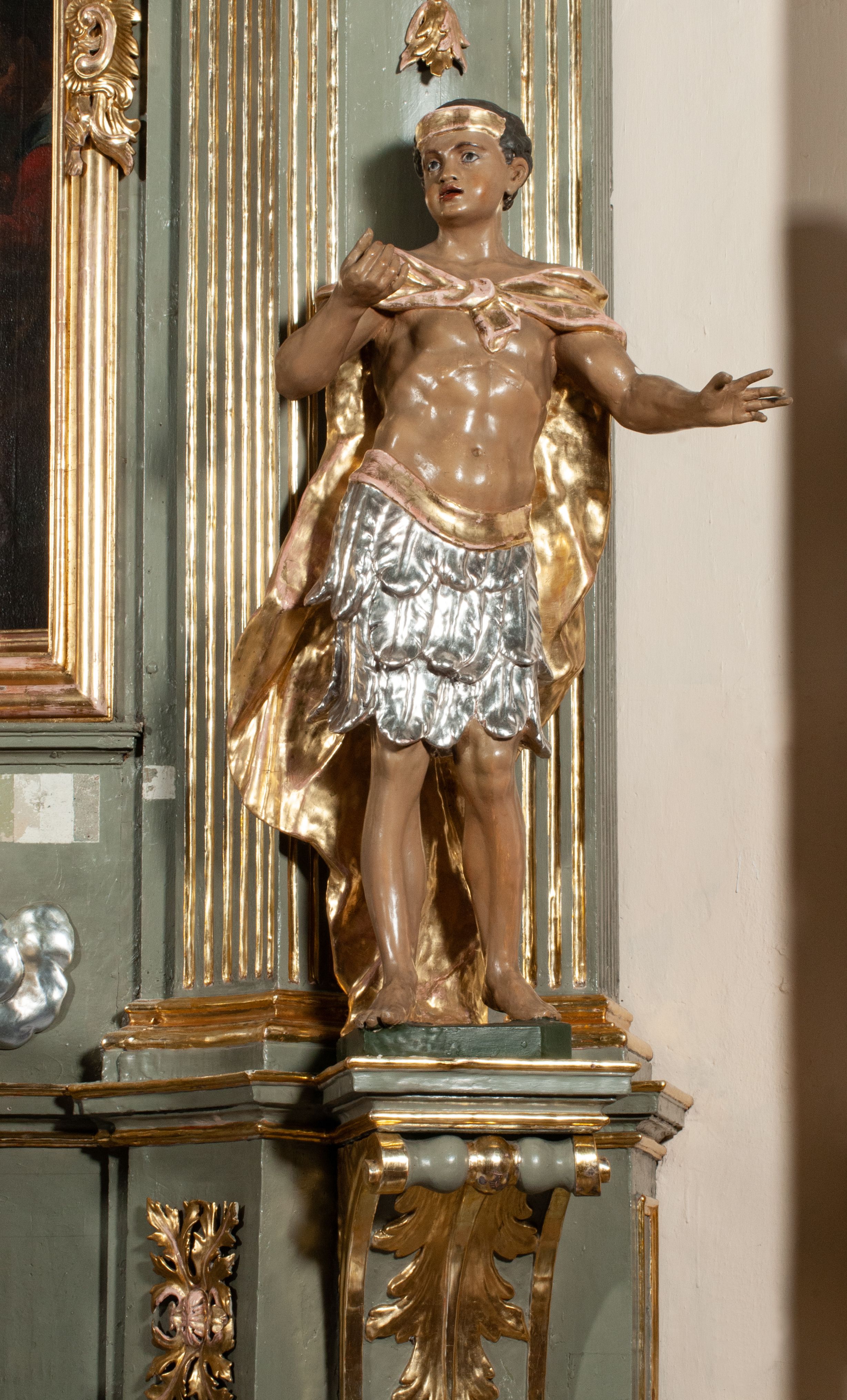 Figury egzotycznych (o typach wschodnich) mężczyzn ukazane w kontrapoście, o prawidłowych proporcjach ciała, z rękami uniesionymi przed siebie, na wysokości klatki piersiowej. Ich twarze są pełne, okrągłe o szerokich nosach i wydatnych, lekko otwartych ustach, na głowie krótkie, kręcone, ciemne włosy przytrzymane na czole złoconymi opaskami. Biodra okalają sięgające kolan spódniczki ze srebrnych piór. Mężczyzna po lewej stronie trzyma skórę z twarzą św. Bartłomieja osłaniającą część jego ciała, a postać po prawej nosi na plechach płaszcz sięgający stóp. Na dekorację ornamentalną składają się drobne motywy roślinne, kampanule na ćwierćkolumnach, kartusz ujęty drobnymi rocaille’ami, zwisy róż i gałązek palm wokół obrazu w zwieńczeniu i efektowna podwójna muszla palmetowa w zwieńczeniu.