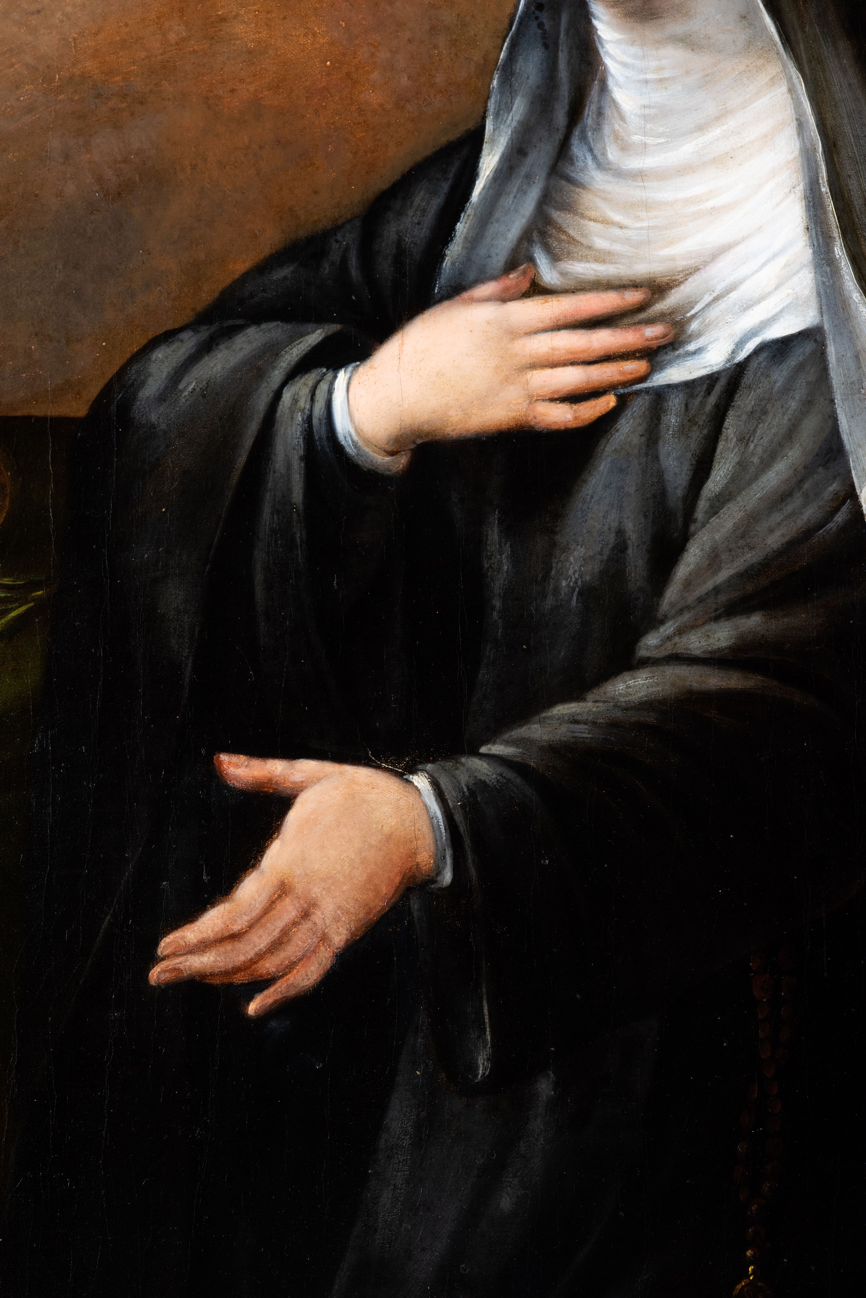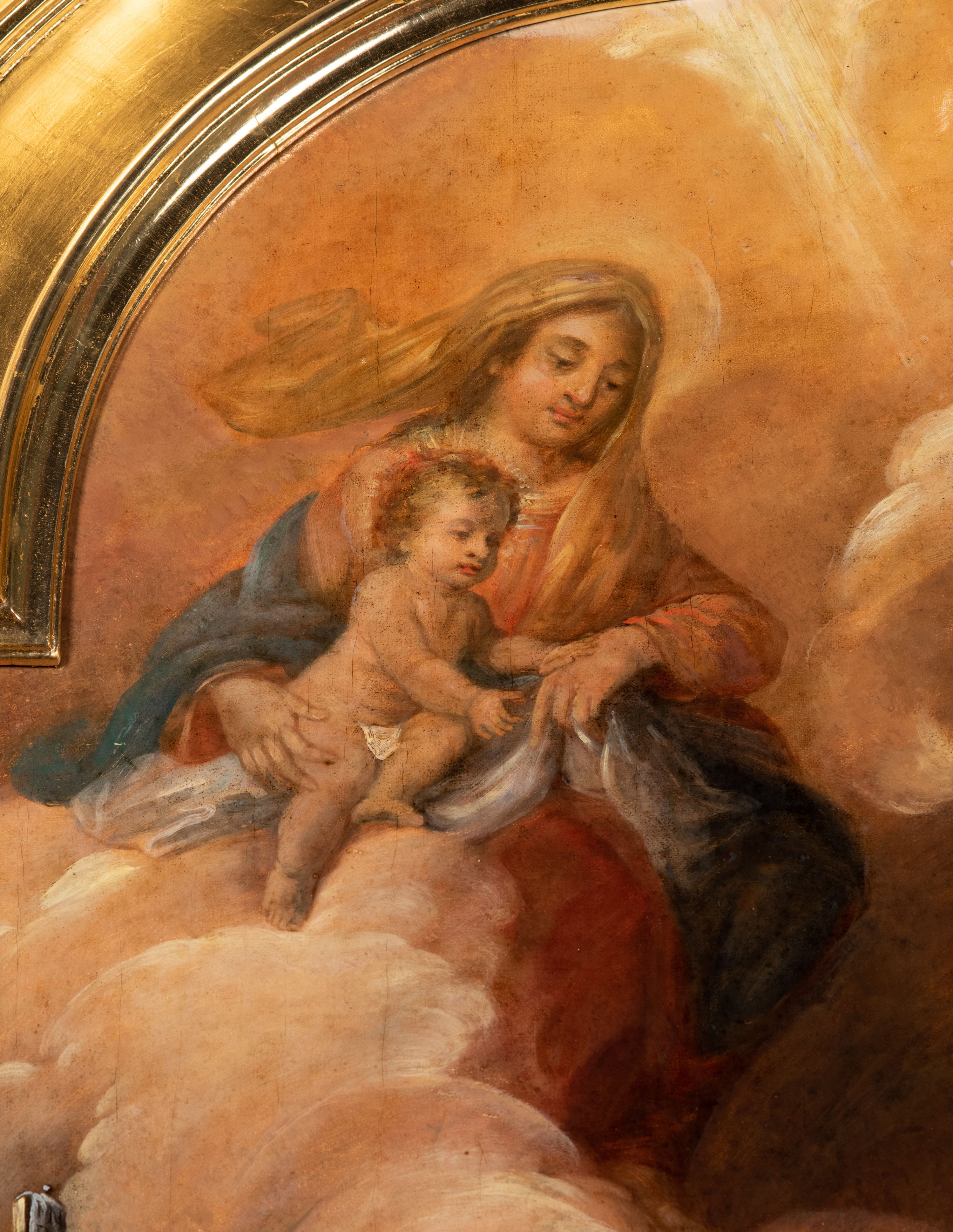 Ołtarz stanowi część siedemnastowiecznego wyposażenia powstałego po pożarze kościoła w 1594 roku i należy do typowych dla połowy XVII wieku dzieł łączących prostą strukturę z bogatą ornamentyką małżowinowo-chrząstkową. Pierwotnie nastawa nosiła wezwanie św. Ventury Spolitańskiego, założyciela kościoła i szpitala szpitalników w Spoleto, czczonego w zakonie marków.