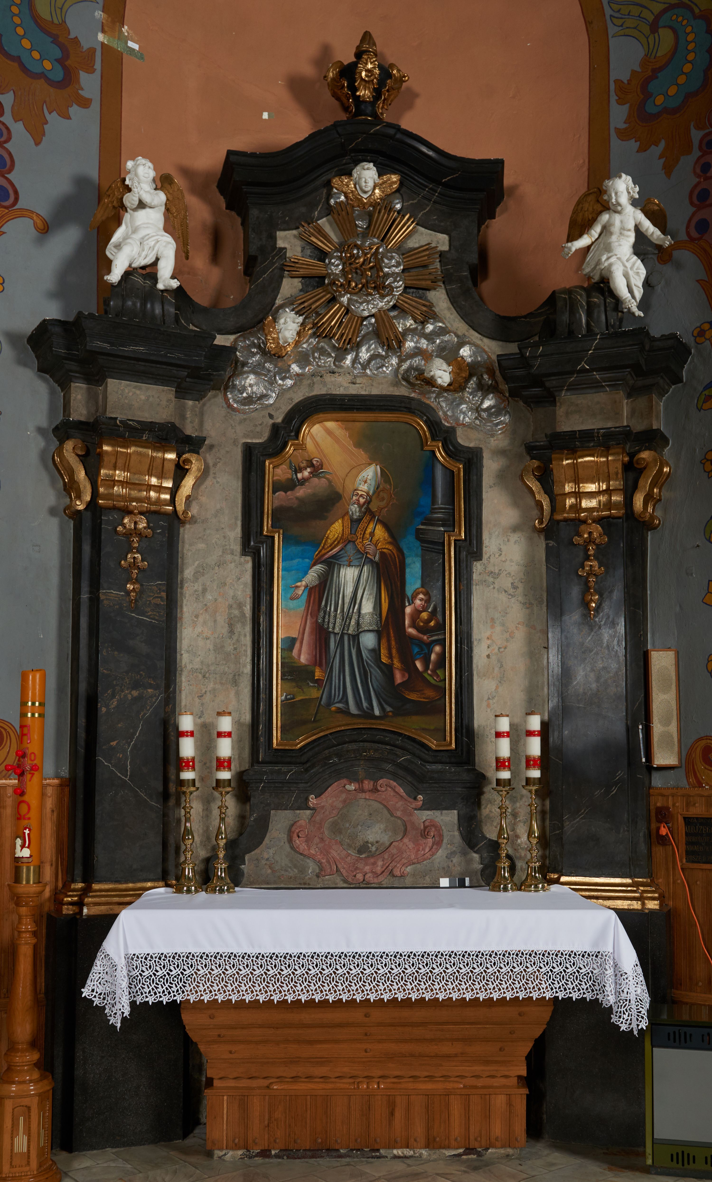 Nastawa ołtarza stiukowa, architektoniczna, jednoosiowa, jednokondygnacyjna, o wklęsłym licu, ze zwieńczeniem oraz osadzona na wysokim cokole. Ołtarz drewniany, sarkofagowy z drewnianą, silnie wysuniętą mensą. Retabulum ujęte jest parą zdwojonych pilastrów o trzonach dekorowanych konsolkami i kampanulami na froncie, dźwigających przerwane belkowanie. W polu środkowym umieszczono obraz św. Mikołaja ujęty profilowaną ramą w formie stojącego prostokąta zamkniętego łukiem odcinkowym, nadwieszonym z uskokiem i uszakami po bokach, wklęsłego u spodu. Poniżej obrazu znajduje się płycina ujęta spływami wolutowymi, zamknięta fragmentem gzymsu w formie łuku odcinkowego. W jej polu jest kartusz o fantazyjnym wykroju. Zwieńczenie ujęto parą spływów wolutowych i zamknięto fragmentem wklęsło-wypukłego gzymsu, na którym jest płomienisty wazon. Na końcach spływów wolutowych znajduje się para siedzących putt.