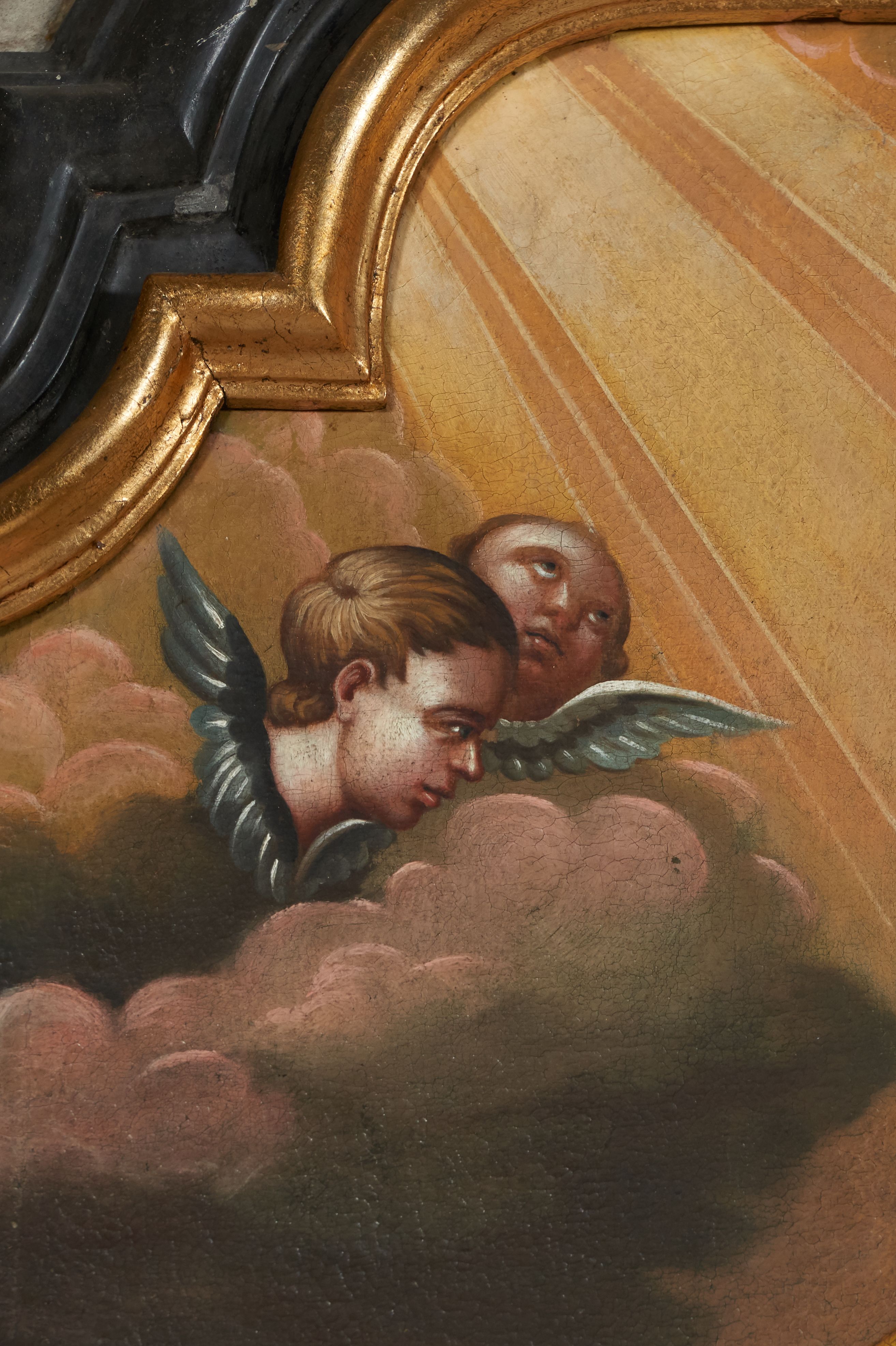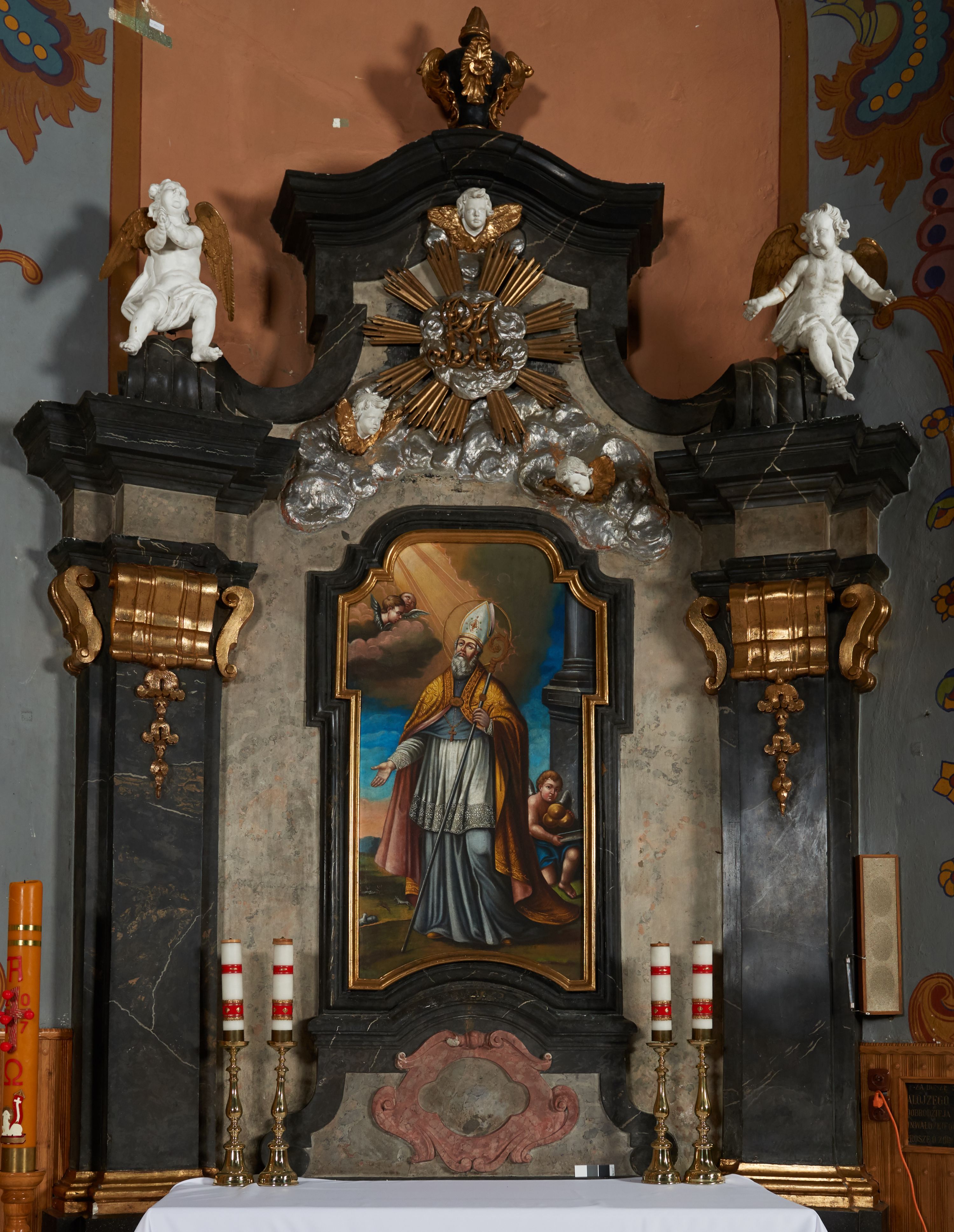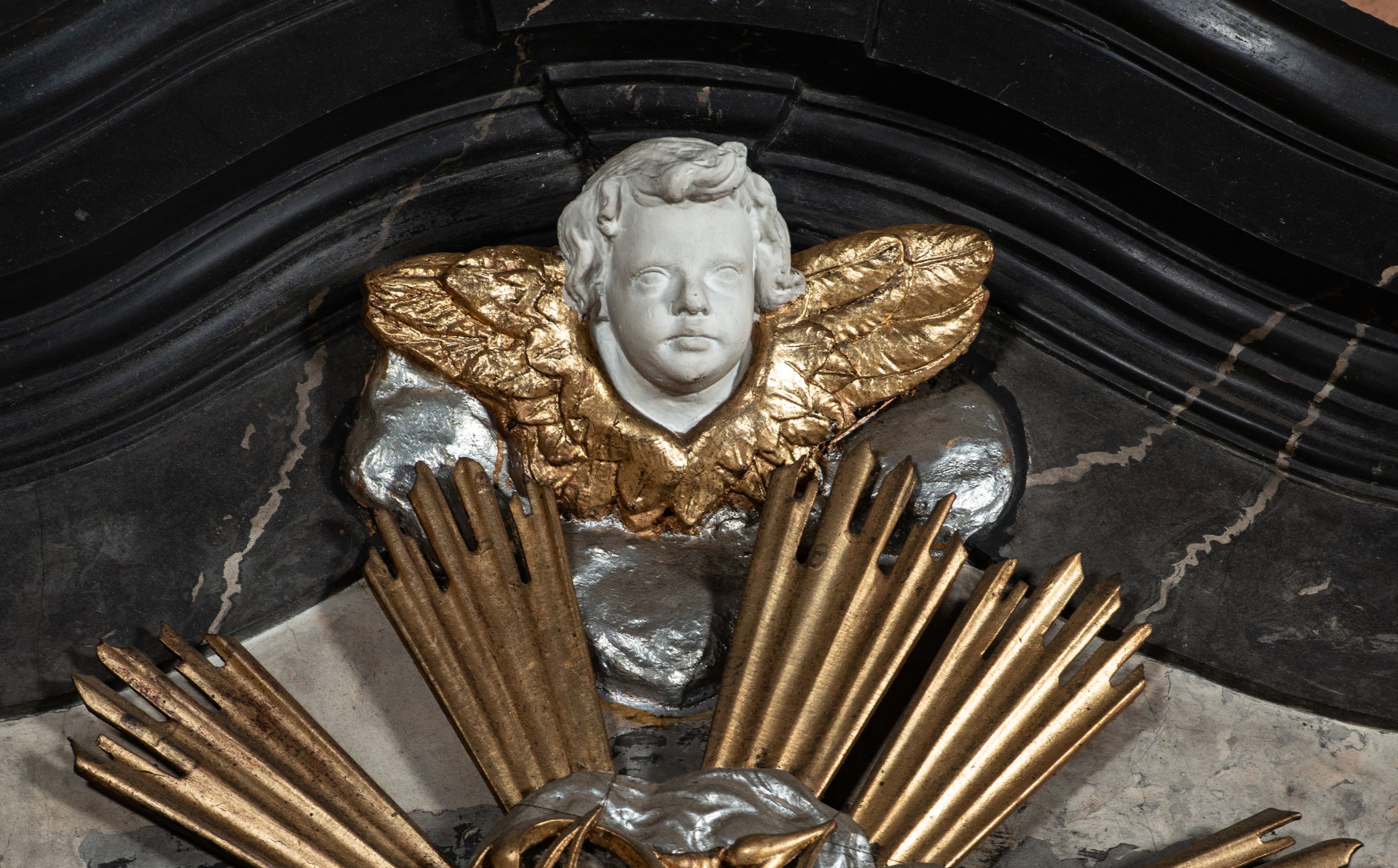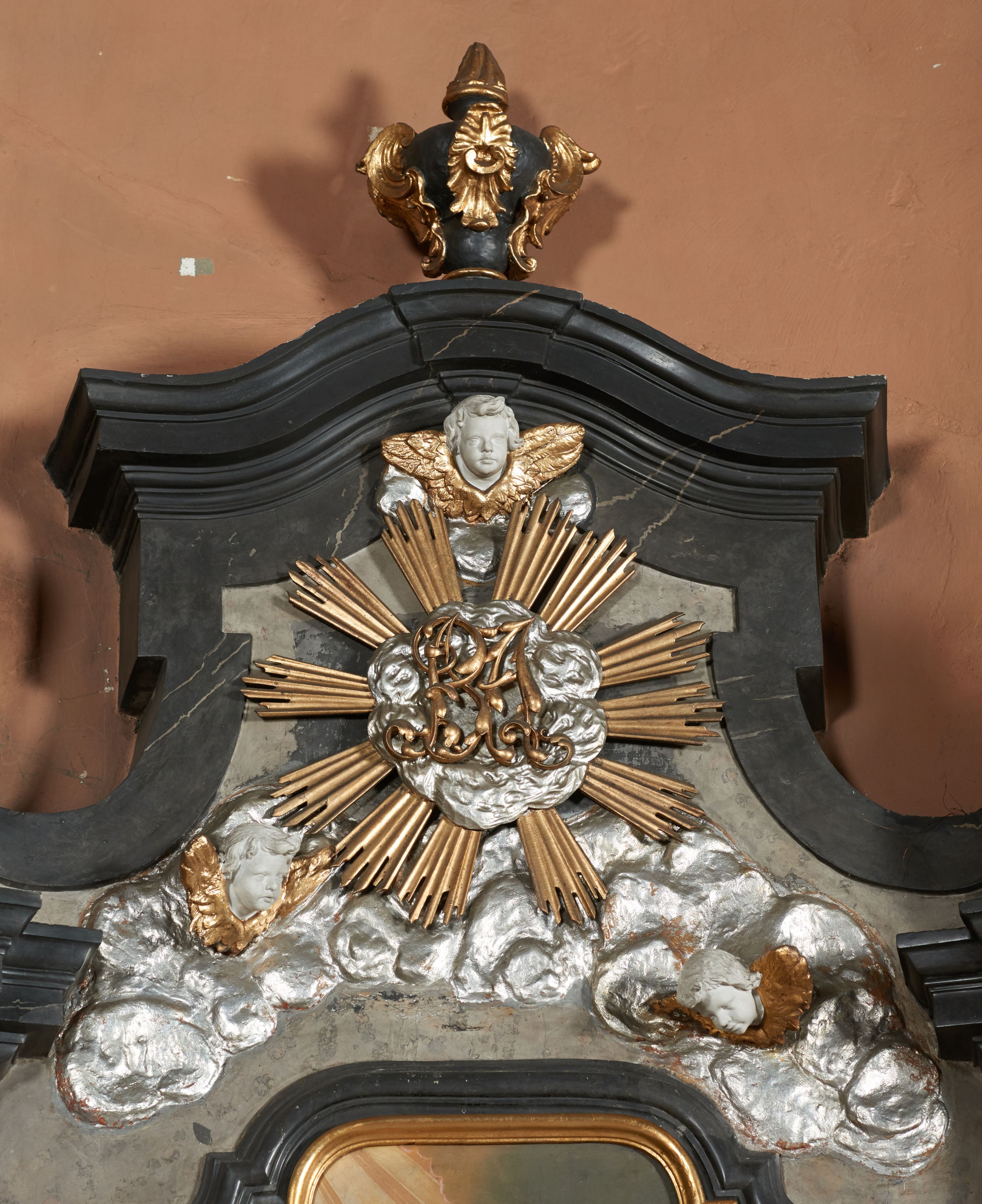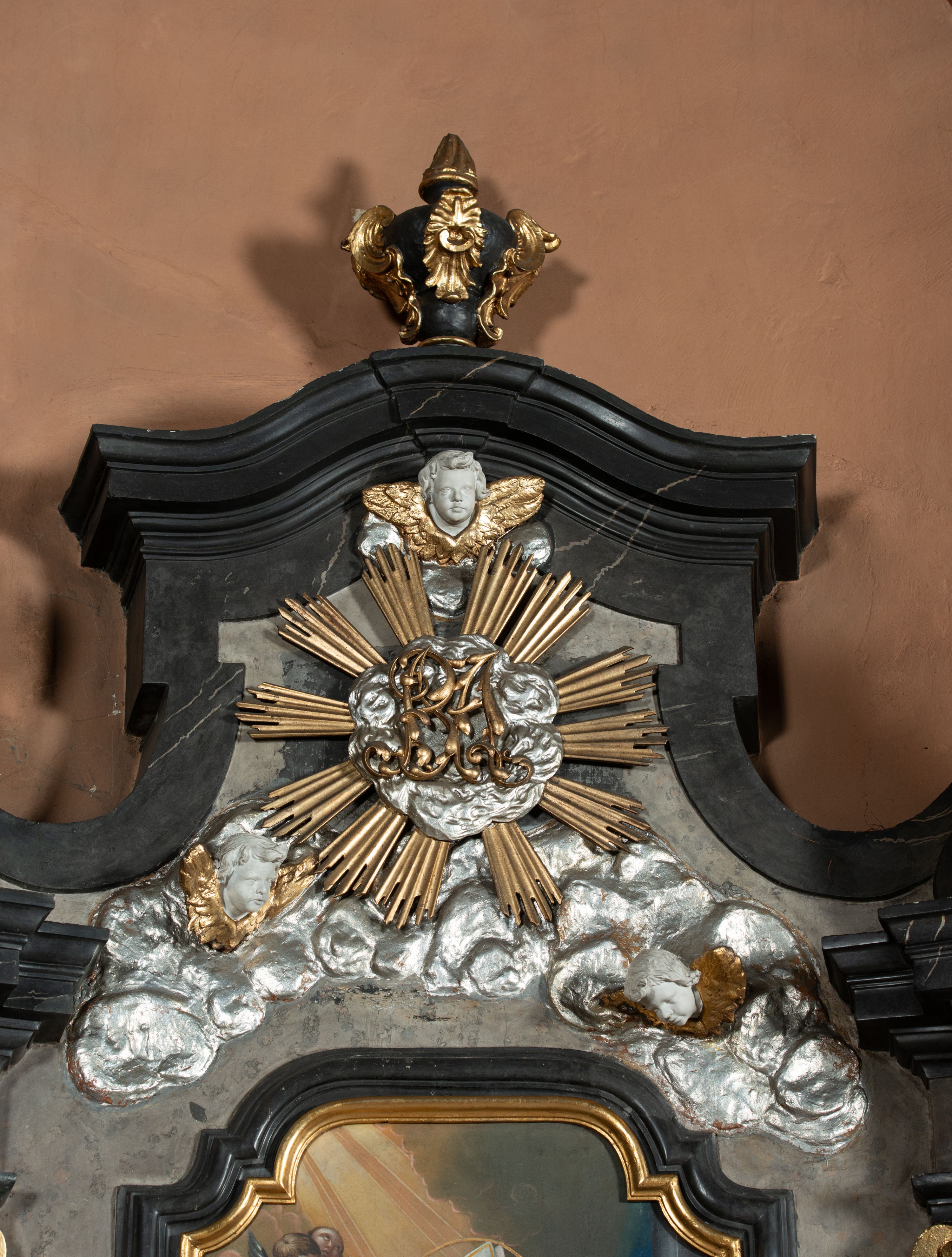 Pole zwieńczenia wypełniają płaskorzeźbione obłoki z uskrzydlonymi główkami anielskimi oraz ukazana na ich tle promienista gloria z monogramem maryjnym pośrodku. Struktura retabulum jest marmoryzowana w kolorze szaro-brązowym i ciemnoszarym, ze złoconymi i srebrzonymi detalami.