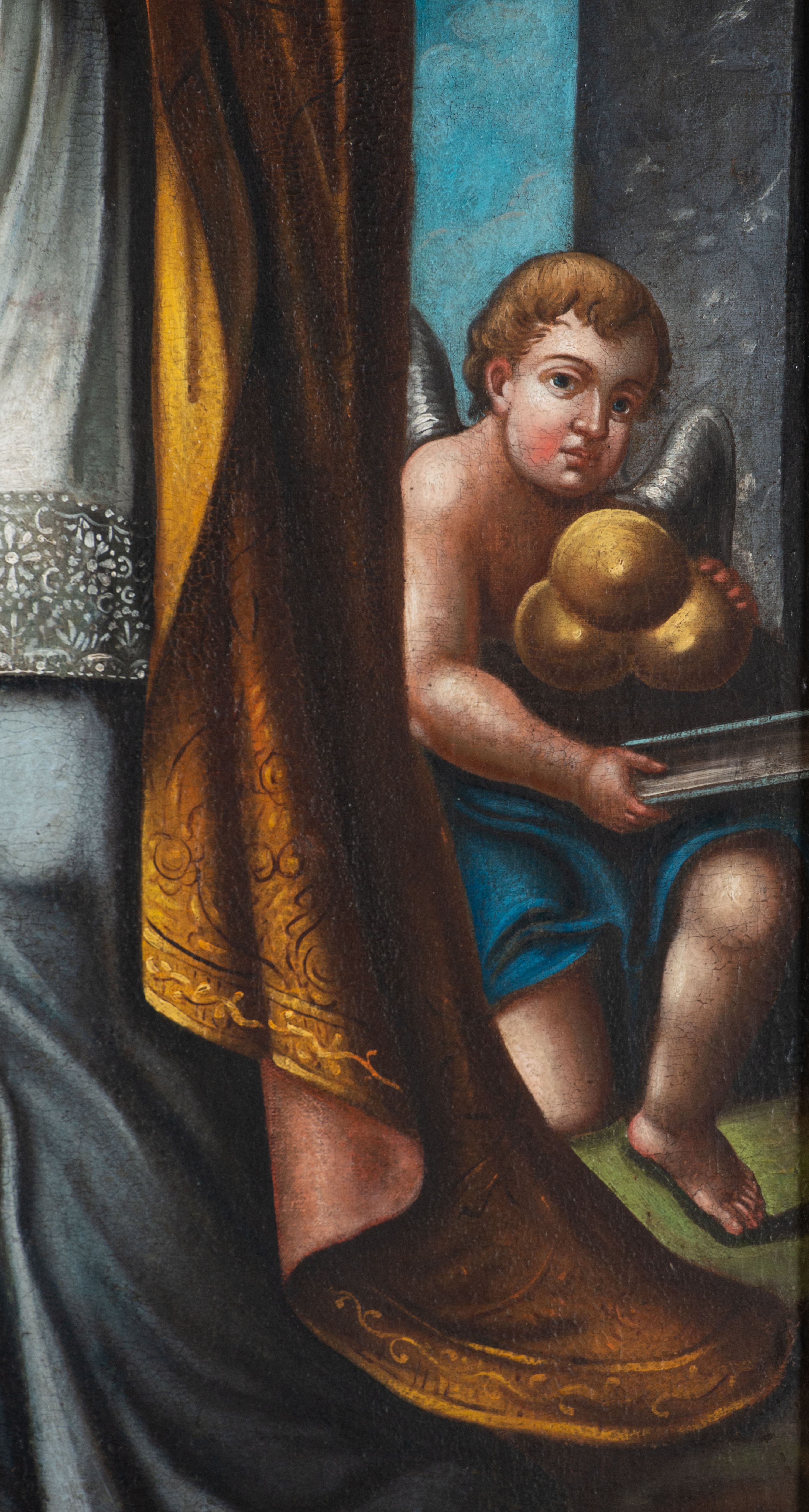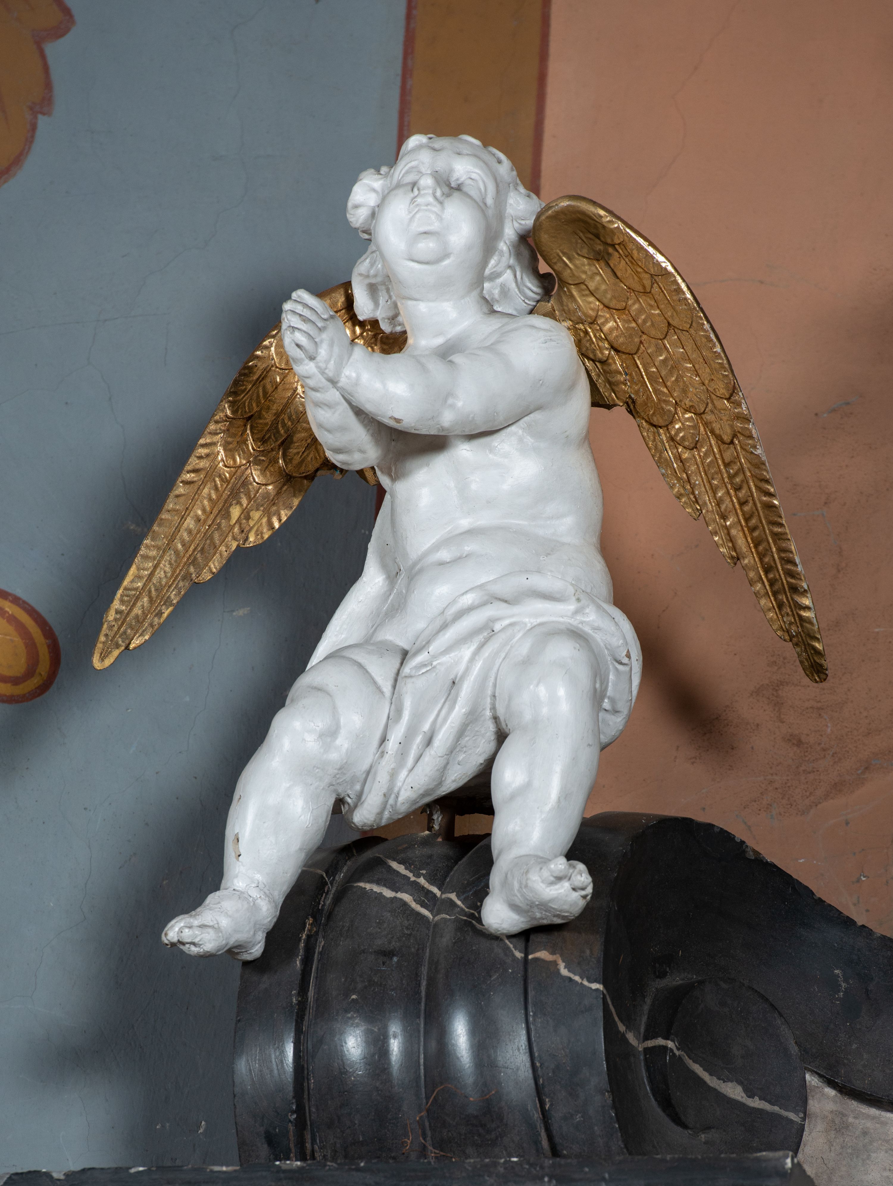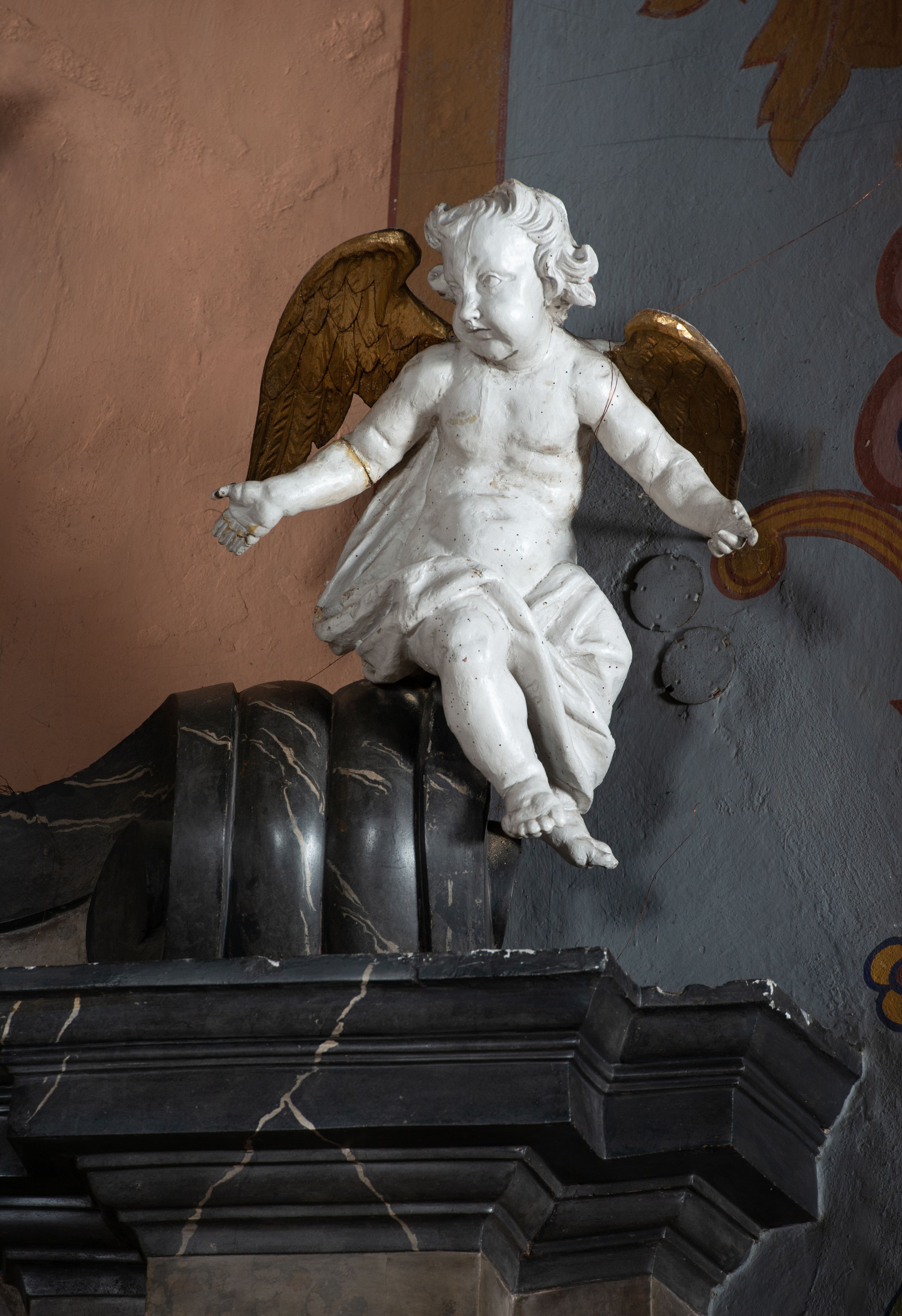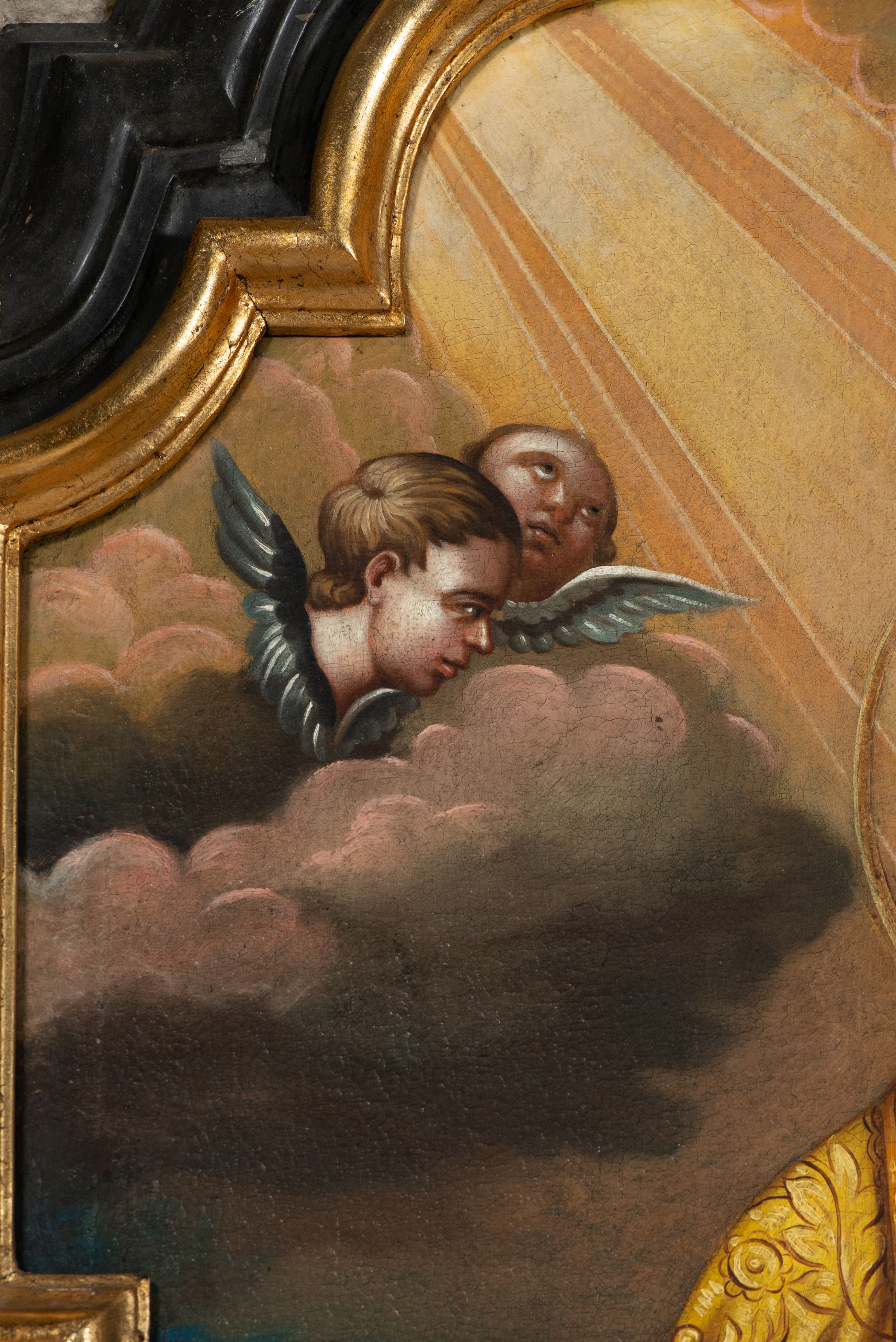 Pole zwieńczenia wypełniają płaskorzeźbione obłoki z uskrzydlonymi główkami anielskimi oraz ukazana na ich tle promienista gloria z monogramem maryjnym pośrodku. Struktura retabulum jest marmoryzowana w kolorze szaro-brązowym i ciemnoszarym, ze złoconymi i srebrzonymi detalami.