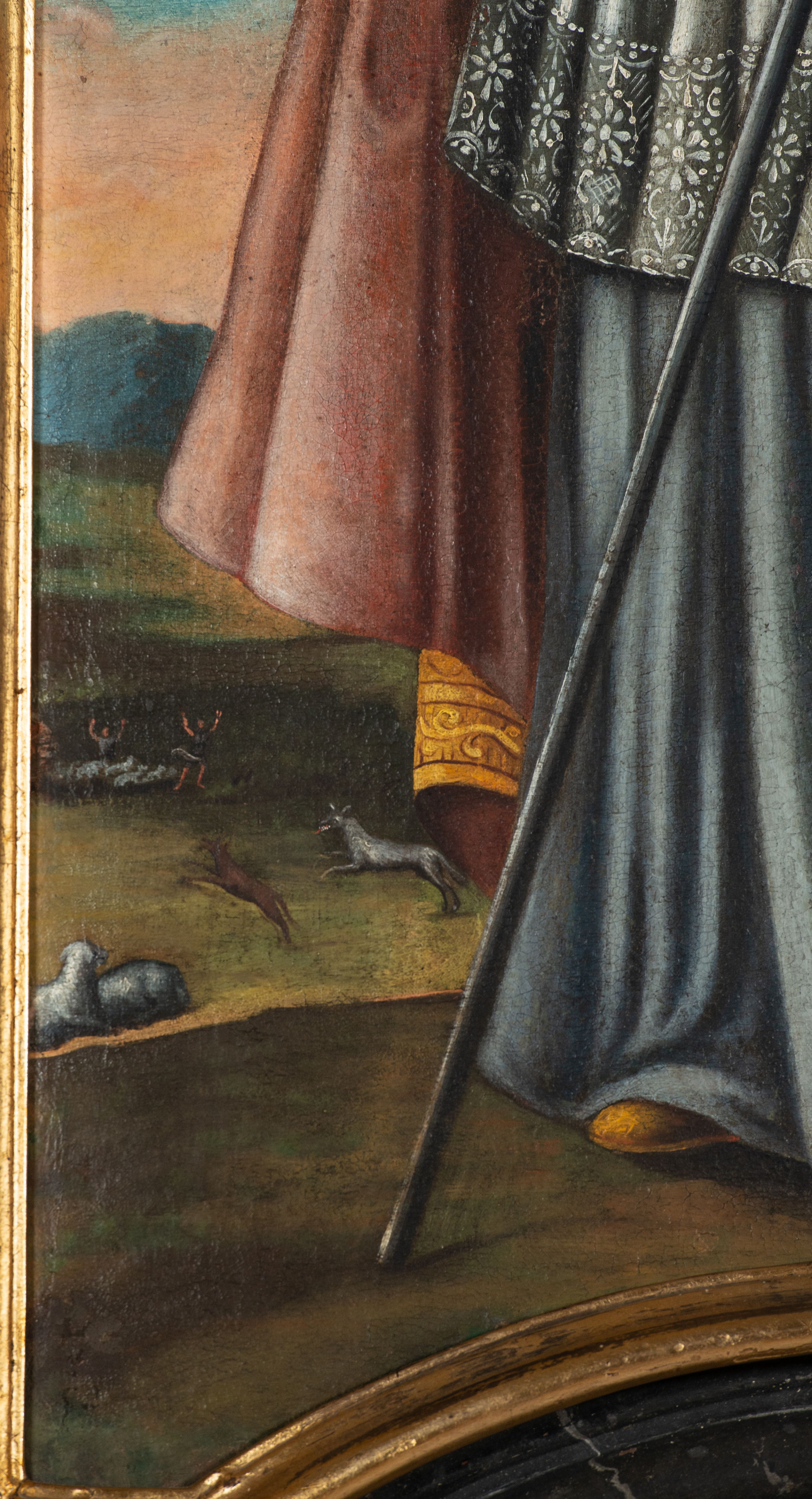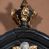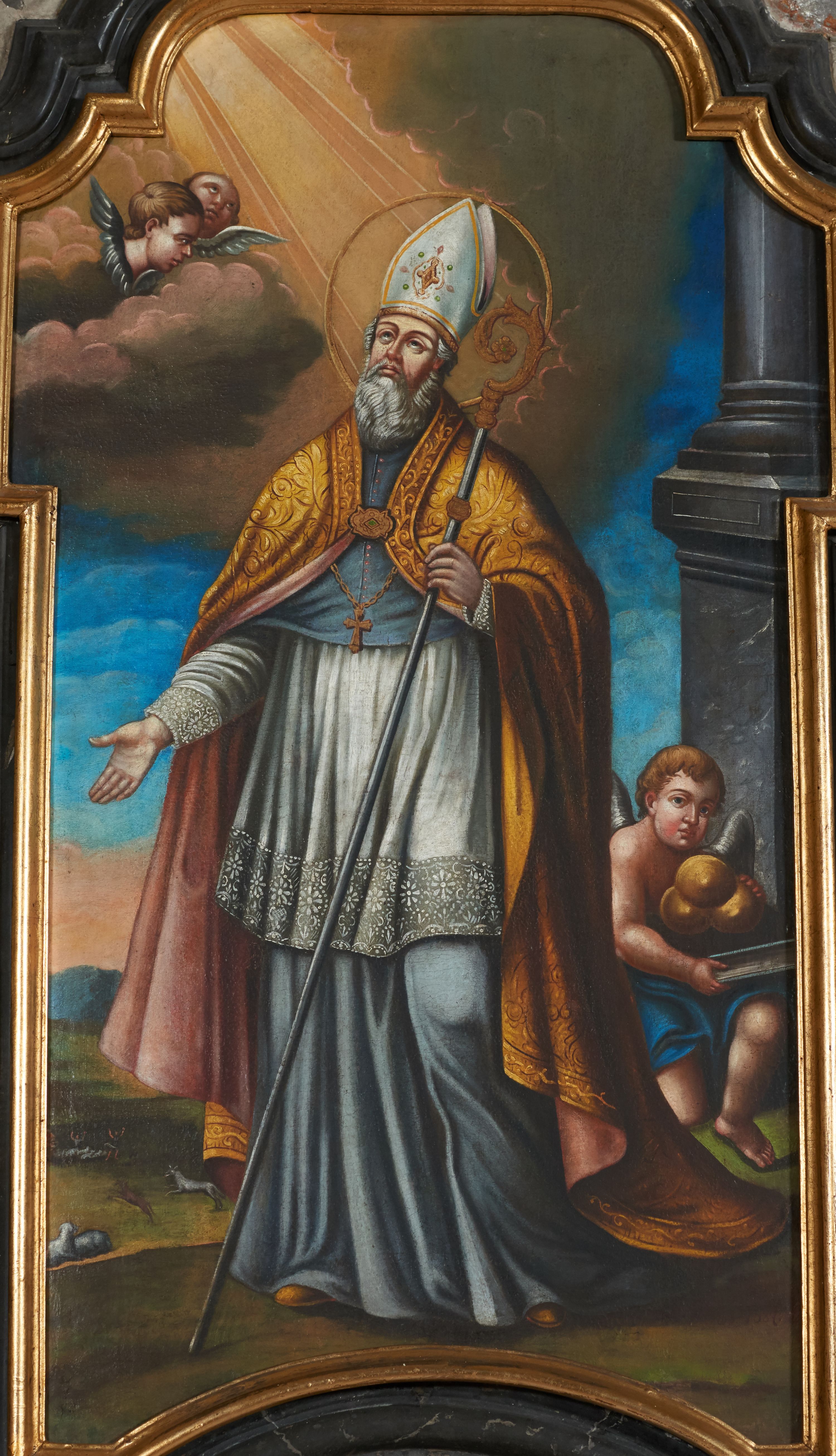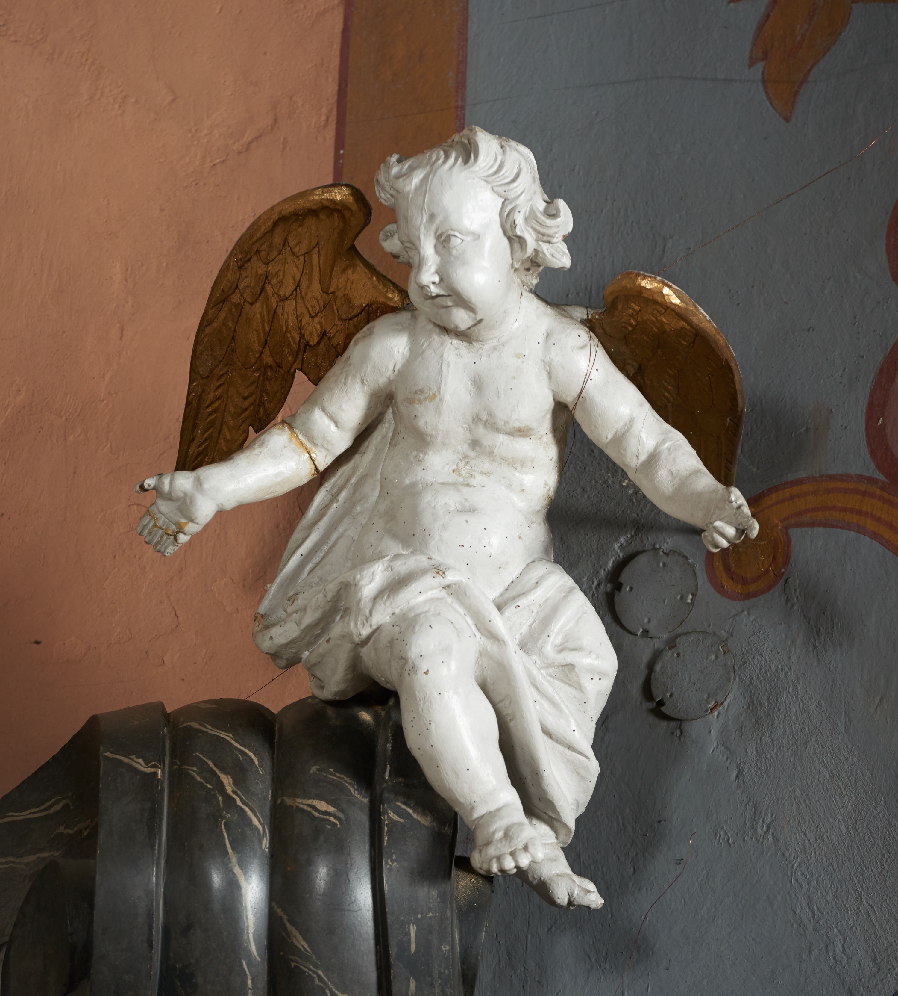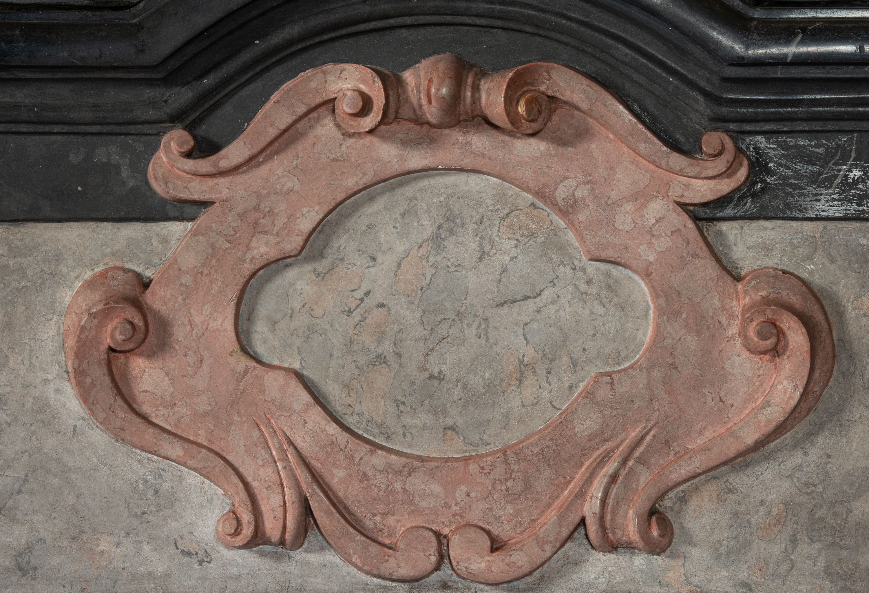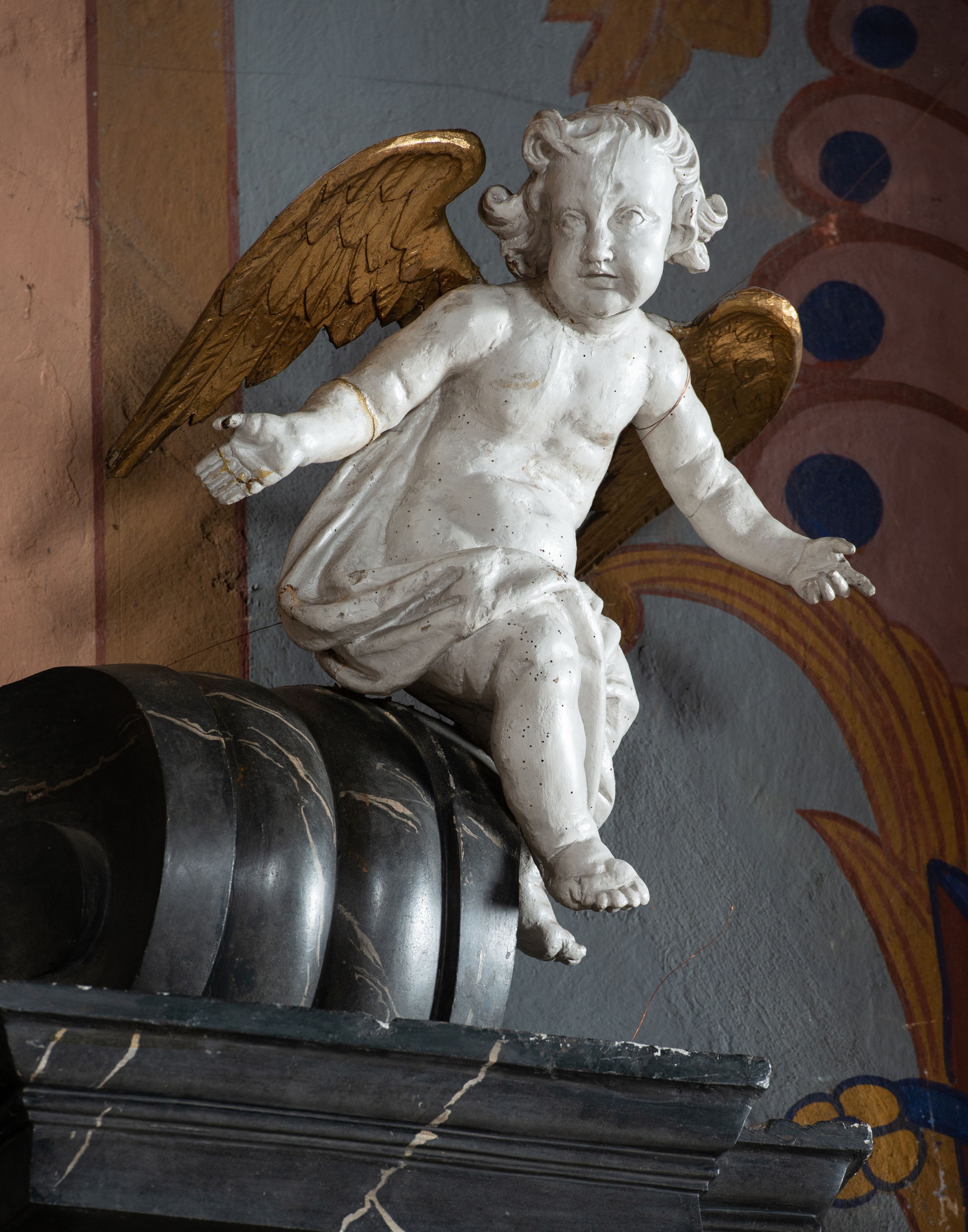Pole zwieńczenia wypełniają płaskorzeźbione obłoki z uskrzydlonymi główkami anielskimi oraz ukazana na ich tle promienista gloria z monogramem maryjnym pośrodku. Struktura retabulum jest marmoryzowana w kolorze szaro-brązowym i ciemnoszarym, ze złoconymi i srebrzonymi detalami.