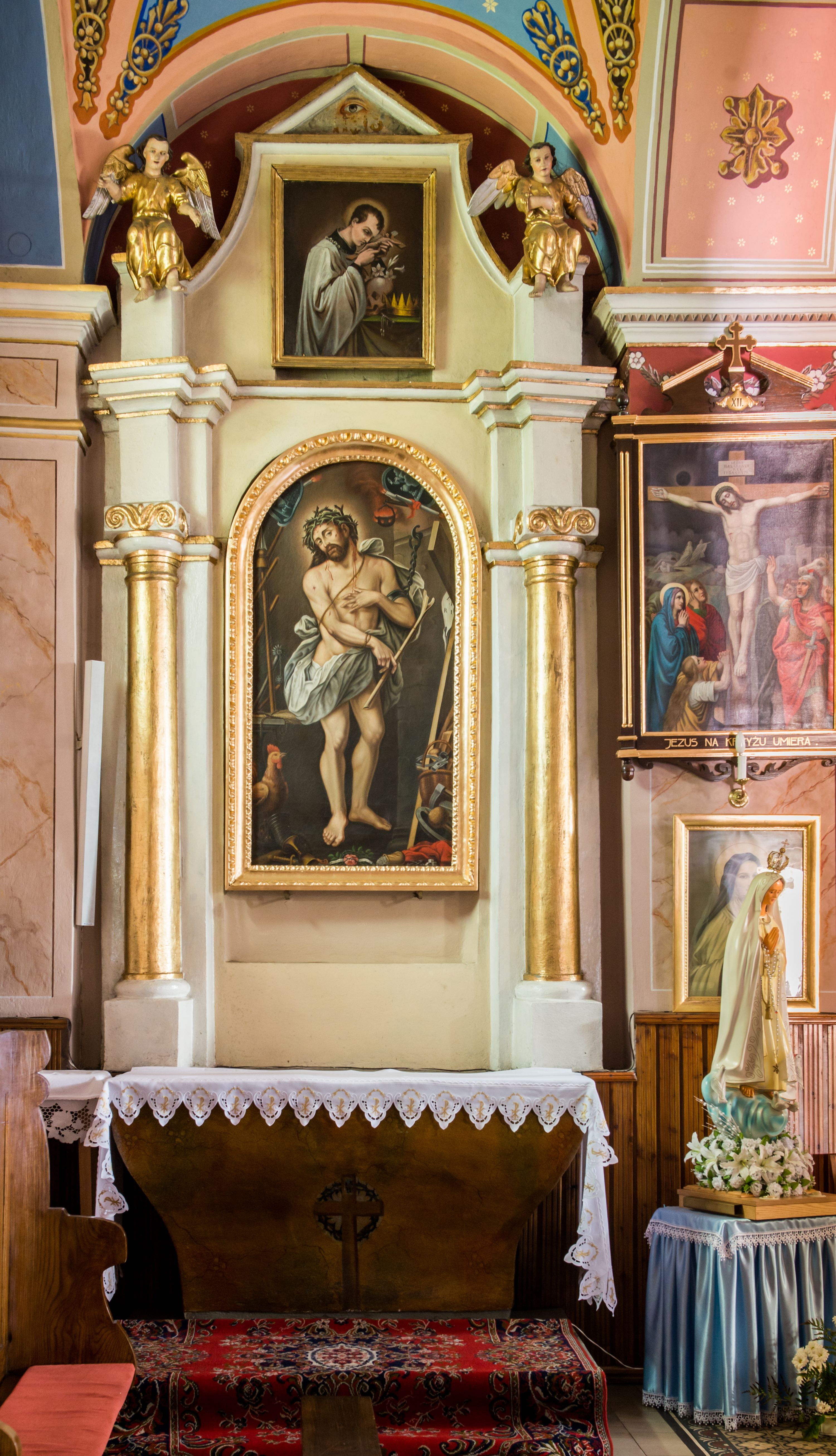 Ołtarz przyścienny, architektoniczny, jednoosiowy, jednokondygnacyjny ze zwieńczeniem. Ołtarz sarkofagowy z murowaną mensą i polichromowanym antepedium z motywem krzyża z koroną cierniową pośrodku. Część środkowa ujęta jest parą półkolumn osadzonych na postumentach i przylegających do pary pilastrów. Ustawione lekko skośnie na zewnątrz podpory wspierają przerwane i wyłamujący się ponad nimi wysoki fryz oraz gzyms. Pole części środkowej i partii belkowania zajmuje płytka wnęka w kształcie stojącego prostokąta zamkniętego półkoliście. Zwieńczenie retabulum ujęte jest parą spływów oraz prostopadłościennych cokołów. Szczyt jest w formie trójkątnego przyczółka. Obraz w części środkowej ma kształt stojącego prostokąta zamkniętego półkoliście i przedstawia Męża Boleści wśród narzędzi męki Pańskiej. W zwieńczeniu jest obraz w kształcie stojącego prostokąta z wizerunkiem św. Stanisława Kostki. Pole przyczółka wypełnia polichromia przedstawiająca oko Opatrzności Bożej. Na ujmujących zwieńczenie cokołach znajduje się para figur siedzących aniołów w złoconych szatach. Kolorystyka struktury retabulum utrzymana jest w kolorze białym i jasnożółtym, detal architektoniczny jest złocony.