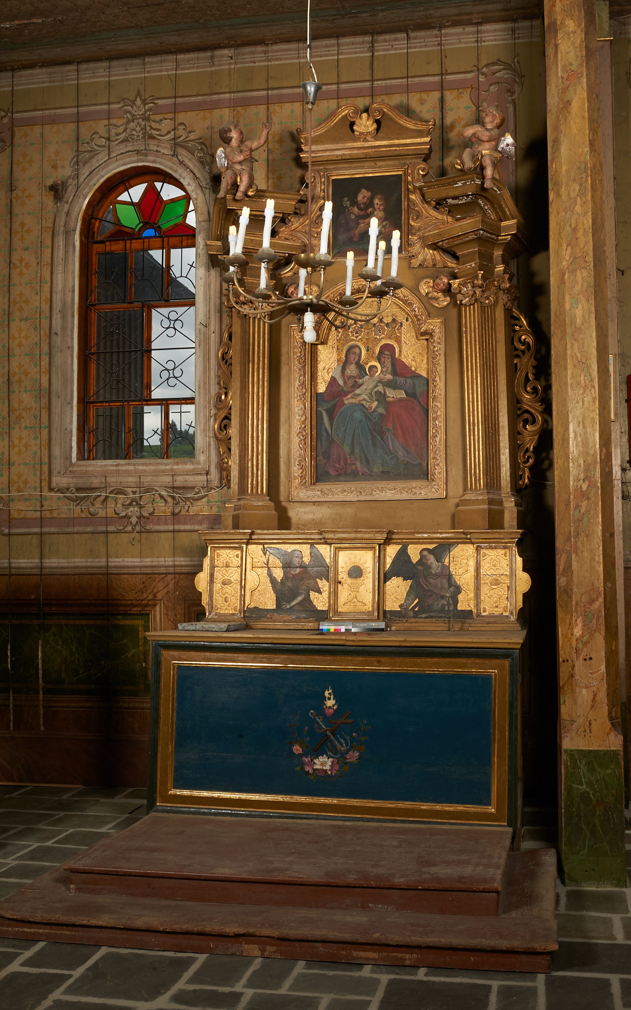 Nastawa ołtarzowa architektoniczna, jednoosiowa, jednokondygnacyjna ze zwieńczeniem. Ołtarz drewniany, prostopadłościenny, mensa drewniana. Antepedium w profilowanej ramie, z malowanym krzyżem, kotwicą i gorejącym sercem, w otoczeniu kwiatów. Predella na na niskim cokole, flankowana dwoma pilastrami, dźwigającymi gzyms wieńczący, wyłamany w partii pilastrów i tabernakulum po środku. Trzony pilastrów dekorowane ornamentem okuciowym z kaboszonami. W polach pomiędzy nimi malowane półpostacie aniołów, u spodu parapet z przedstawieniem arma Christi. Lewa postać z palmą, prawa ze włócznią i sakiewką. Ukazane na złoconym tle z tłoczonym ornamentem roślinnym. Drzwiczki tabernakulum w formie stojącego prostokąta z przedstawieniem kielicha z hostią z monogramen IHS, w glorii. Nastawa ujęta parą zdwojonych pilastrów zwróconych do wewnątrz, o kanelowanych trzonach i kapitelach kompozytowych dekorowanych rocaille'm. Podpory dźwigają fragmenty przerwanego belkowania i ćwierćkolistego, przerwanego przyczółka, na których siedzi para puttów. W polu środkowym płycina w formie stojącego prostokąta zamkniętego łukiem półkolistym nadwieszonym ujęta grubą ramą dekorowaną akantem z obrazem św. Anny Samotrzeć. W przyłuczach dwie uskrzydlone główki anielskie. Kondygnacja ujęta ażurowymi, akantowymi uszami. Zwieńczenie w formie stojącego prostokąta ujętego utworzonymi z rocaille'u i muszli spływami wolutowymi, zamknięte fragmentem gzymsu, na którym znajduje się szczyt utworzony z przeciwstawnie zwróconych wolut z anthemionem. W polu zwieńczenia obraz w formie stojącego prostokąta z przedstawieniem św. Józefa z Dzieciątkiem. Struktura ołtarza malowana na kolor jasnobrązowy, profile i ornamenty złocone.