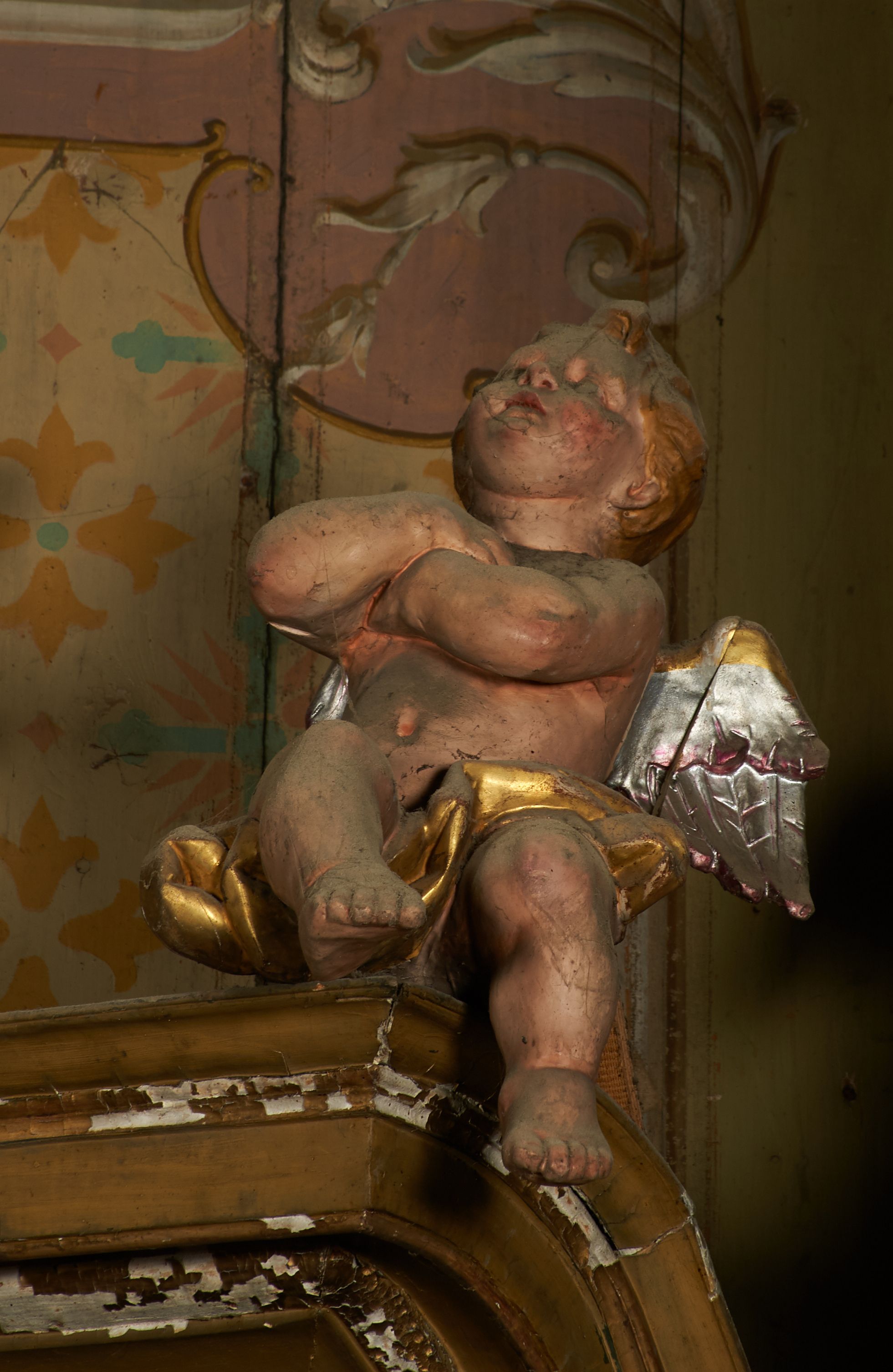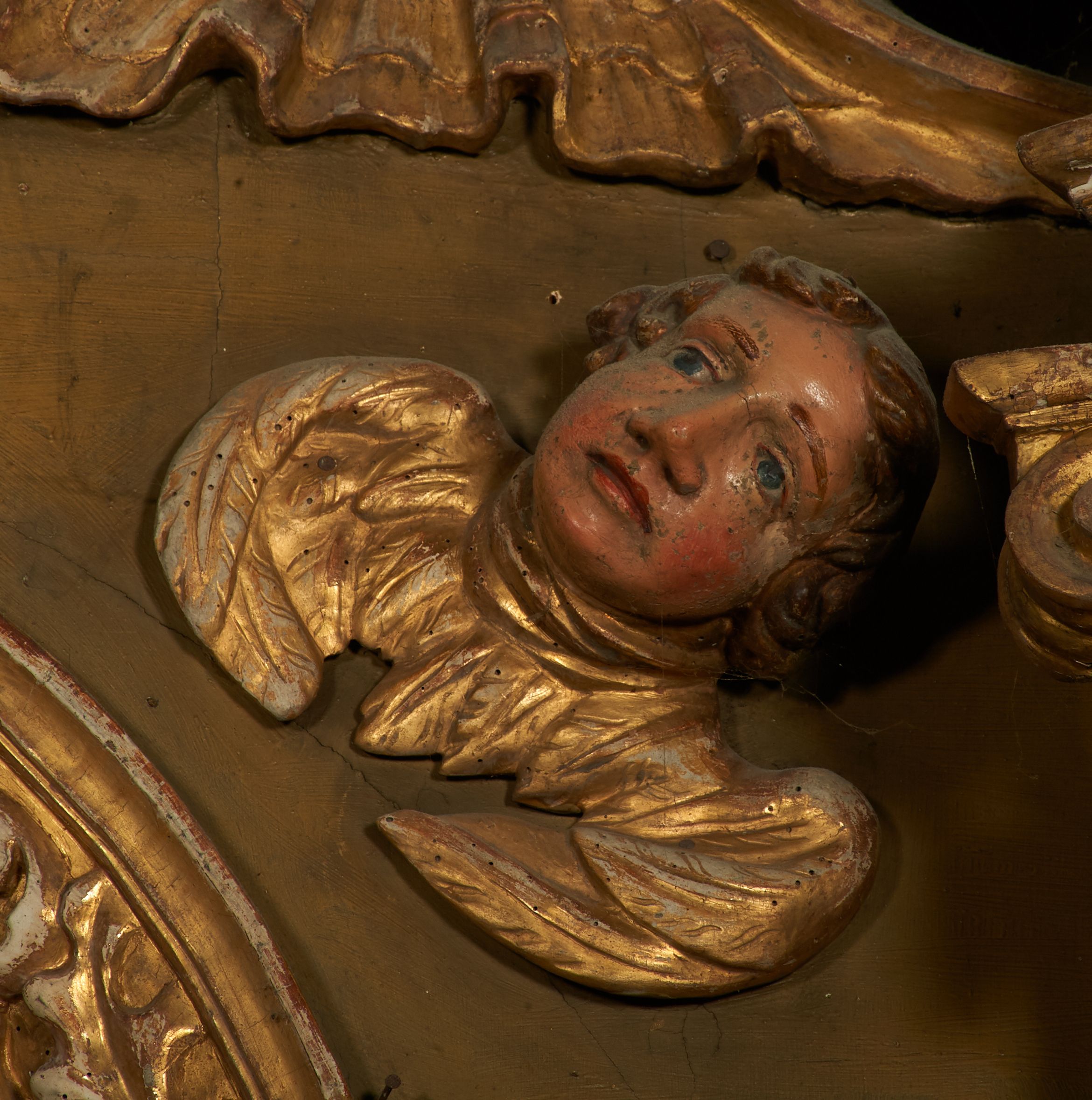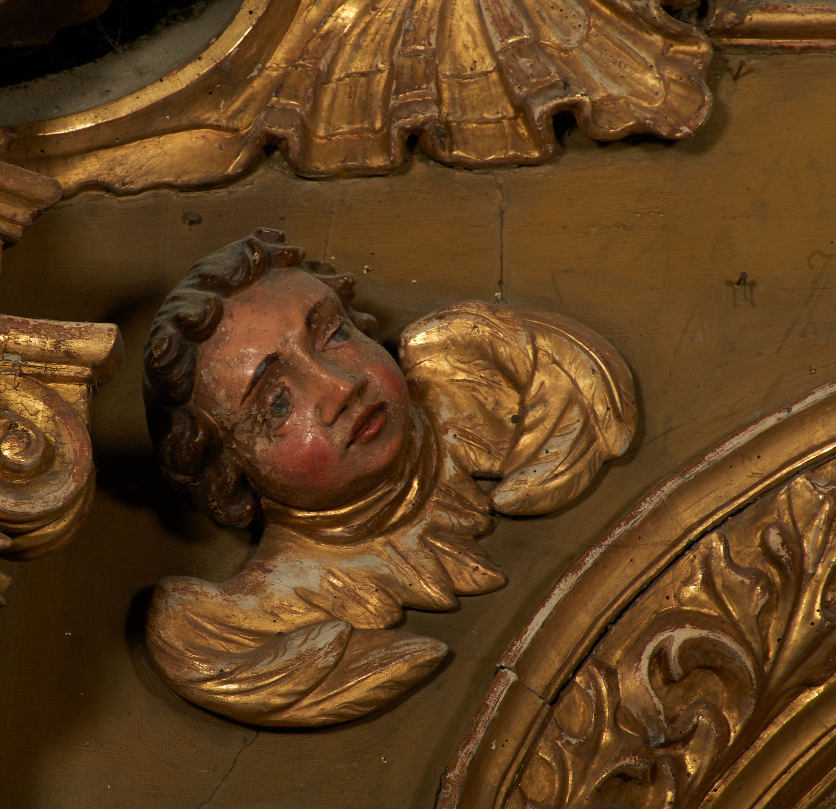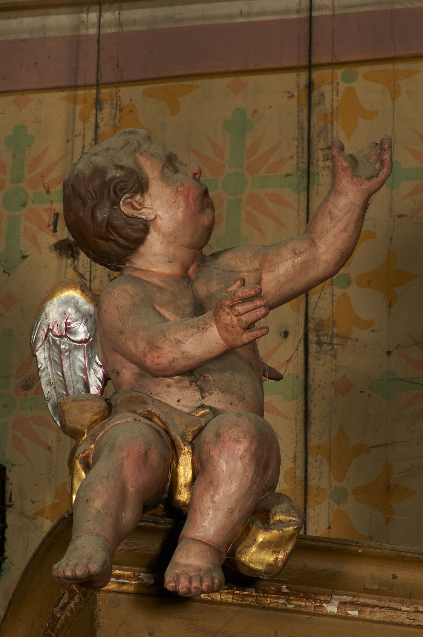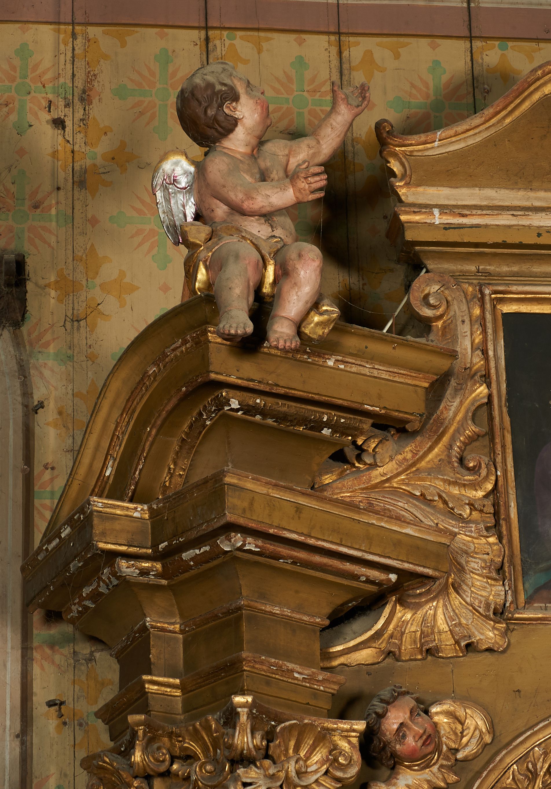 Liczne ubytki w partiach polichromii i złoceń, silne zabrudzenia.