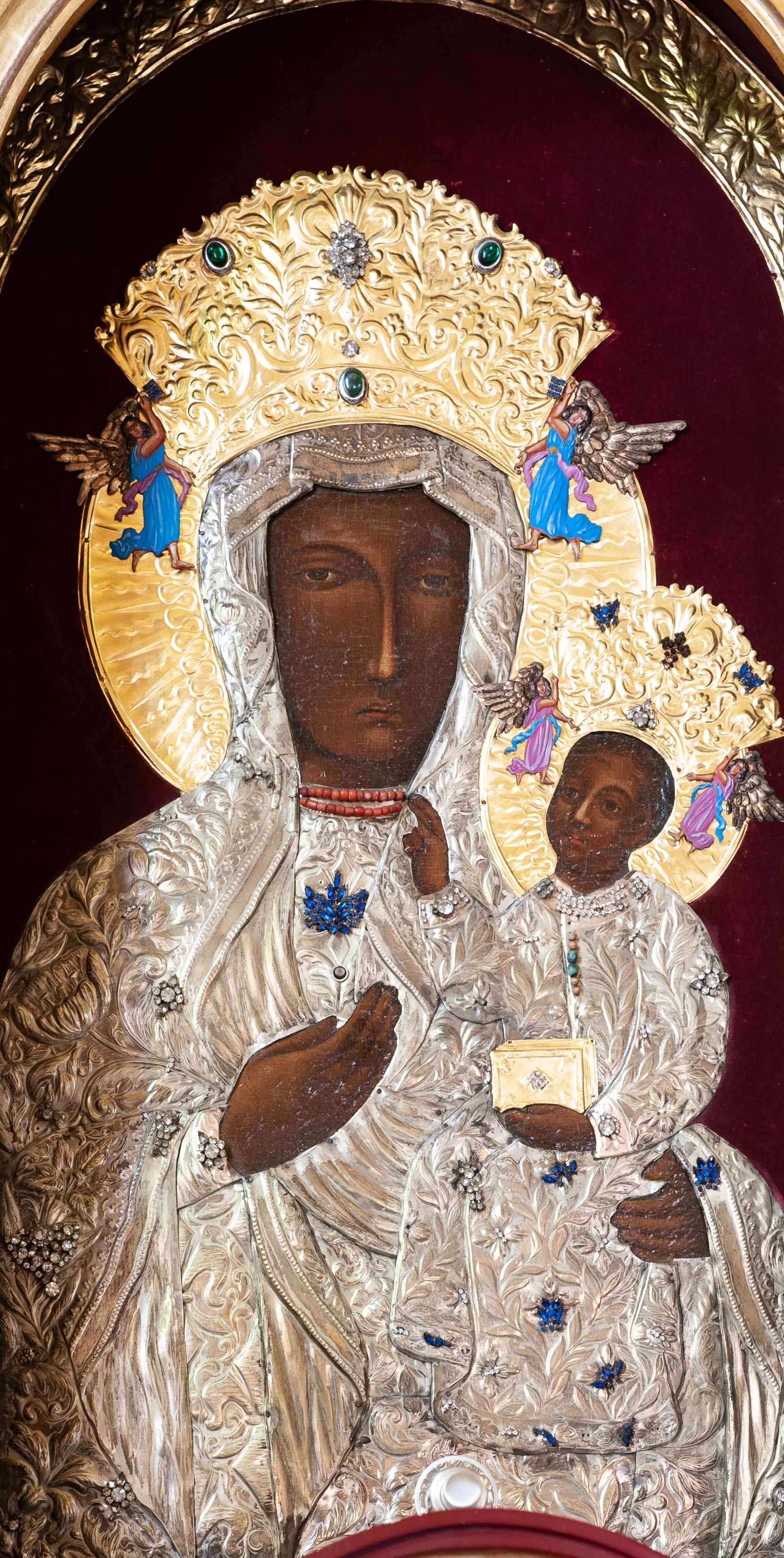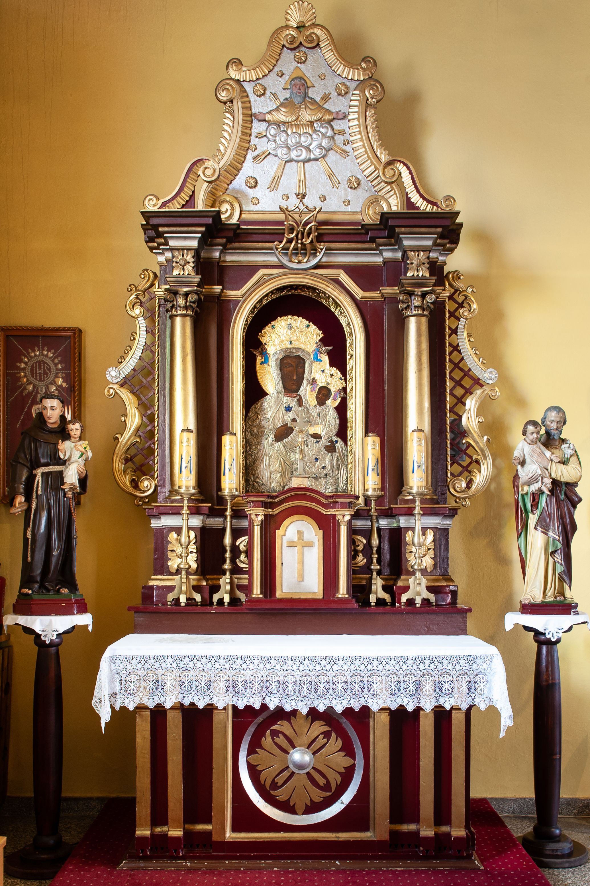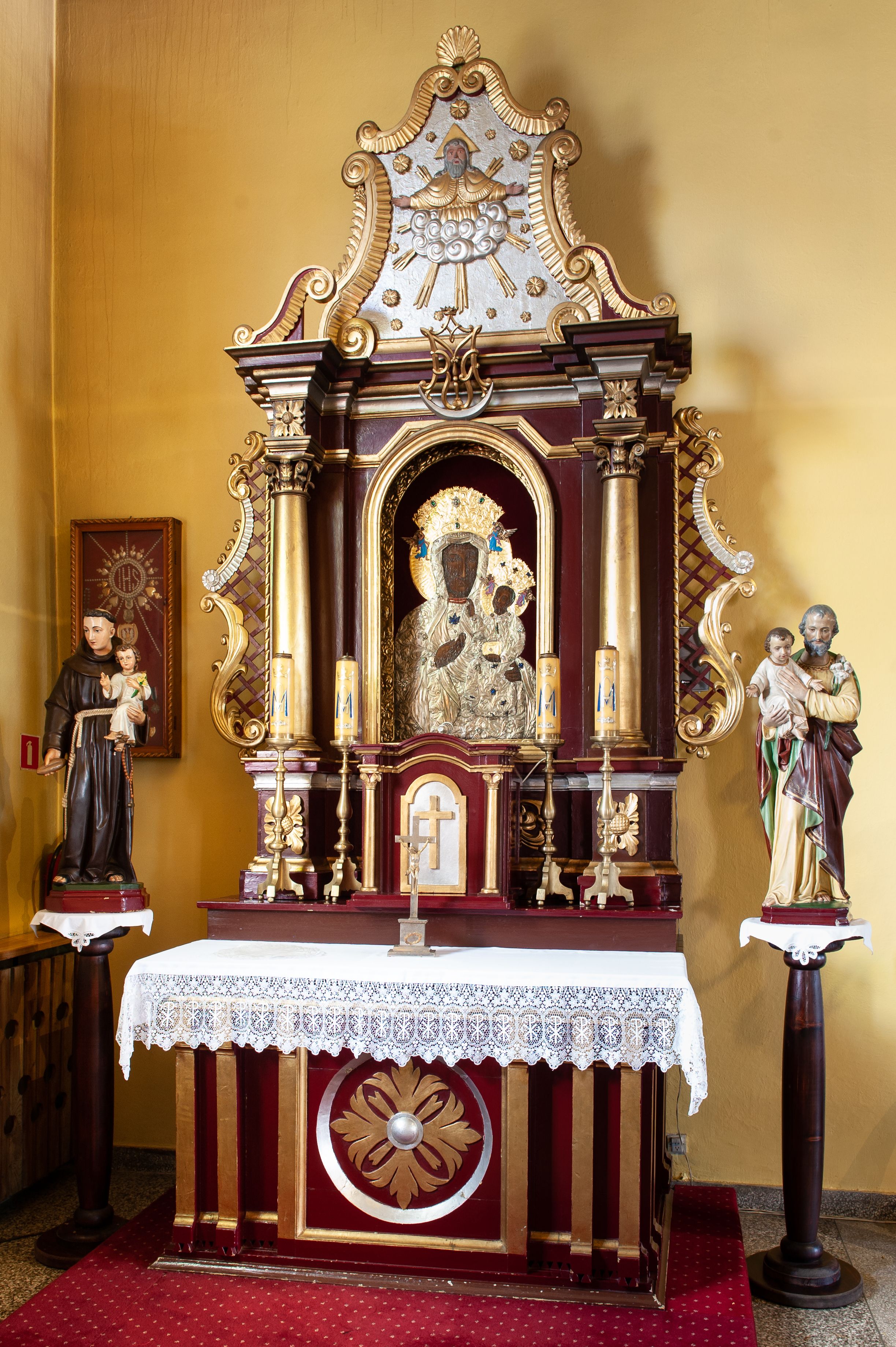 Nastawa architektoniczna, jednoosiowa, jednokondygnacyjna ze zwieńczeniem, ustawiona na cokole z wyodrębnionymi prostopadłościanami. Ołtarz drewniany, prostopadłościenny, z drewnianą mensą. Antepedium flankowane dwiema parami pilastrów, z wyodrębnioną kwadratową płyciną z medalionem z rozetą, ujęte parą pilastrów. Cokół dekorowany rozetami i akantem. Nastawa flankowana dwiema kolumnami o kapitelach kompozytowych, dźwigających pełne belkowanie wyłamane na ich osi oraz częściowo przerwane nad polem środkowym, z rozetami w partii fryzu oraz fragmenty przerwanego, wolutowego przyczółka. W polu głównym wnęka w formie stojącego prostokąta zamkniętego łukiem półkolistym, ujęta profilowaną ramą, z obrazem Matki Boskiej Częstochowskiej. Nad obrazem monogram Marii na sierpie księżyca. Kondygnacja ujęta uszami utworzonymi z akantu, kratki regencyjnej i karbowanej wstęgi. Zwieńczenie w formie zbliżonej do trapezu, zamkniętego dwiema stykającymi się wolutami z muszlą, ujętego spływami wolutowymi, całość obwiedziona karbowaną wstęgą. W polu płaskorzeźbione przedstawienie półpostaci Boga Ojca pośród obłoków, w glorii promienistej, w otoczeniu z gwiazd. Struktura polichromowana w kolorze ciemnoczerwonym, ze złoconymi kolumnami, profilami i ornamentyką oraz srebrzonym polem zwieńczenia i detalami.