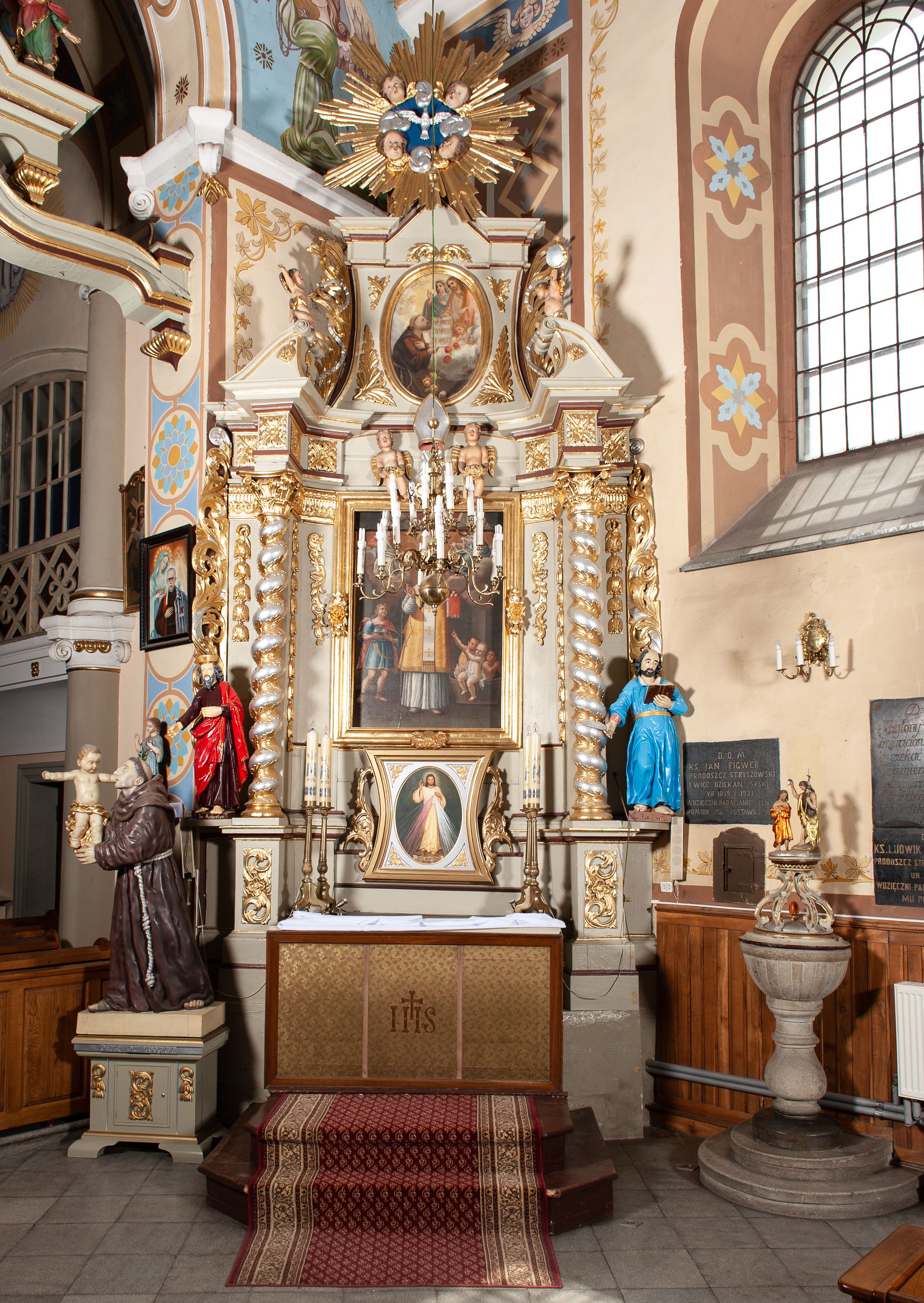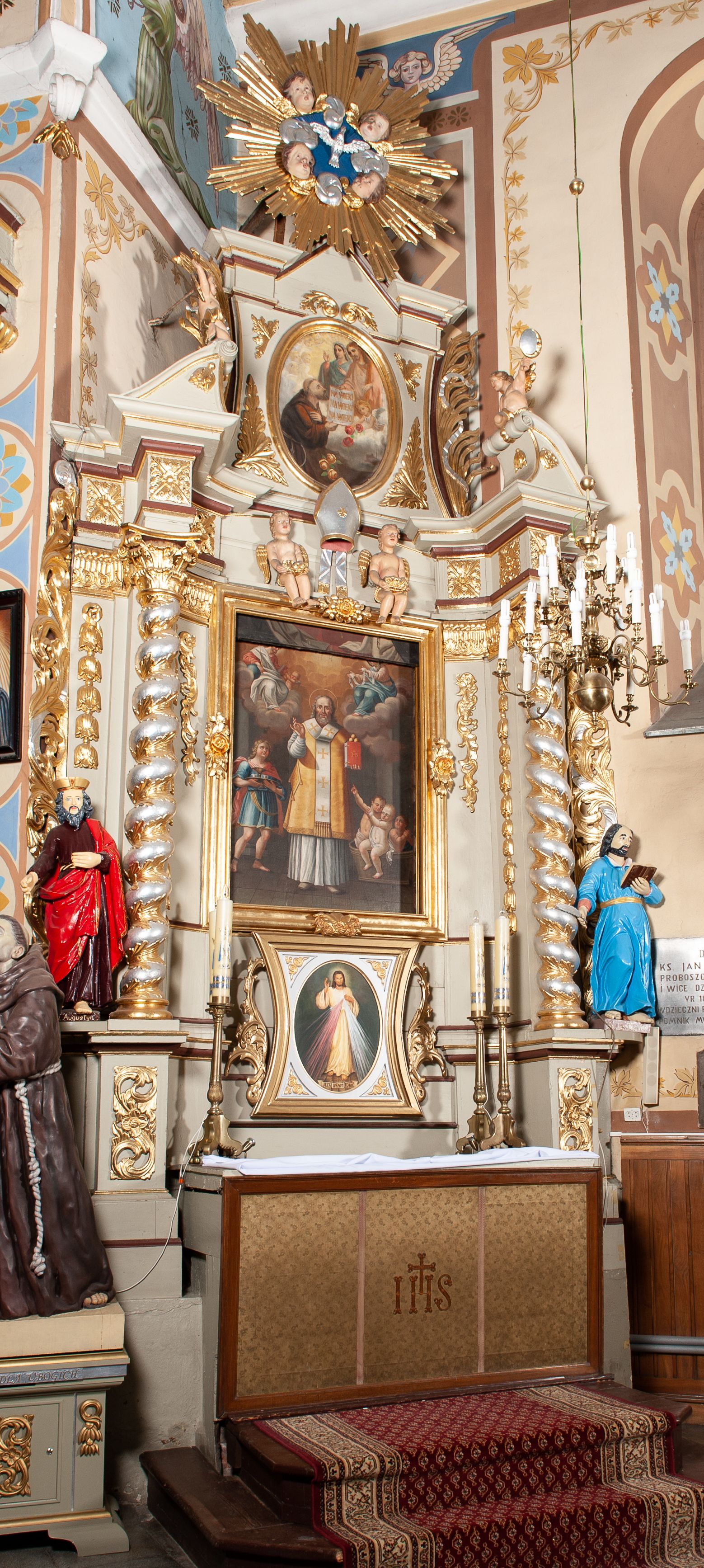 Nastawa architektoniczna, jednoosiowa, jednokondygnacyjna ze zwieńczeniem, ustawiona na cokole z wyodrębnionymi po bokach dwoma postumentami. Ołtarz prostopadłościenny z drewnianą mensą, z portatylem. Antepedium z kwiecistej tkaniny, z wyhaftowanym monogramem IHS w centrum, ujęte profilowaną ramą. Nastawa flankowana parą kolumn o skręconych trzonach i kapitelach kompozytowych stojących na tle dwóch par pilastrów o trzonach dekorowanych kampanulami. Podpory dźwigają pełne belkowanie, wyłamane na ich osi, przerwane nad polem środkowym, z fryzem dekorowanym rozetami oraz fragmenty przerwanego, falistego przyczółka ozdobionego kampanulami z parą puttów. Po zewnętrznej stronie kolumn, na wspornikach stoją figury św. Augustyna i św. Jana Kantego. W polu środkowym nisza w formie stojącego prostokąta z obrazem św. Mikołaja w profilowanej ramie. Nad polem środkowym dwa putta trzymające kwiaty, pomiędzy nimi infuła. Nastawa flankowana uszami utworzonymi z akantu przeplatanego wstęgą regencyjną. Zwieńczenie w formie pionowego prostokąta, o wklęsłych bokach, zamkniętego odcinkiem gzymsu wyłamanym w łuk ostry, ujęte liśćmi palmowymi z wstęgą. Całość zamknięta medalionem z gołębicą Ducha Świętego wśród obłoków i uskrzydlonych główek anielskich, w glorii promienistej. W polu obraz przedstawiający św. Franciszka przed Jezusem i Marią w formie stojącego owalu, w profilowanej ramie. Pole zwieńczenia wypełnione ornamentem roślinnym. Struktura architektoniczna polichromowana w kolorze jasnozielonym, kolumny, ornamentyka i profile złocone i srebrzone.