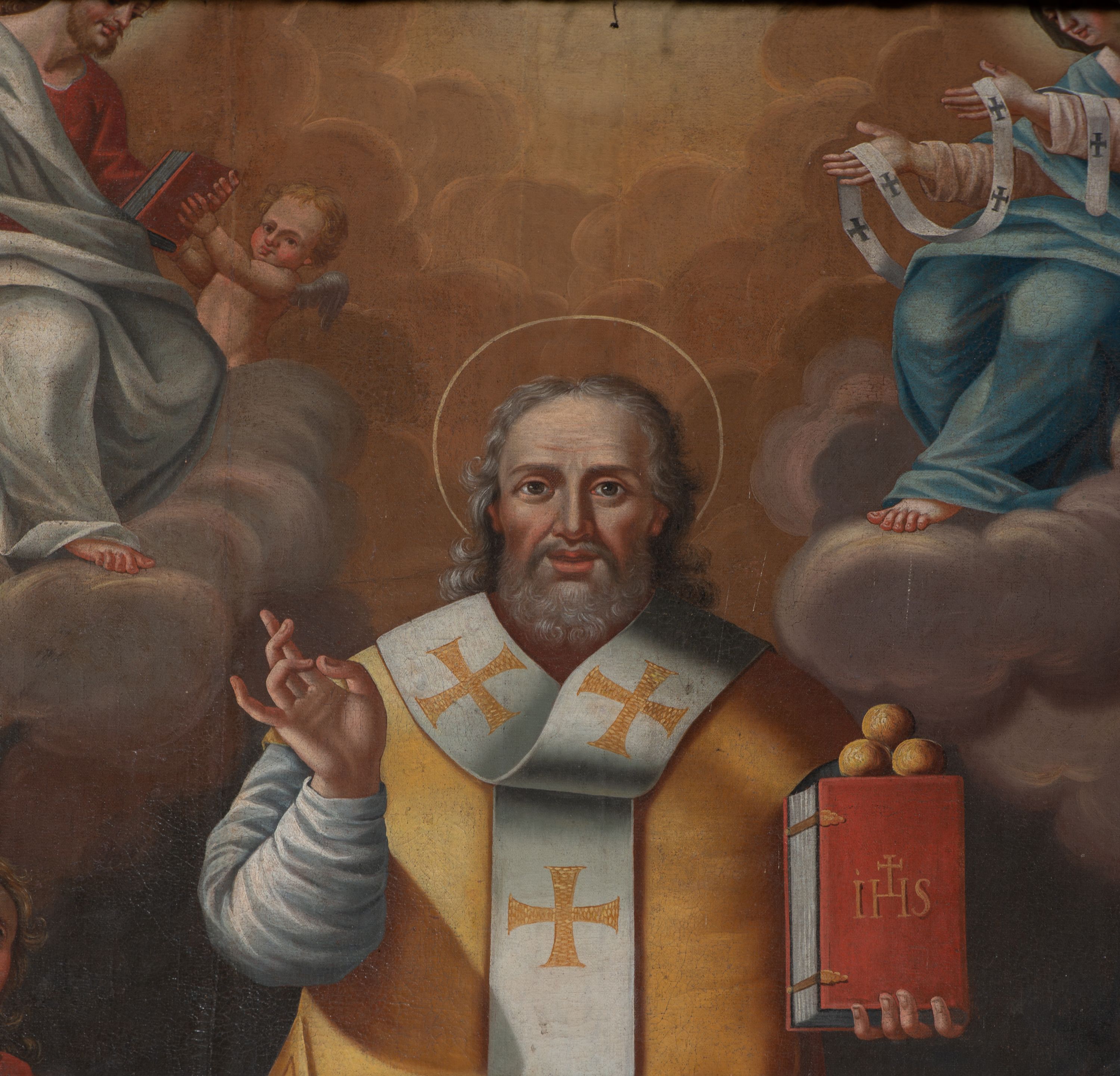 Ołtarz boczny powstał po wybudowaniu nowego kościoła w 1742 roku, ale przed 1745 rokiem, a więc datą konsekracji widniejącą na portatylu sąsiedniego retabulum bocznego. Ołtarz św. Mikołaja został wymieniony w aktach wizytacji z 1748 roku, jako analogiczny do drugiego retabulum bocznego, o prostej strukturze z desek, polichromowany, z portatylem. Jak wskazuje napis na przerwanym przyczółku baldachimu ambony, ołtarz został odnowiony w 1841 roku. W późniejszych latach nastawa została podwyższona, a ołtarz ustawiony na dwóch stopniach. Prawdopodobnie w XX wieku wtórnie umieszczono w ołtarzu figury św. Augustyna i św. Jana Kantego.